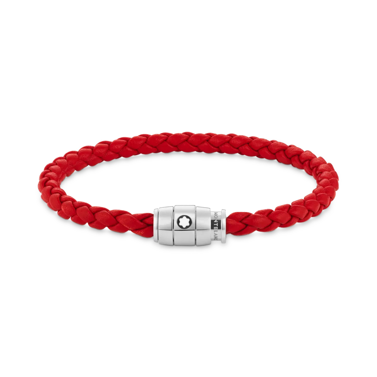 Il gioiello, intrecciato in pelle rossa, ha una chiusura in acciaio inossidabile lucido con un anello in acciaio con l’emblema Montblanc.