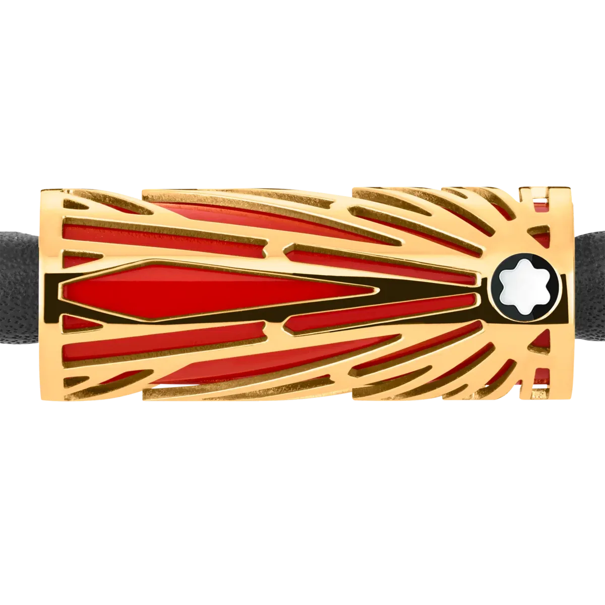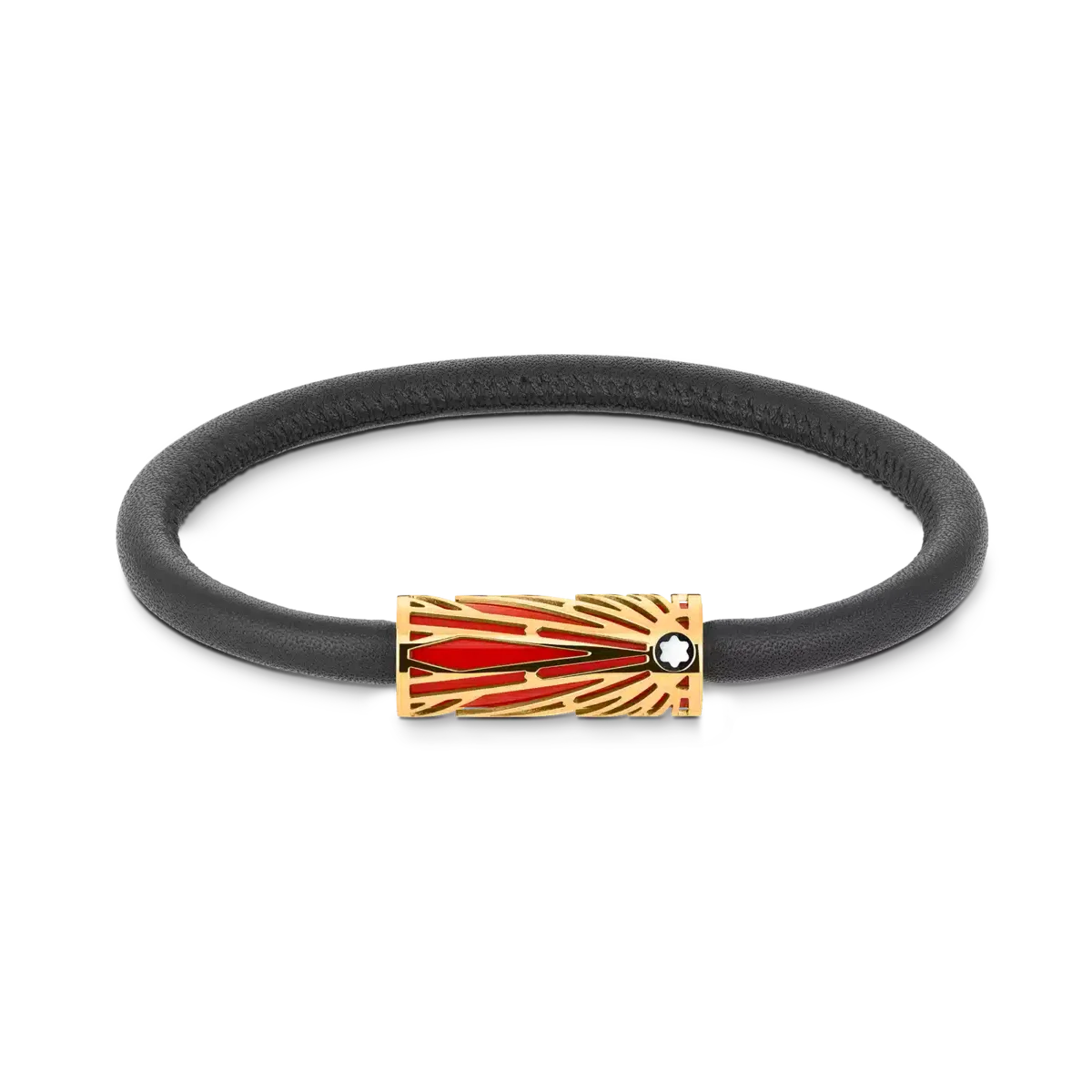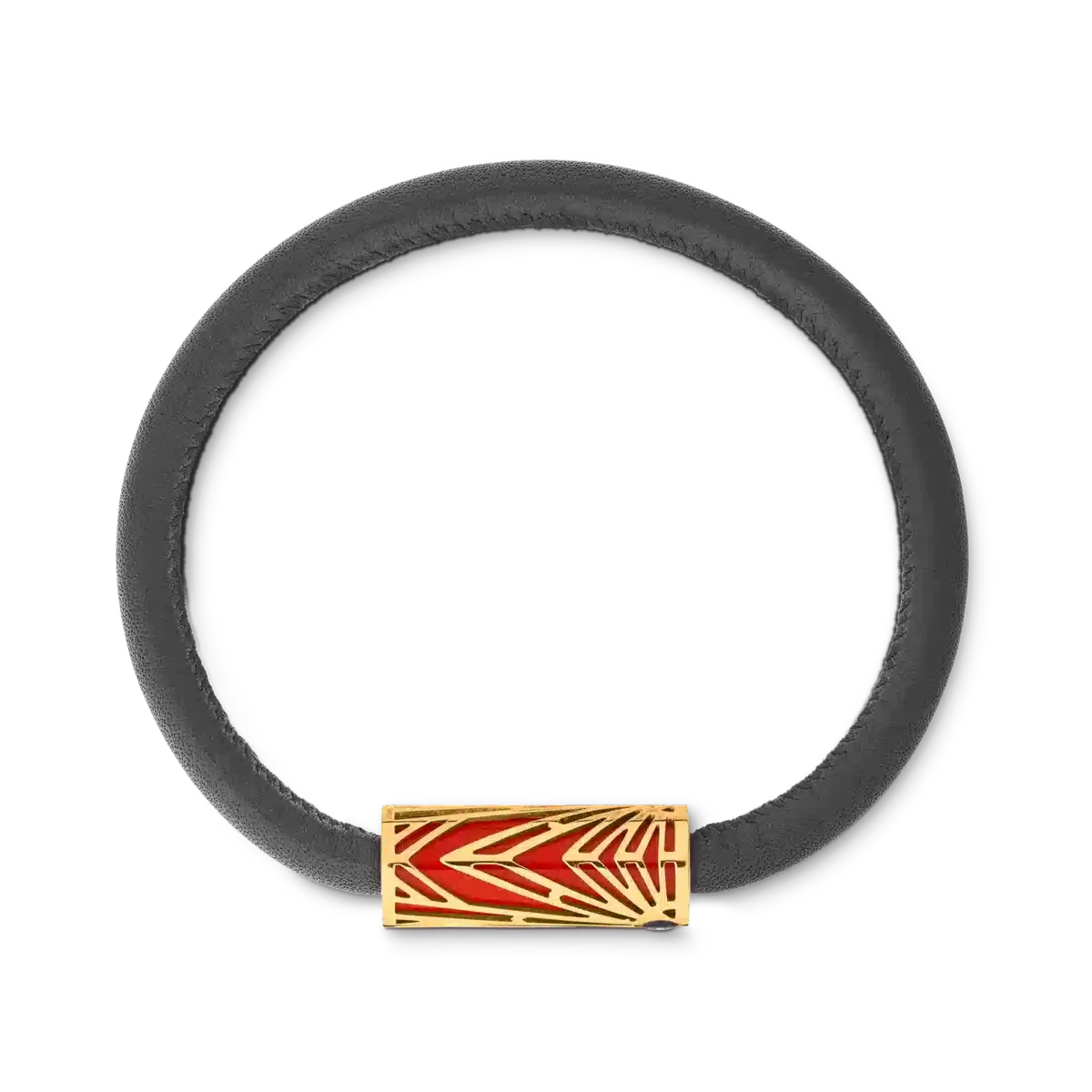 Il gioiello presenta un bracciale in pelle nera e un tubo in acciaio inossidabile con rivestimento in PVD e lacca color corallo (misura 63). Si ispira al motivo Solitaire d’archivio.
