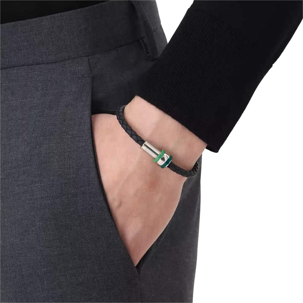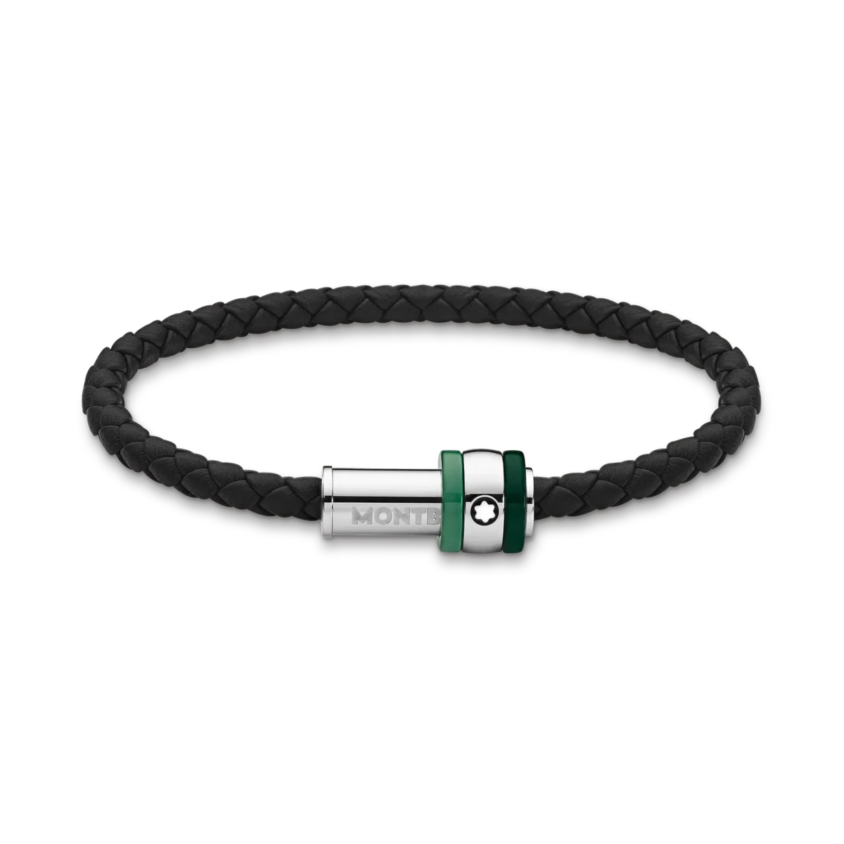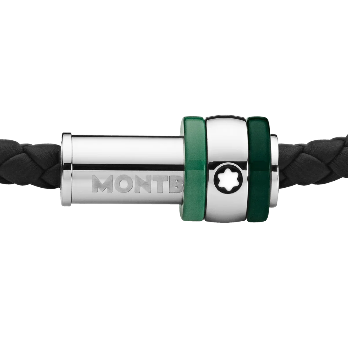 Il gioiello, intrecciato in pelle nera, presenta una chiusura in acciaio inossidabile lucido con un anello in acciaio con emblema Montblanc e due anelli in resina di colore verde.