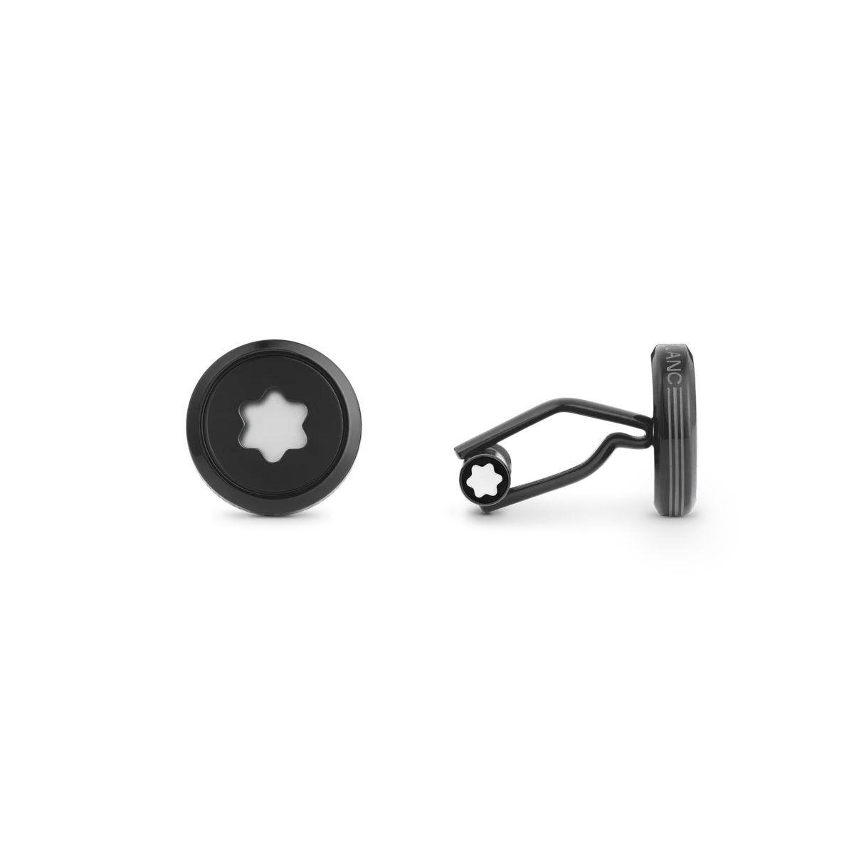 Gemelli in acciaio inossidabile con rivestimento in PVD nero. L’emblema Montblanc è rivestito con lacca fotoluminescente.
