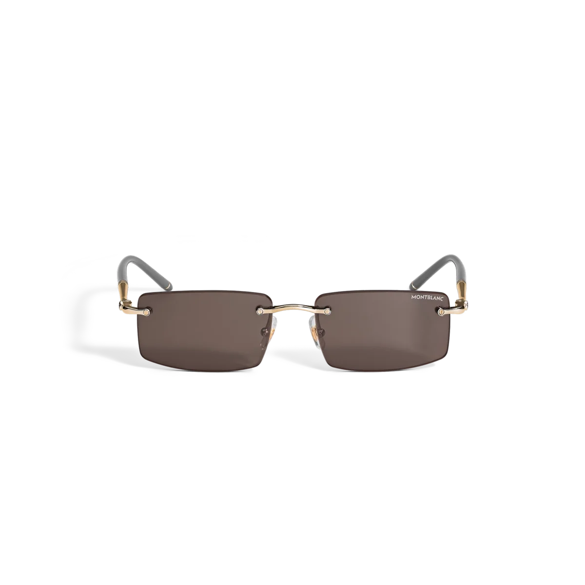Questi occhiali da sole senza montatura in stile squadrato hanno una montatura in metallo color oro e lenti marroni. Le aste tubolari ispirate agli strumenti di scrittura Meisterstück sono impreziosite da un dettaglio a 3 anelli. Il logo Montblanc è inciso al laser sulla lente sinistra e un dettaglio in smalto nero è incapsulato sulle estremità delle aste.
