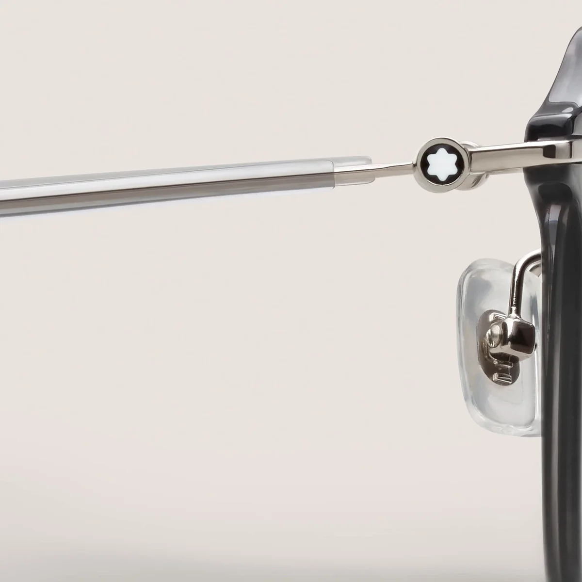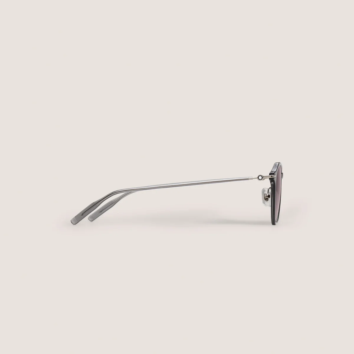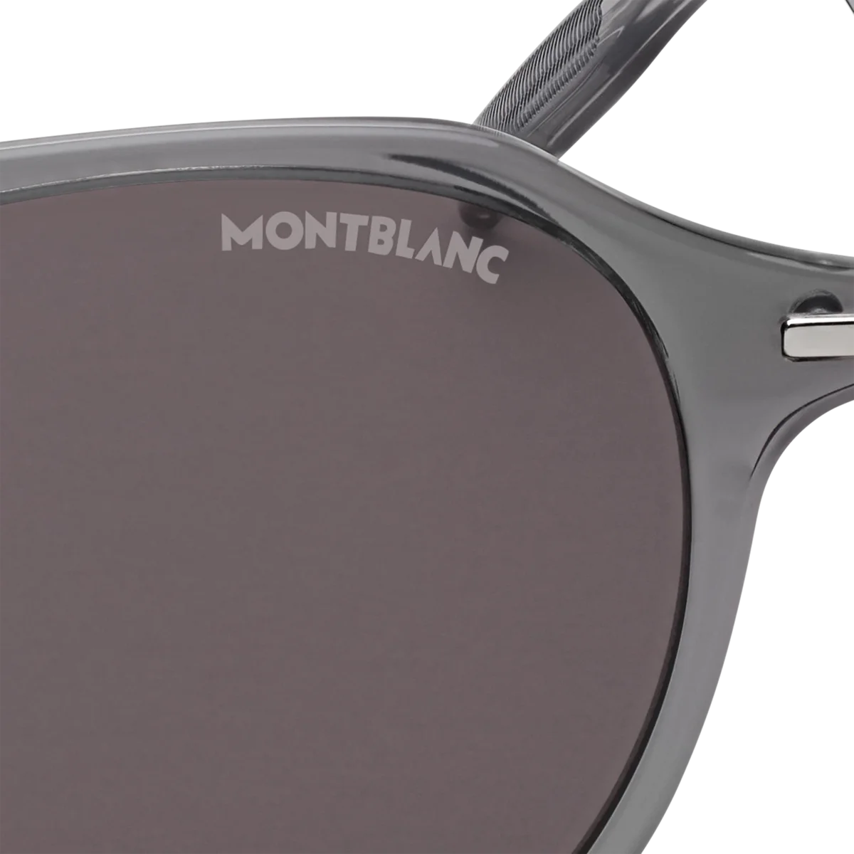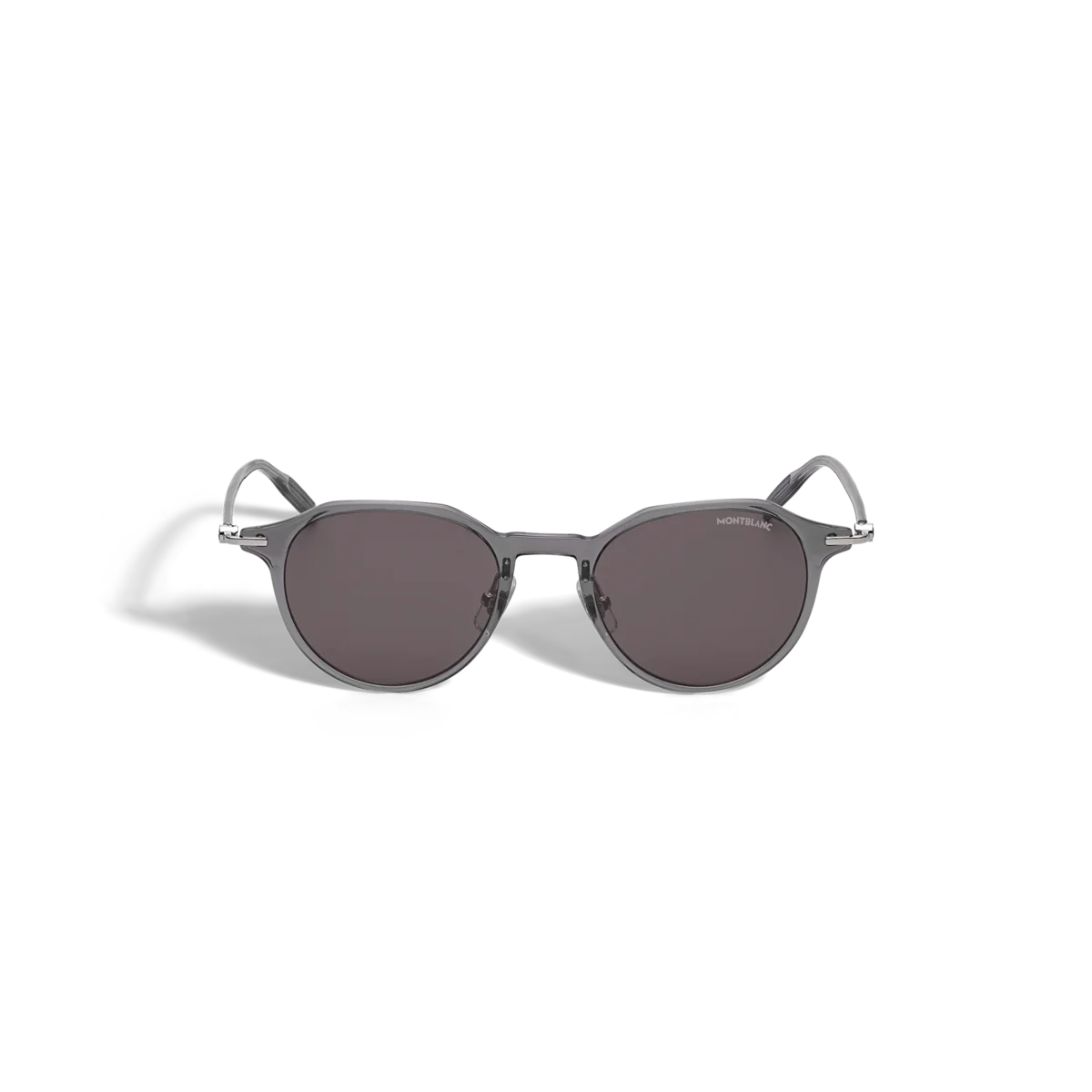 Questi occhiali da sole dal design rotondo hanno una montatura iniettata di colore grigio e lenti grigie. L’emblema Montblanc con cappuccio innevato è incapsulato nel design delle aste in metallo. Il logo Montblanc è inciso al laser sulla lente sinistra e il motivo antiscivolo è inciso al laser sul lato interno dei terminali trasparenti delle aste per aumentare il comfort.