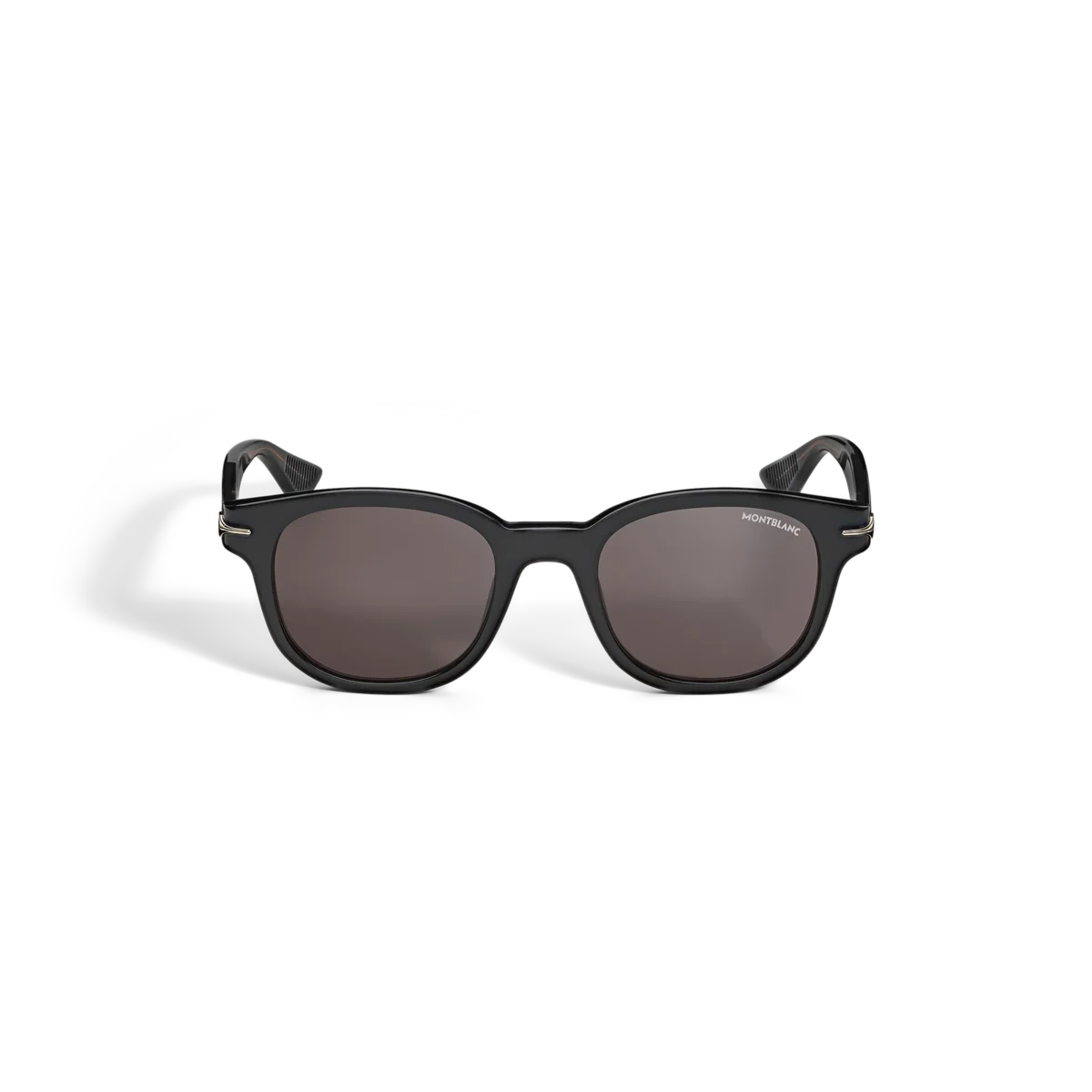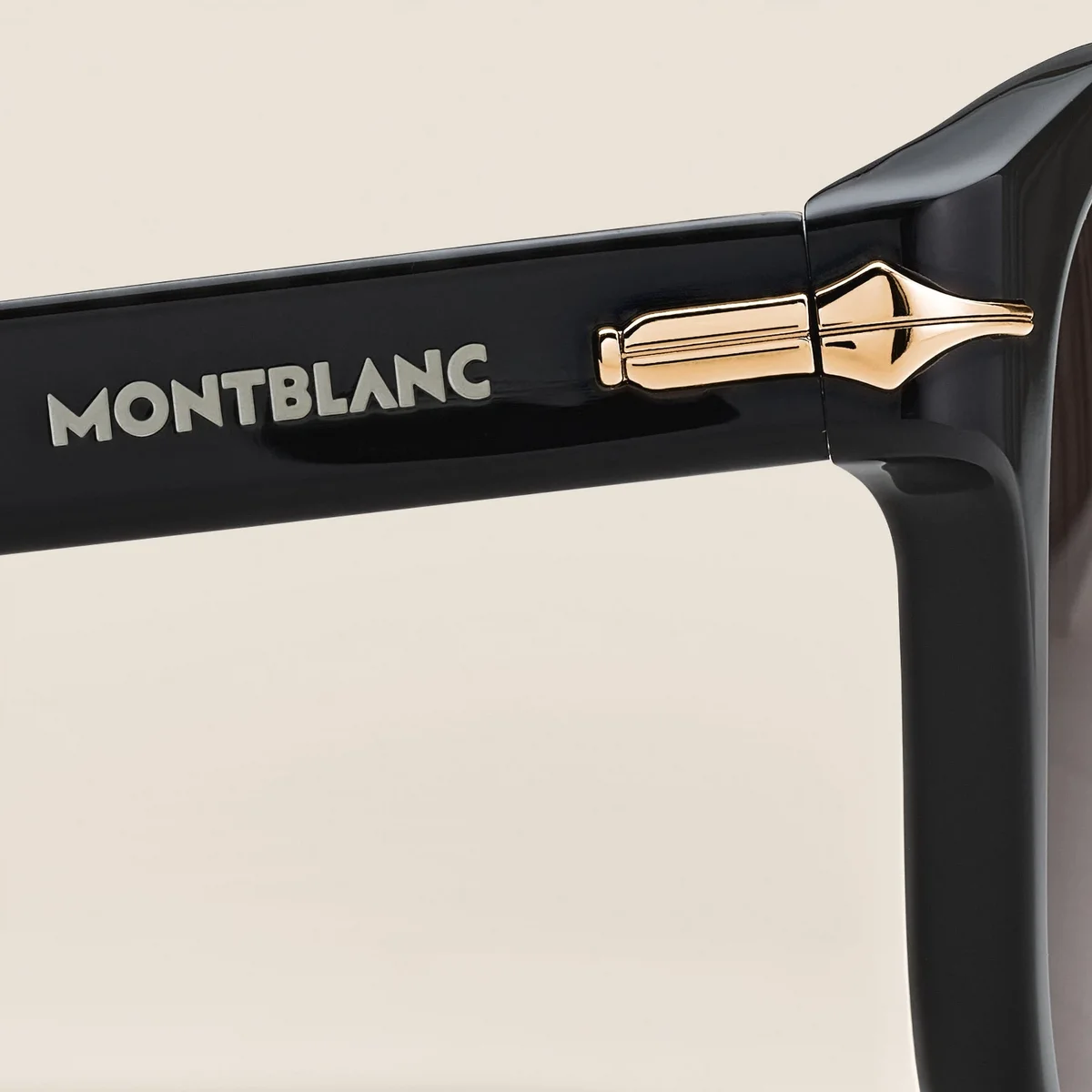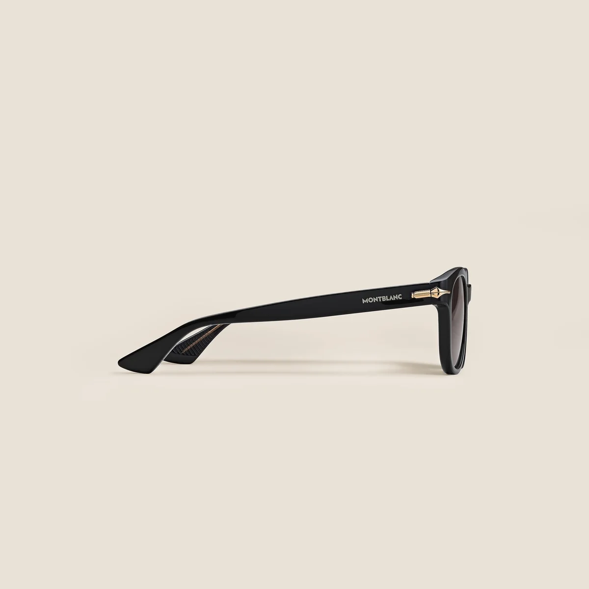 Questi occhiali da sole dal design rotondo hanno una montatura in acetato nero e lenti grigie. Ispirati al design del pennino degli strumenti di scrittura, presentano un dettaglio decorativo sul braccio. Il logo Montblanc one line è inciso sul lato destro del braccio, mentre il logo è inciso al laser sulla lente sinistra.