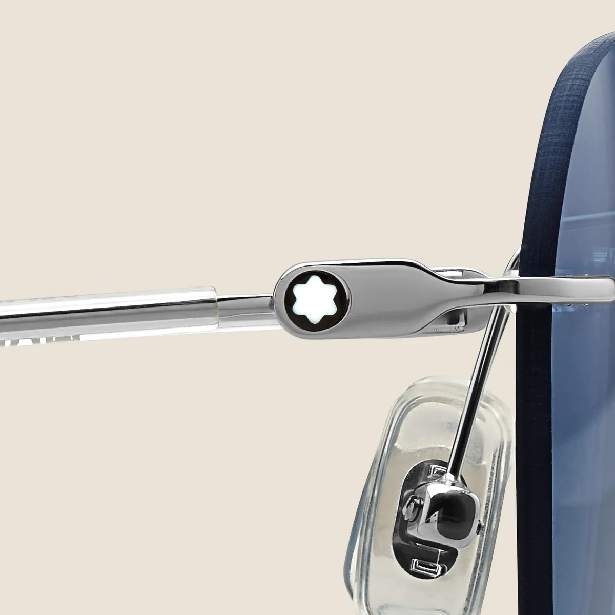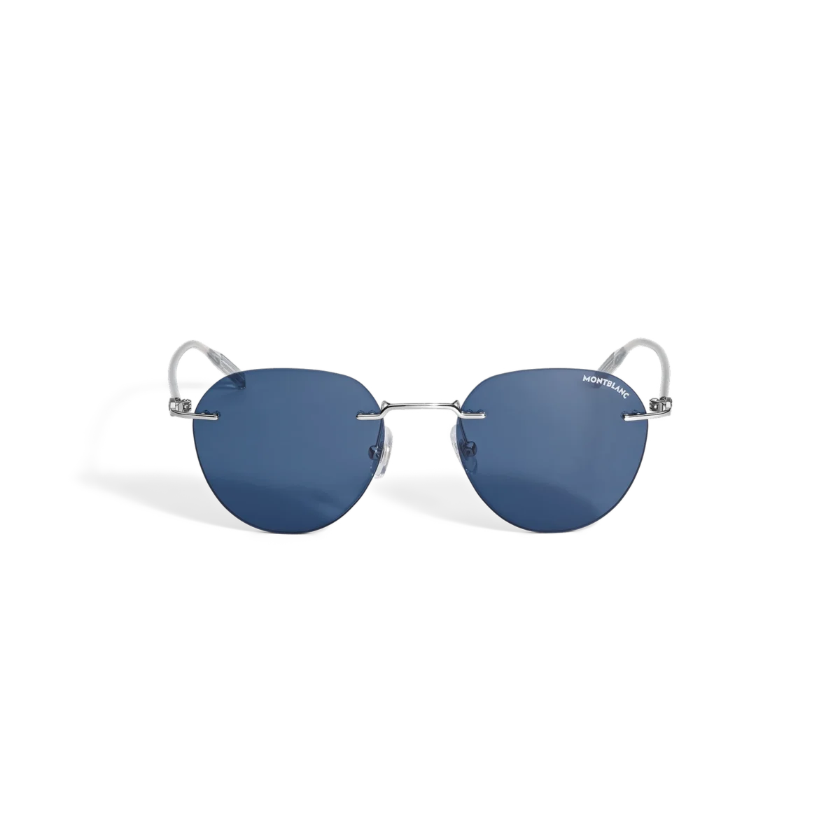 Questi occhiali da sole senza montatura in stile rotondo hanno una montatura in metallo color argento e lenti blu. L’emblema Montblanc è incapsulato nel design delle aste. Il logo Montblanc è inciso al laser sulla lente sinistra degli occhiali da sole.