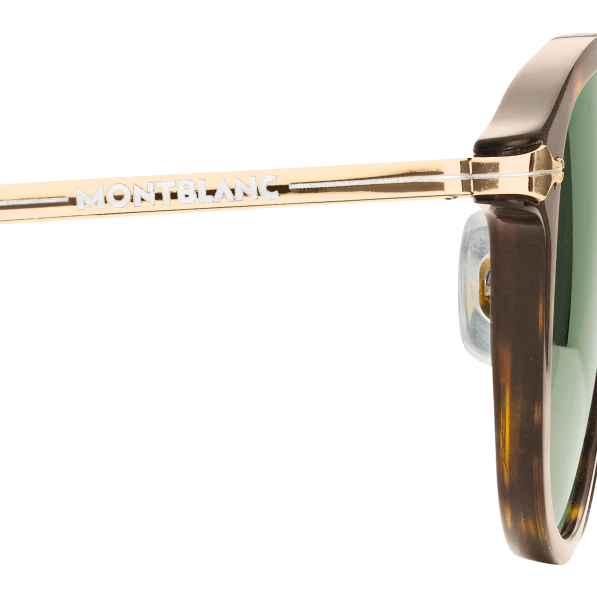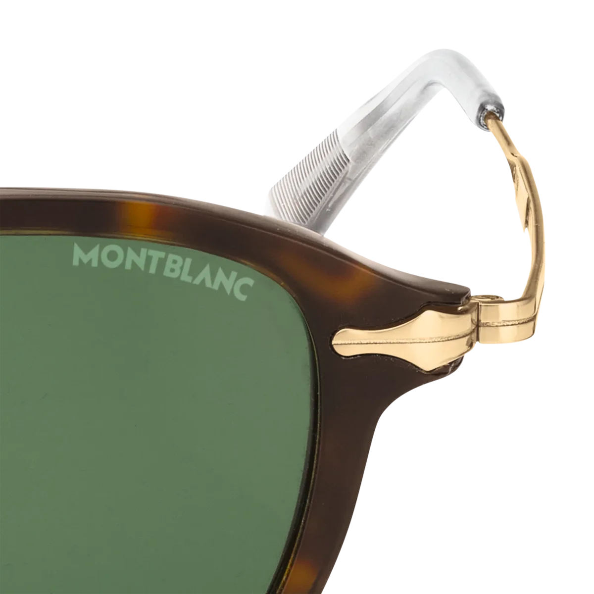 Questi occhiali da sole rotondi presentano una montatura iniettata color Havana e lenti verdi. Ispirati al design del pennino degli strumenti di scrittura, presentano un dettaglio decorativo a forma di pennino sul design delle aste in metallo. Il logo Montblanc è inciso al laser sulla lente sinistra e il motivo antiscivolo è inciso al laser sul lato interno delle punte delle aste per aumentare il comfort.