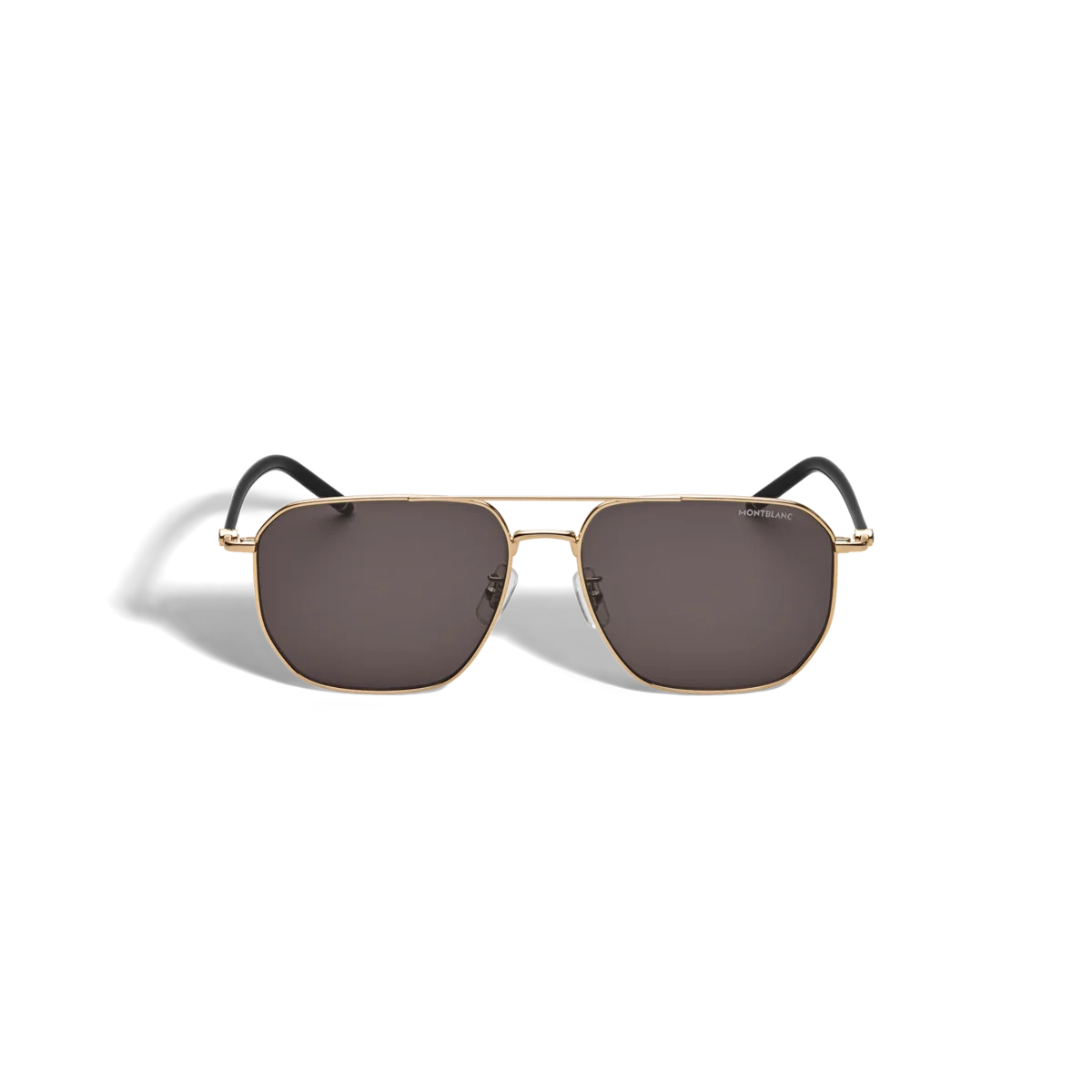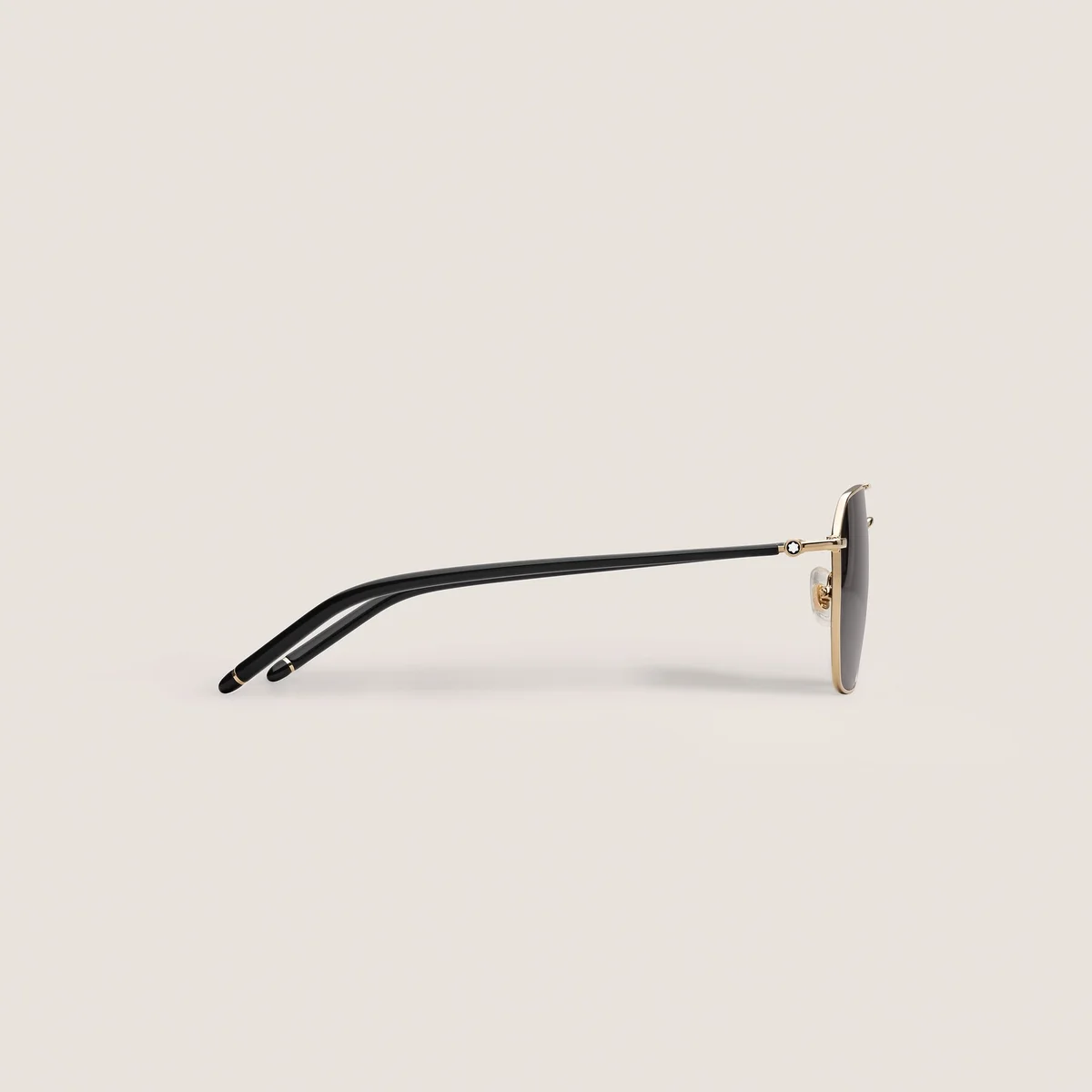 Questi occhiali da sole dal taglio squadrato hanno una montatura in metallo color oro e lenti grigie. Presentano un doppio ponte in metallo sulla parte frontale. Le aste tubolari ispirate agli strumenti da scrittura Meisterstück sono impreziosite da un dettaglio a 3 anelli. Il logo Montblanc è inciso al laser sulla lente sinistra e un dettaglio in smalto nero è incapsulato sulle punte delle aste.