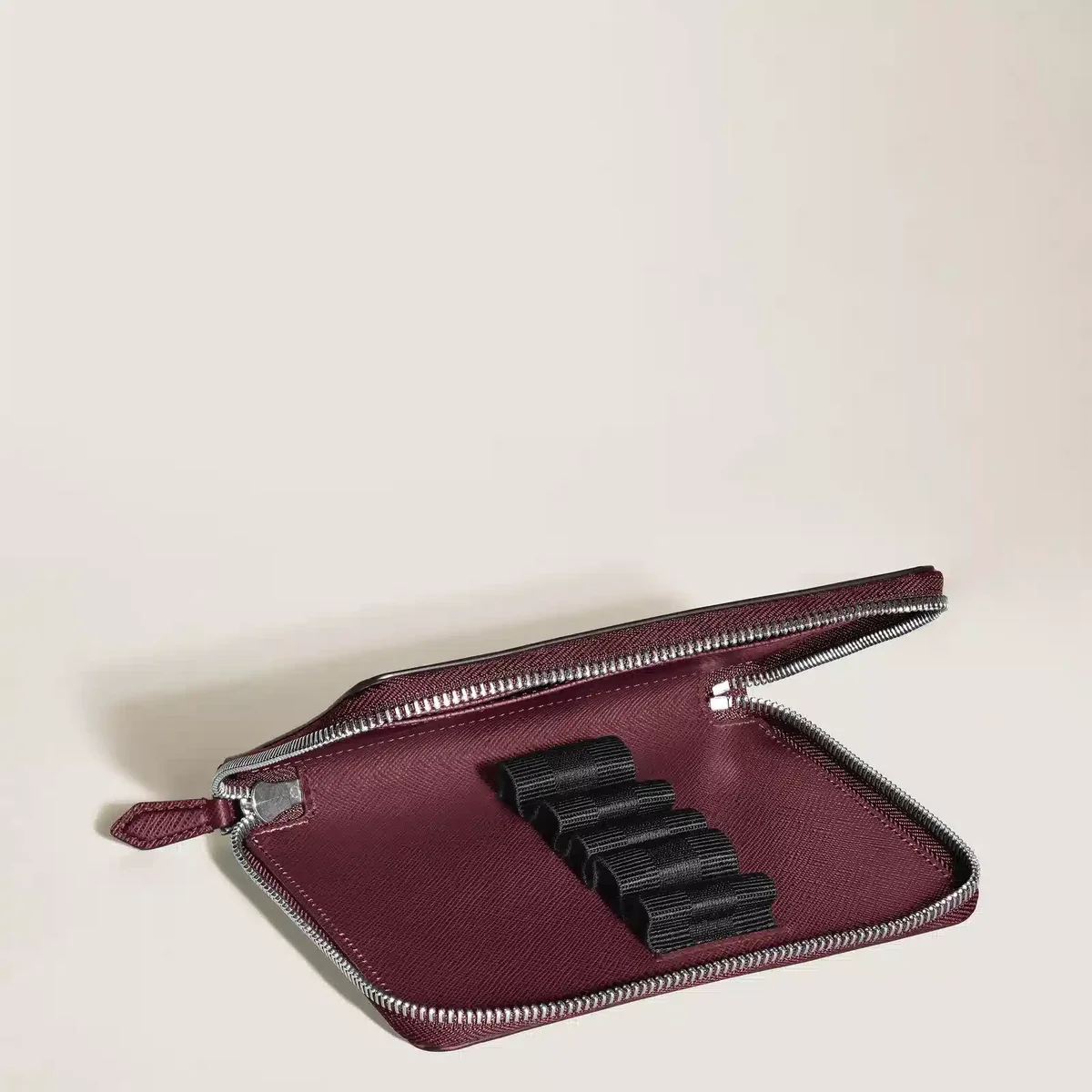 Proteggi con stile i tuoi strumenti di scrittura preferiti con questo grande astuccio per penne Sartorial. Realizzato in raffinata pelle stampata Saffiano color cassis, l’astuccio con cerniera presenta cinque scomparti dedicati per penne delle dimensioni della Meisterstück Classique o della Le Grand. Il tocco finale è dato dall’emblema Montblanc.