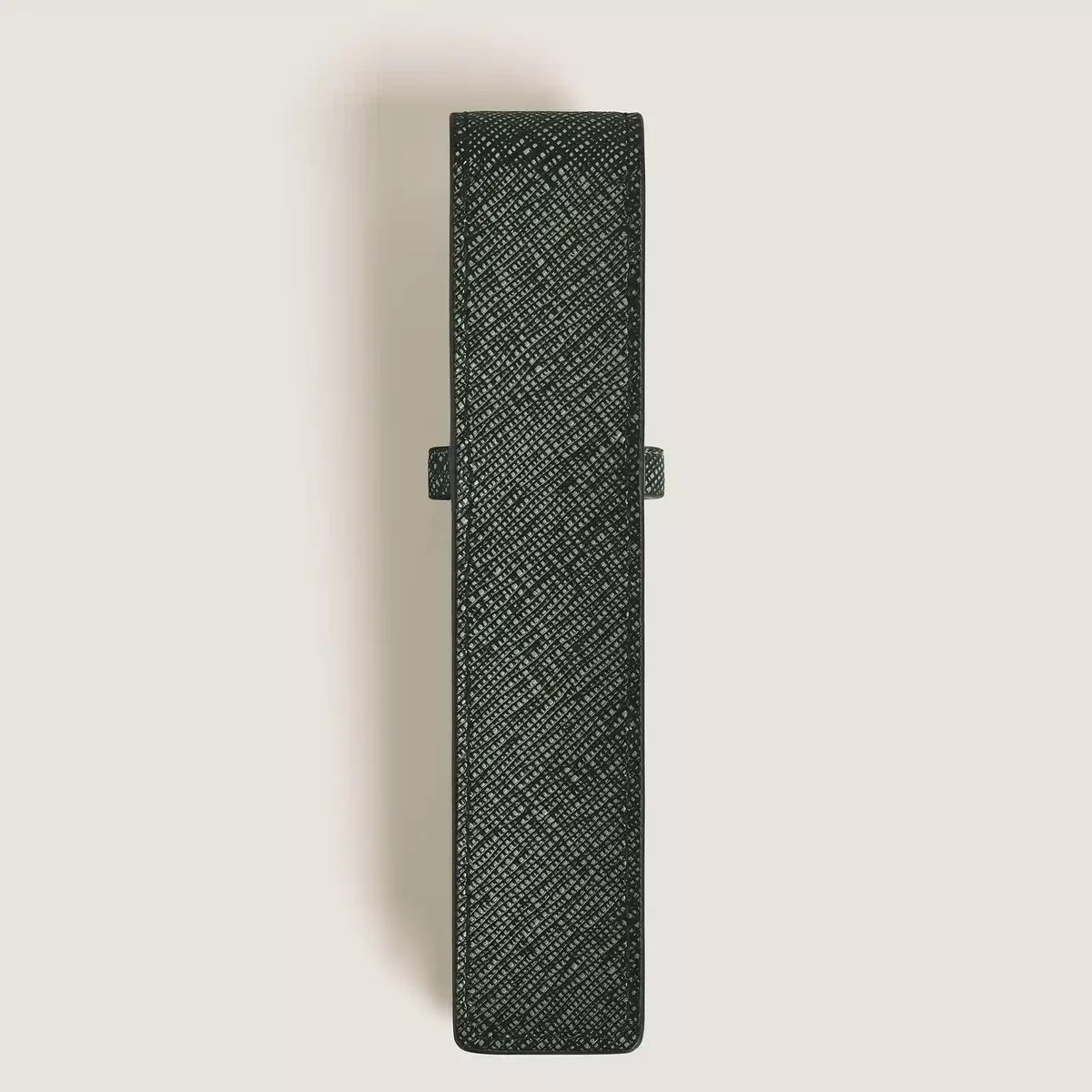 Elegante compagna per il tuo strumento di scrittura più prezioso, questa raffinata custodia per penne è realizzata in pelle sartoriale goffrata in una sofisticata combinazione bicolore di elegante kaki e nero. La sua silhouette sovrapposta si ispira alla forma di una busta, radicandola ancora più profondamente nella cultura della scrittura.