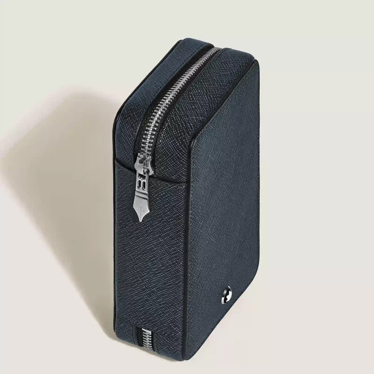Realizzata in pelle sartoriale goffrata bicolore blu e nera, questa custodia per penne è progettata per contenere fino a otto strumenti di scrittura Meisterstück Classique o LeGrand, mantenendoli organizzati e al sicuro. Caratterizzata da un distintivo tiretto in metallo a forma di pennino, rende omaggio alla ricca tradizione di scrittura di Montblanc. Perfetto per i professionisti e gli appassionati di scrittura, combina una raffinata maestria artigianale con una funzionalità pratica.