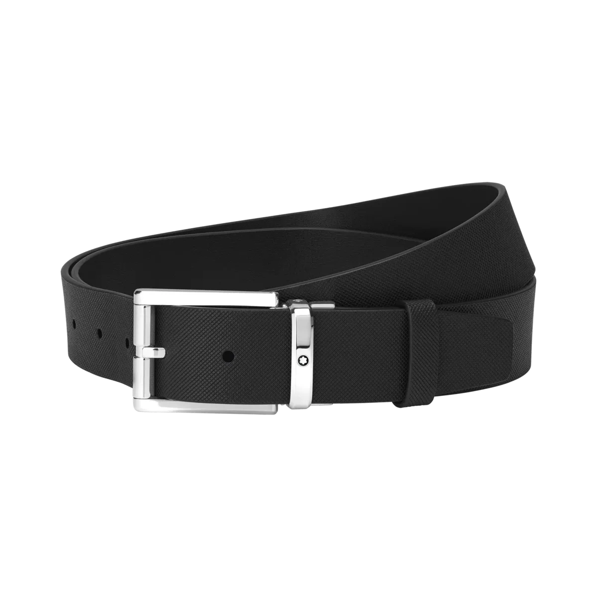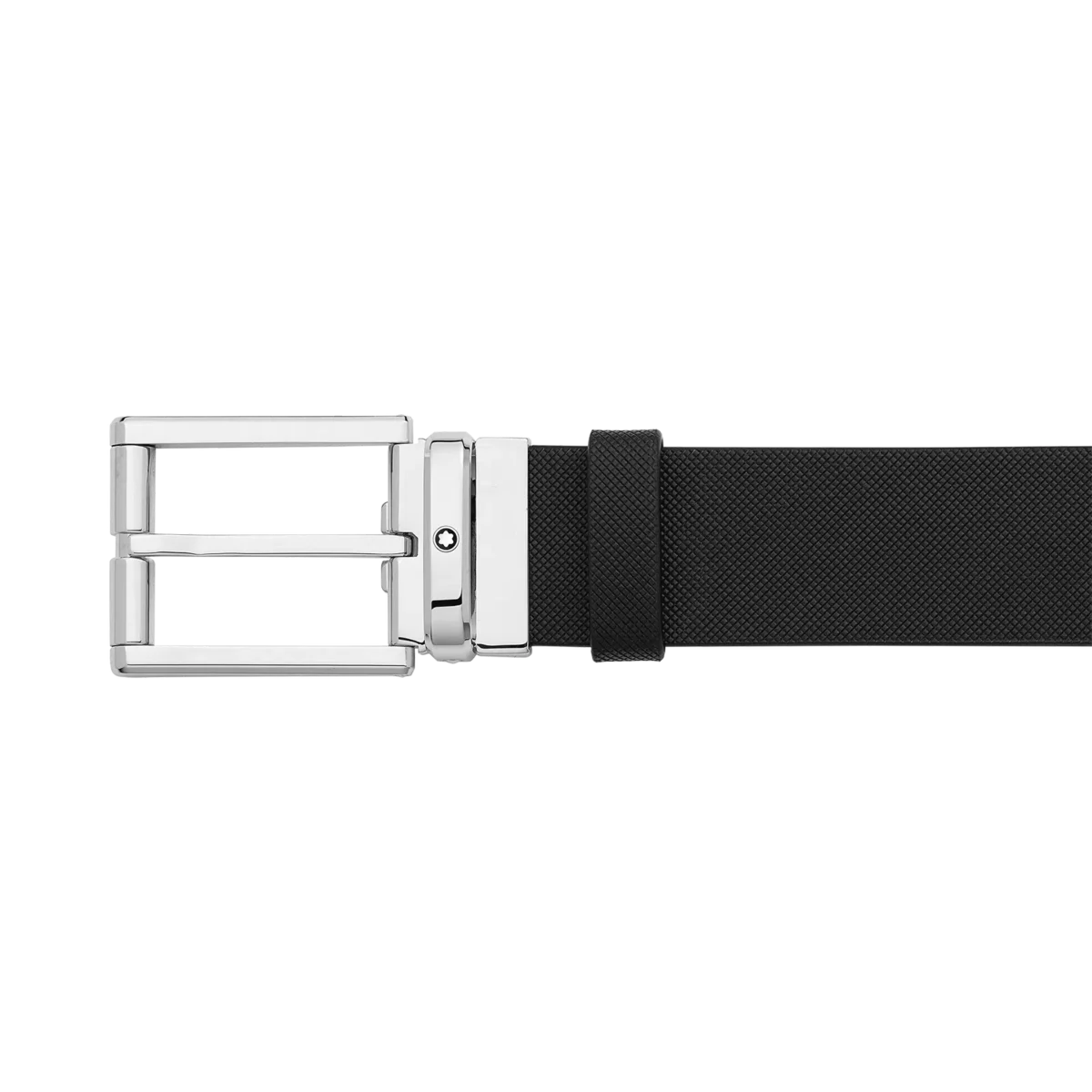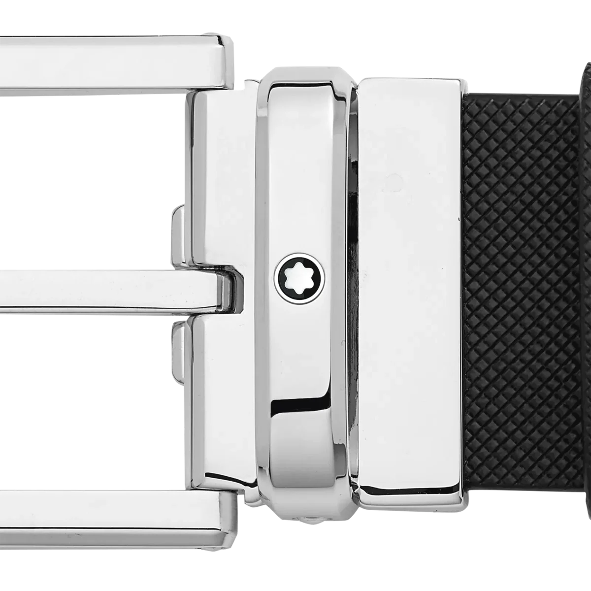 Fibbia lucida rettangolare rivestita in palladio con dettaglio a rullo. Cinturino in pelle stampata nera autoregolabile, 3,5 cm x 120 cm, per un look urbano.