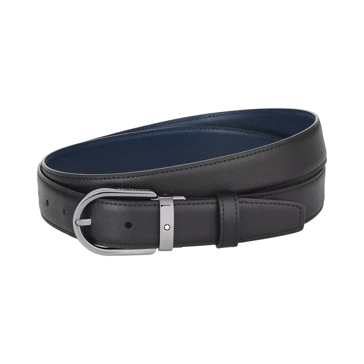 Fibbia a ferro di cavallo con finitura in rutenio lucido. Cintura auto-regolabile, 3 cm x 120 cm, in pelle stampata saffiano reversibile in nero e blu. Concepita per un look classico con un tocco di originalità.