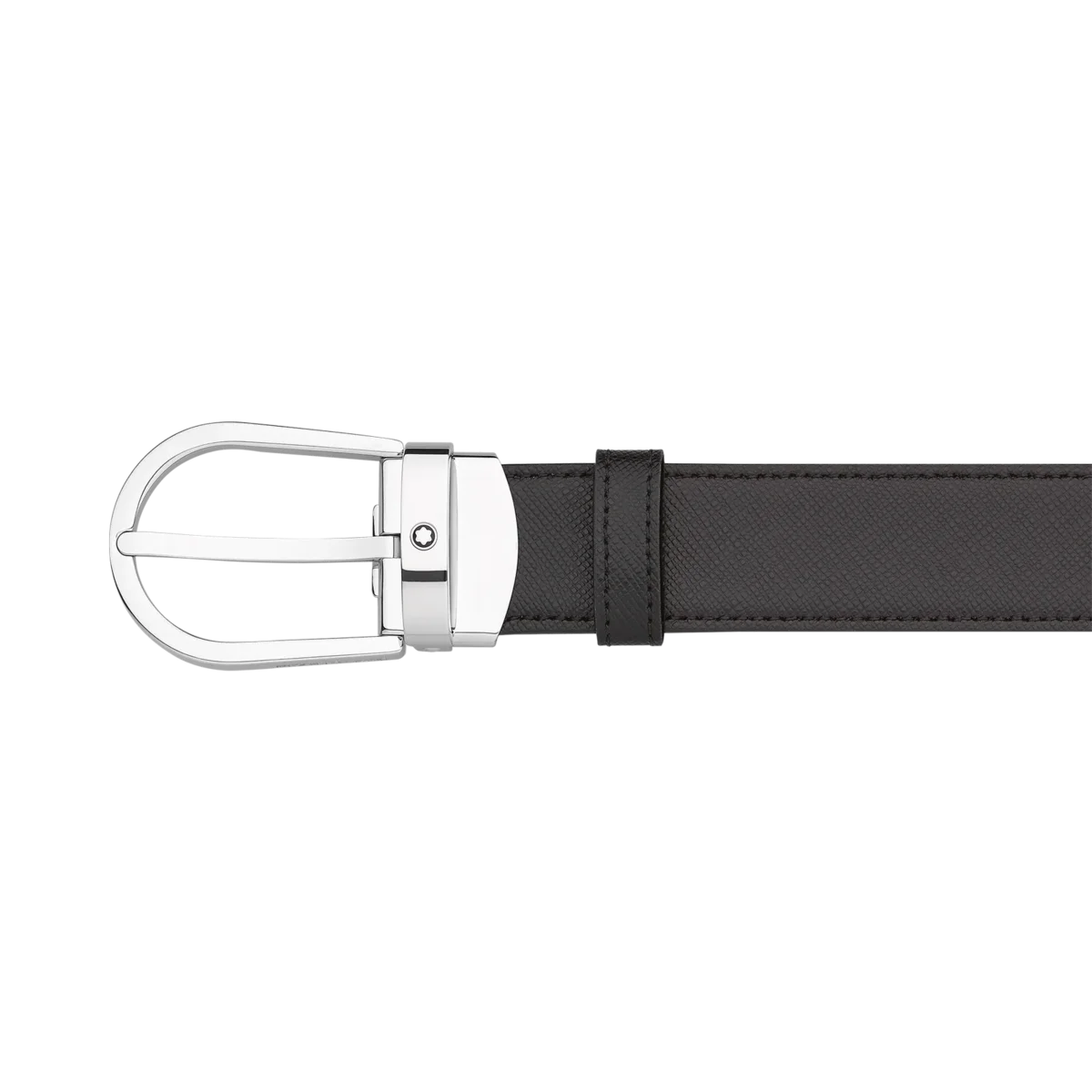 Fibbia a ferro di cavallo in acciaio inossidabile lucido con emblema Montblanc. Cintura in pelle nera e marrone stampata saffiano, autoregolabile, 3 cm x 120 cm, reversibile.