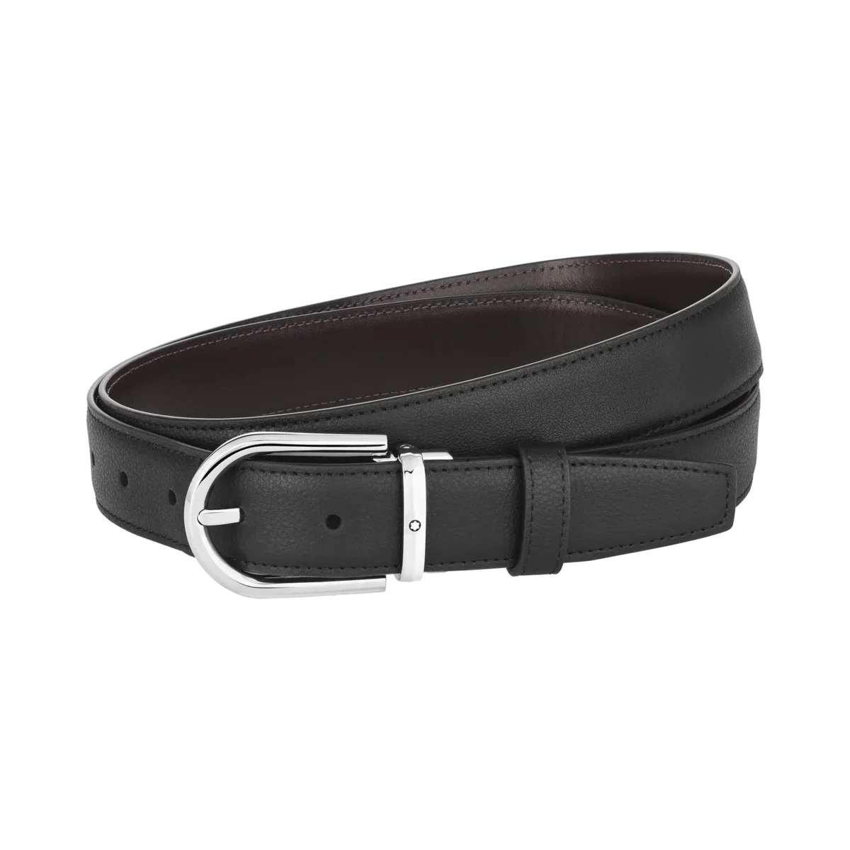 Fibbia a pin con finitura palladio lucido a ferro di cavallo. Cinturino in pelle auto-regolabile, 3 cm x 120 cm, reversibile, di colore marrone liscio da un lato e nero granuloso dall’altro. Raffinato e sobrio, per qualsiasi tipo di look.
