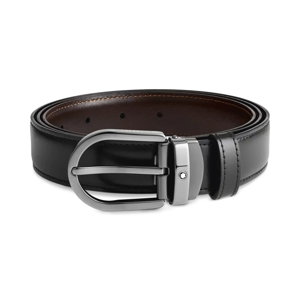 Fibbia a ferro di cavallo con finitura lucida in rutenio. Cinturino in pelle reversibile nero e marrone, autoregolabile, 3 cm x 120 cm. Per un look classico con un tocco di originalità.
