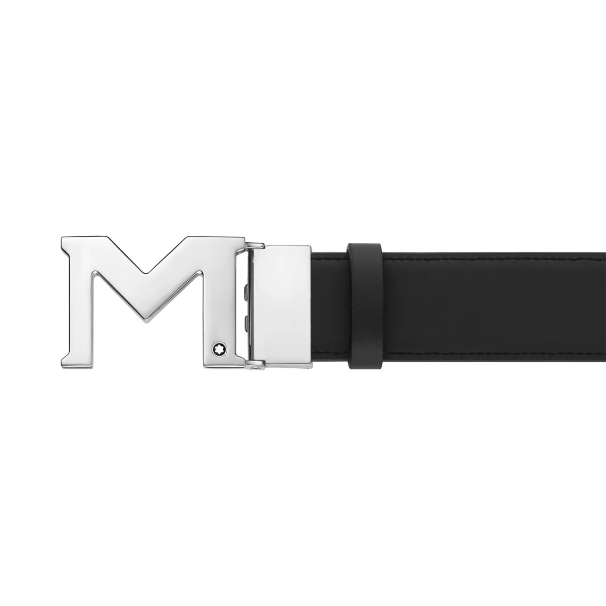 Fibbia M rivestita in palladio. Cintura auto-regolabile, 3,5 cm x 120 cm, reversibile in pelle nera martellata e nera liscia per un look sportivo.