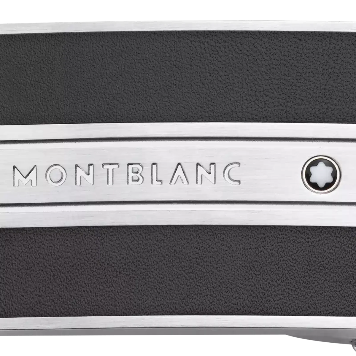 Fibbia rettangolare con finitura palladio opaca con design Meisterstück, marchio Montblanc e emblema Montblanc incisi, 3 cm x 120 cm, cinturino reversibile in pelle nera e marrone. Progettato per un look casual ma elegante.
