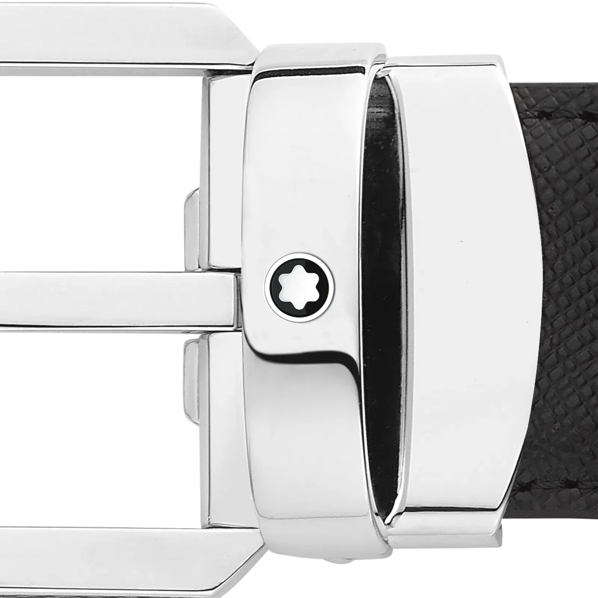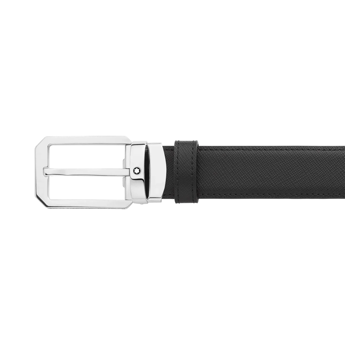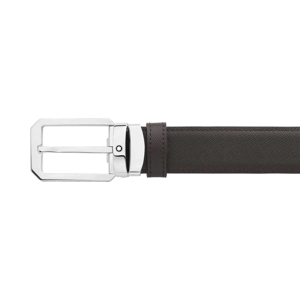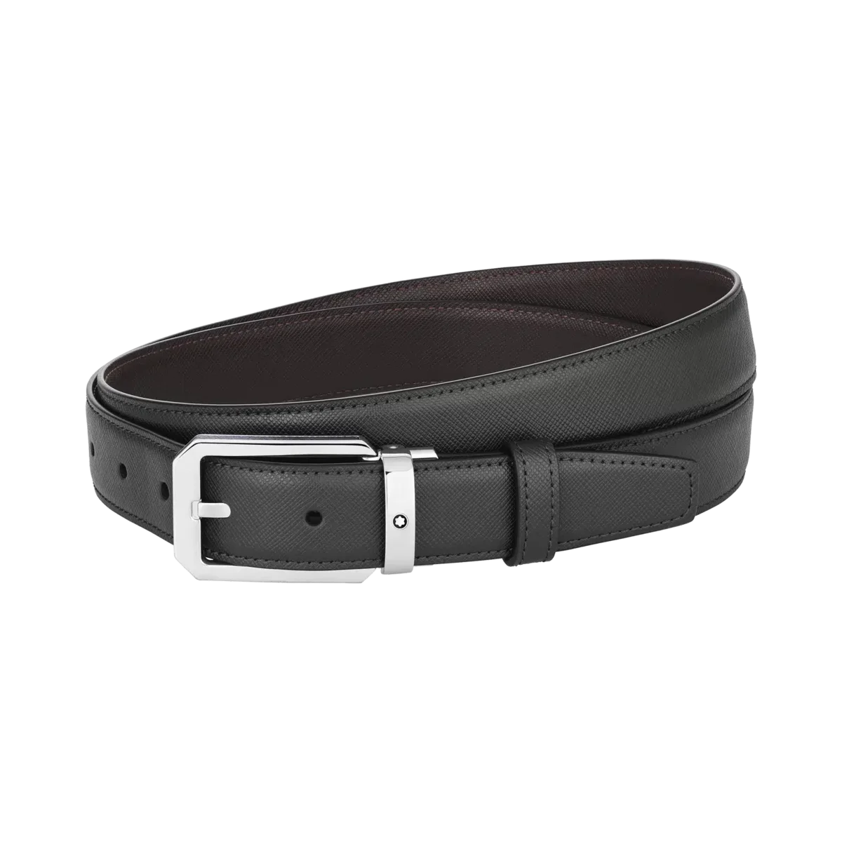 Fibbia ad ardiglione trapezoidale lucida con finitura in palladio e dettagli in pelle. Cinturino in pelle stampata saffiano auto-regolabile, 3 cm x 120 cm, reversibile in nero e marrone. Concepito per un look classico con un tocco di originalità.