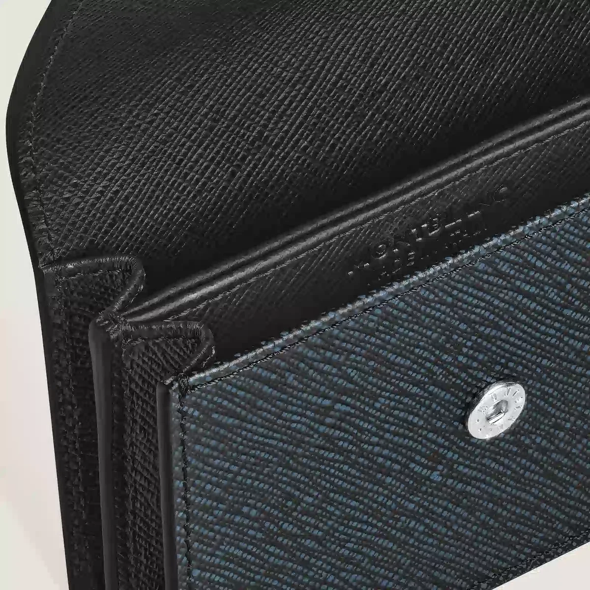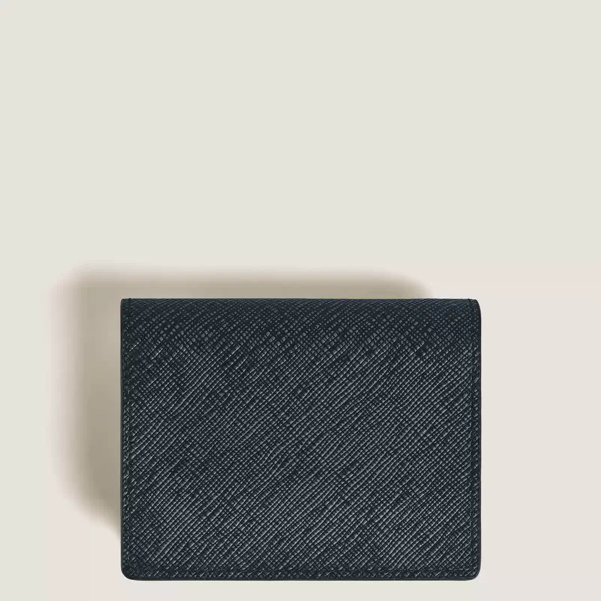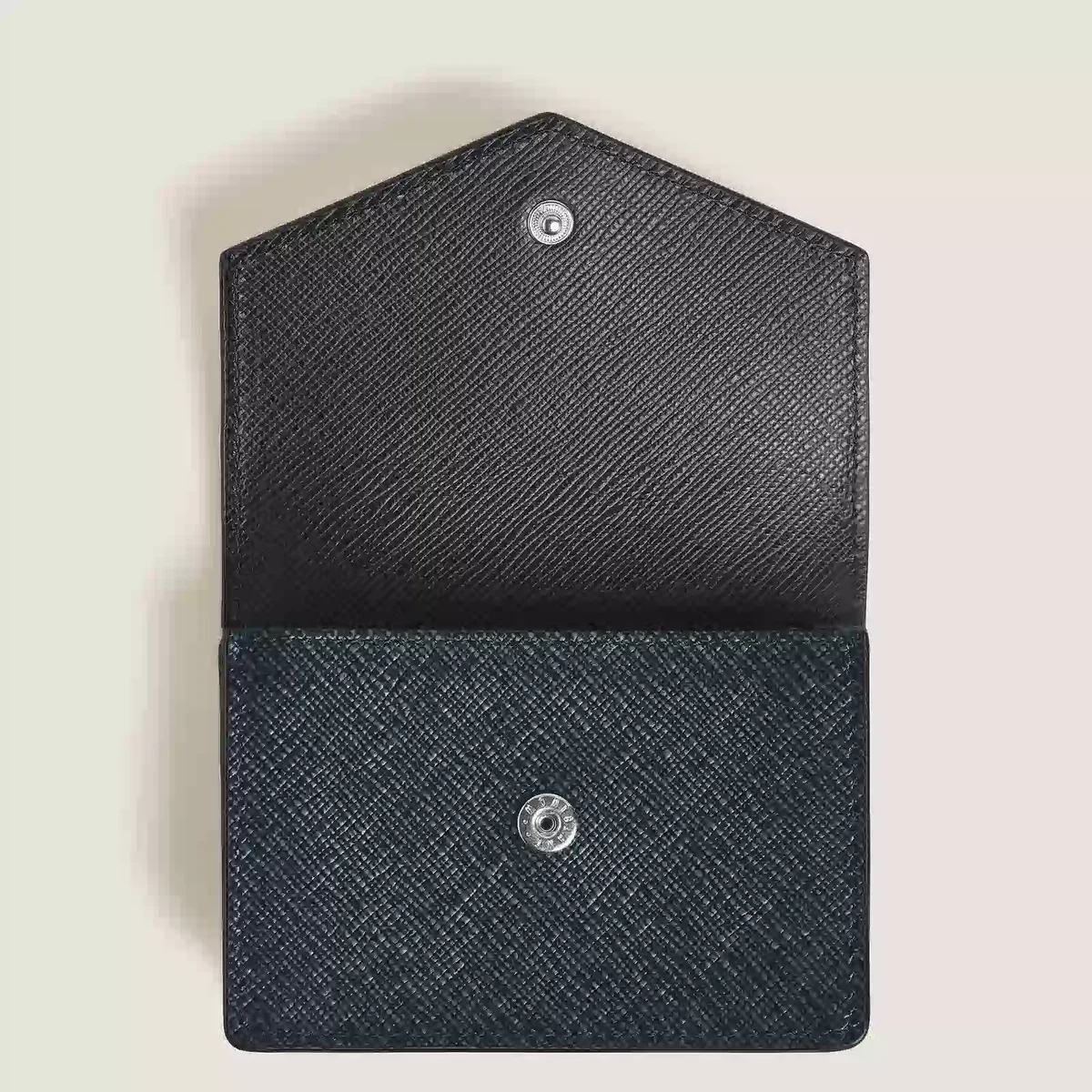 Progettato per chi apprezza lo stile minimalista e funzionale, questo elegante portacarte è realizzato in pelle sartoriale goffrata in una raffinata combinazione bicolore di blu e nero. Il suo design elegante presenta una chiusura con patta fissata da un bottone a pressione, che mantiene le tue carte al sicuro. All’interno, offre due scomparti e una tasca aggiuntiva, fornendo ampio spazio per le tue carte essenziali e qualche extra.