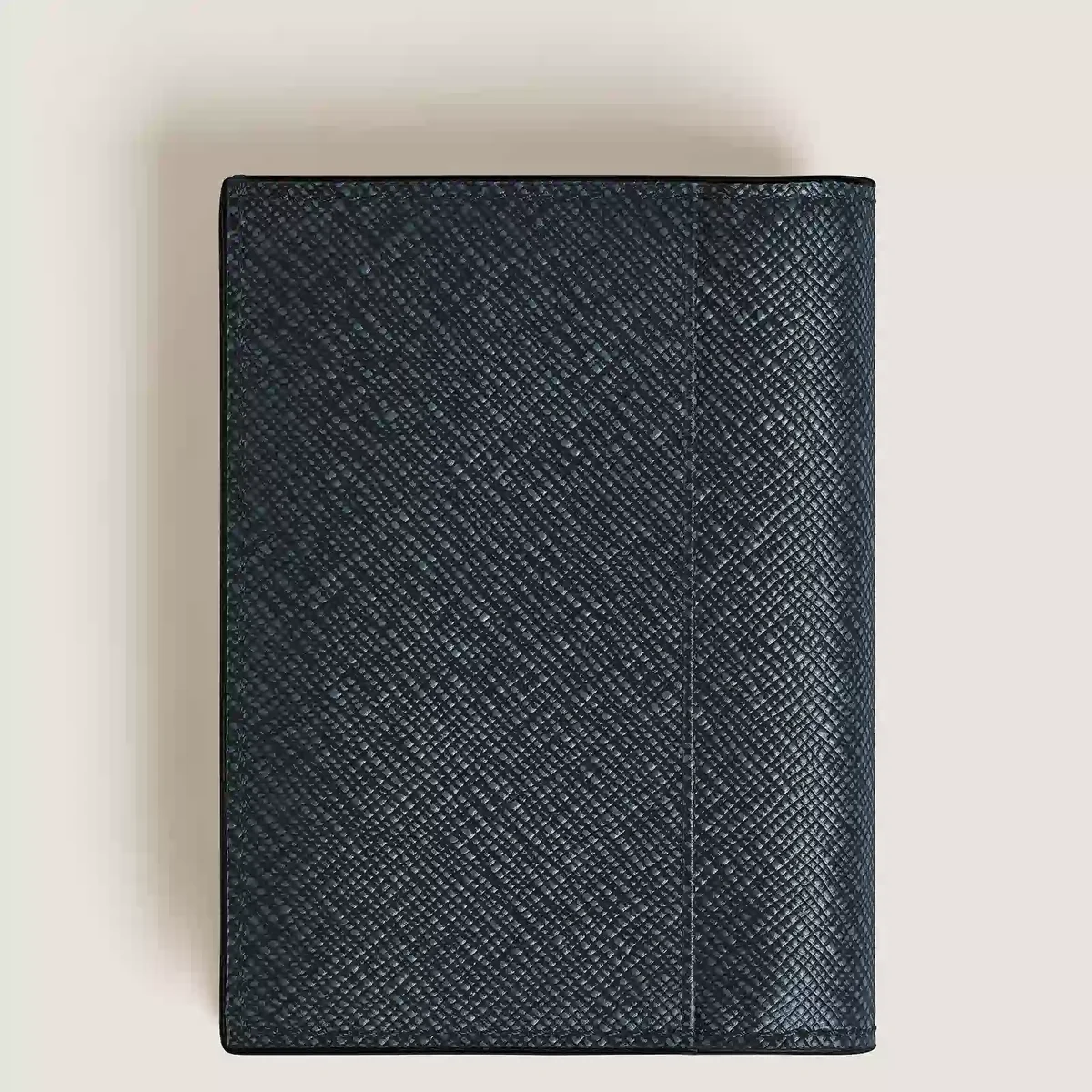 Compatto ed elegante, questo mini portafoglio è realizzato in pelle sartoriale goffrata in un’elegante combinazione di blu e nero. Ideale per chi preferisce viaggiare leggero, la sua silhouette slanciata si apre per rivelare tre scomparti per carte di credito, uno scomparto per banconote e due tasche aggiuntive, assicurandoti di poter trasportare tutto l’essenziale con facilità e raffinatezza.