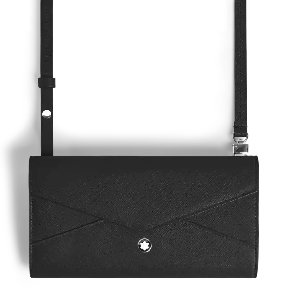 Ispirato alle classiche silhouette a busta, questo portafoglio continentale è un accessorio sofisticato per l’uso quotidiano. Realizzato in pelle nera sartoriale goffrata, è dotato di una tasca con cerniera per riporre monete e chiavi, 12 scomparti per carte di credito e due scomparti per banconote. Grazie alla tracolla removibile, il portafoglio può essere indossato anche come mini borsa compatta per le attività diurne e serali. Rifinito con l’iconico emblema Montblanc, unisce eleganza senza tempo e praticità.