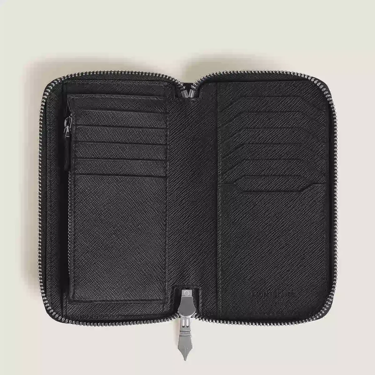 Questo pratico portafoglio con chiusura a zip combina uno stile intramontabile con una funzionalità pratica. Realizzato in pelle sartoriale goffrata in un’elegante combinazione di blu e nero, presenta un caratteristico tiretto in metallo a forma di pennino, che rende omaggio alla tradizione della scrittura di Montblanc. All’interno, il portafoglio offre 12 scomparti per carte di credito, un portamonete con chiusura a zip e tre tasche aggiuntive per ricevute o altri oggetti essenziali.