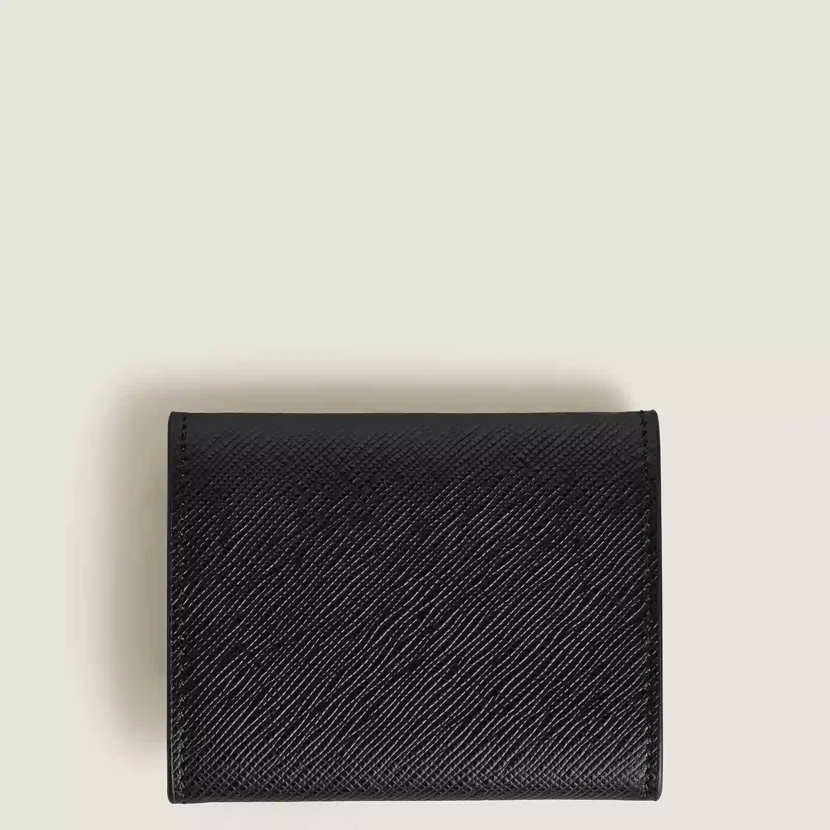 Elegante e compatto, questo portamonete è realizzato in pelle sartoriale nera goffrata. È dotato di un ampio scomparto per le monete ed è progettato per stare comodamente in tasca.