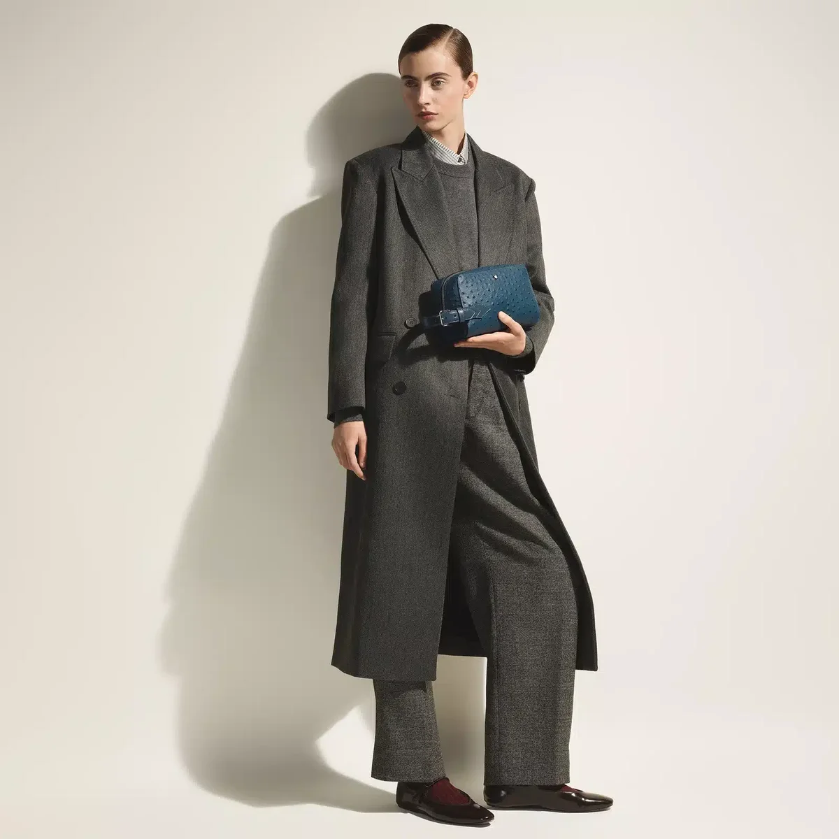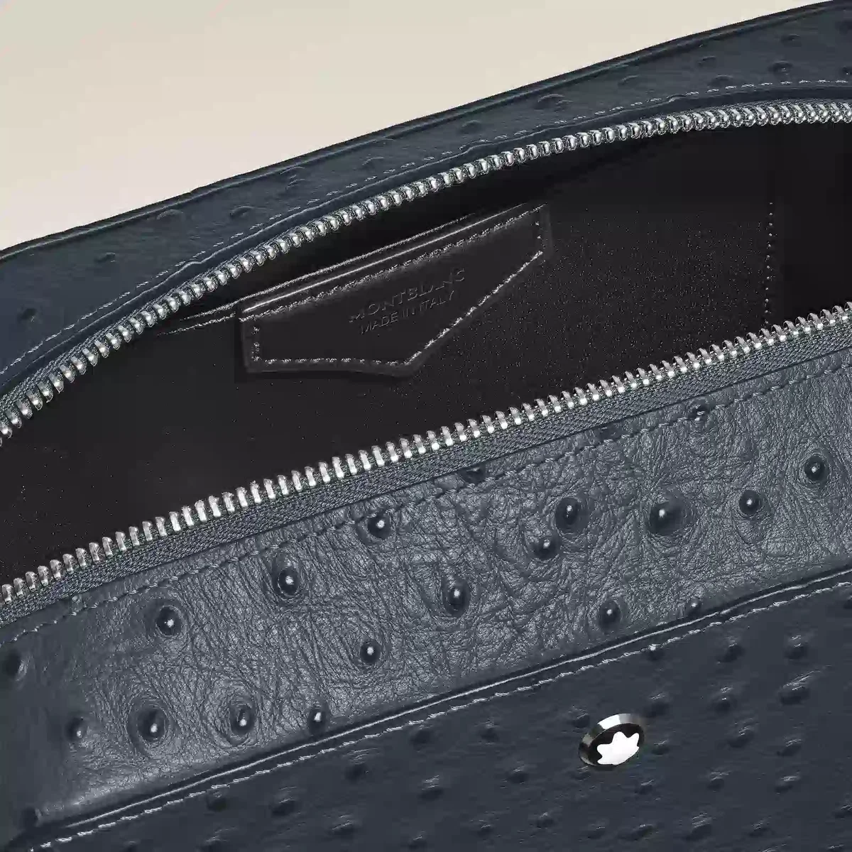 Con l’arte della scrittura al centro, la nuova pochette è realizzata in elegante pelle blu velvet con stampa struzzo. I dettagli agli angoli conferiscono al suo design un tocco distintivo e raffinato. Di dimensioni perfette per gli oggetti essenziali di uso quotidiano, è dotata di uno scomparto principale con tasca aperta e tracolla staccabile, che unisce eleganza e funzionalità versatile.