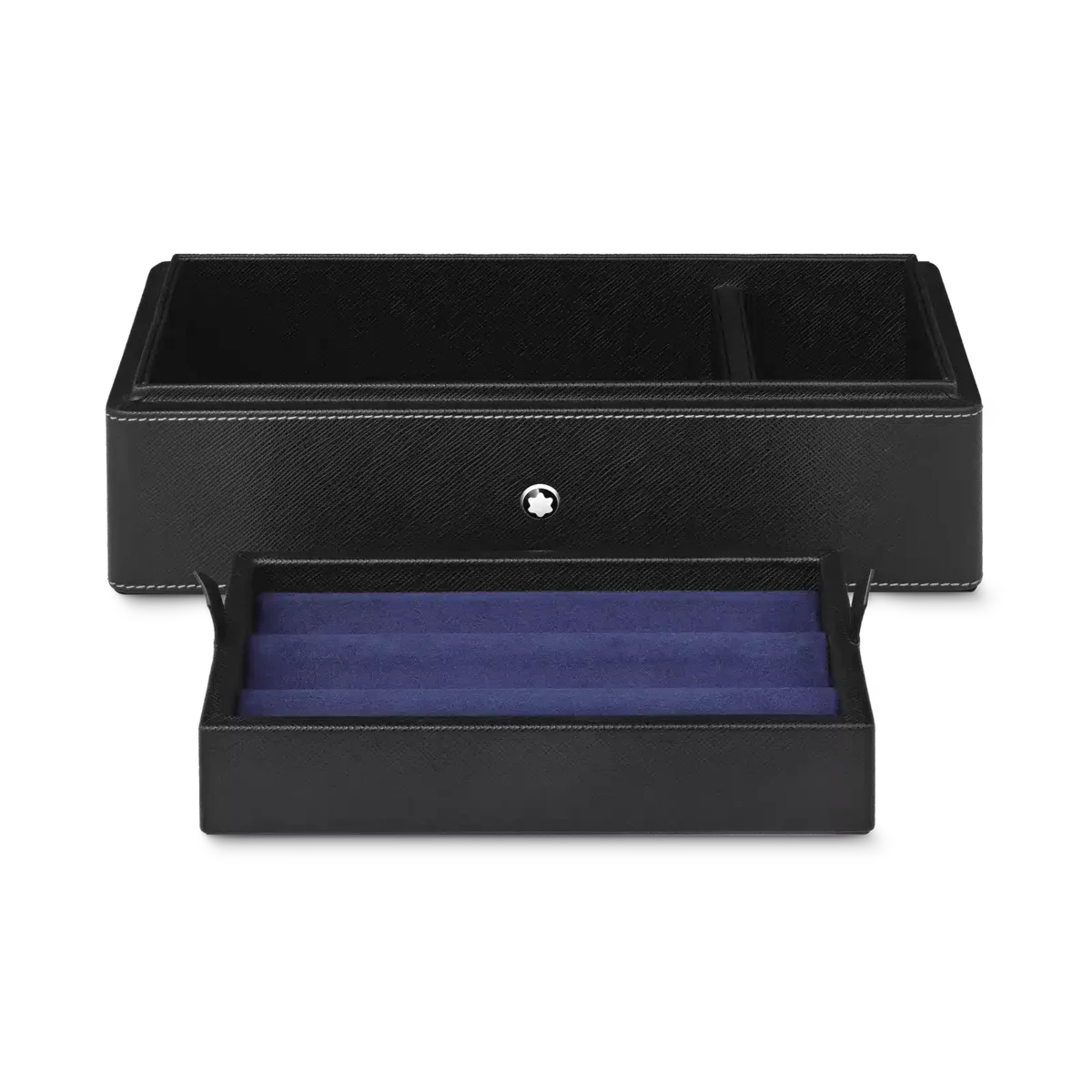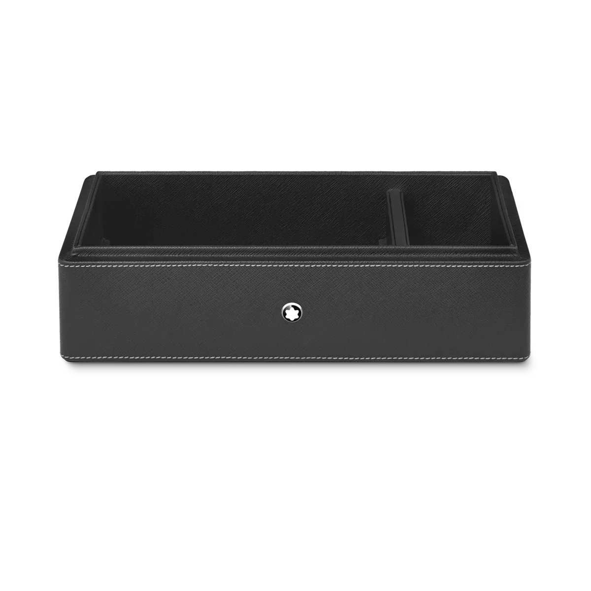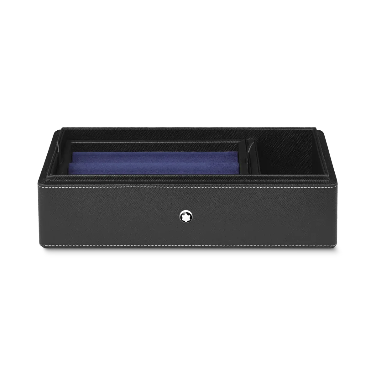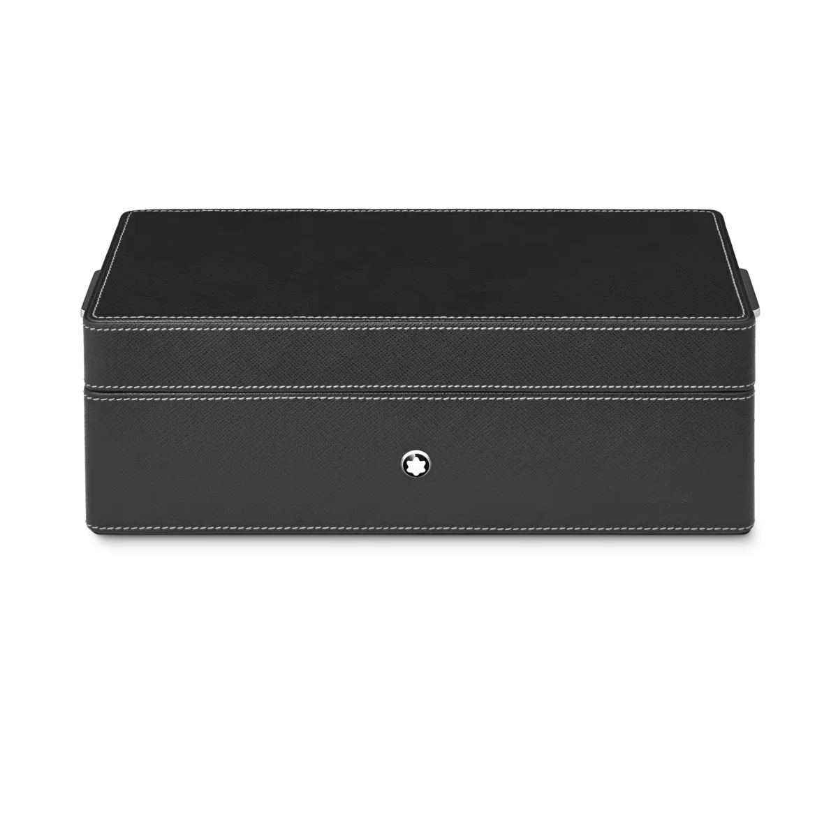 Scatola da scrivania Montblanc in pelle nera. Può contenere fino a 3 strumenti da scrittura e un calamaio. Il coperchio funge da vassoio aggiuntivo.