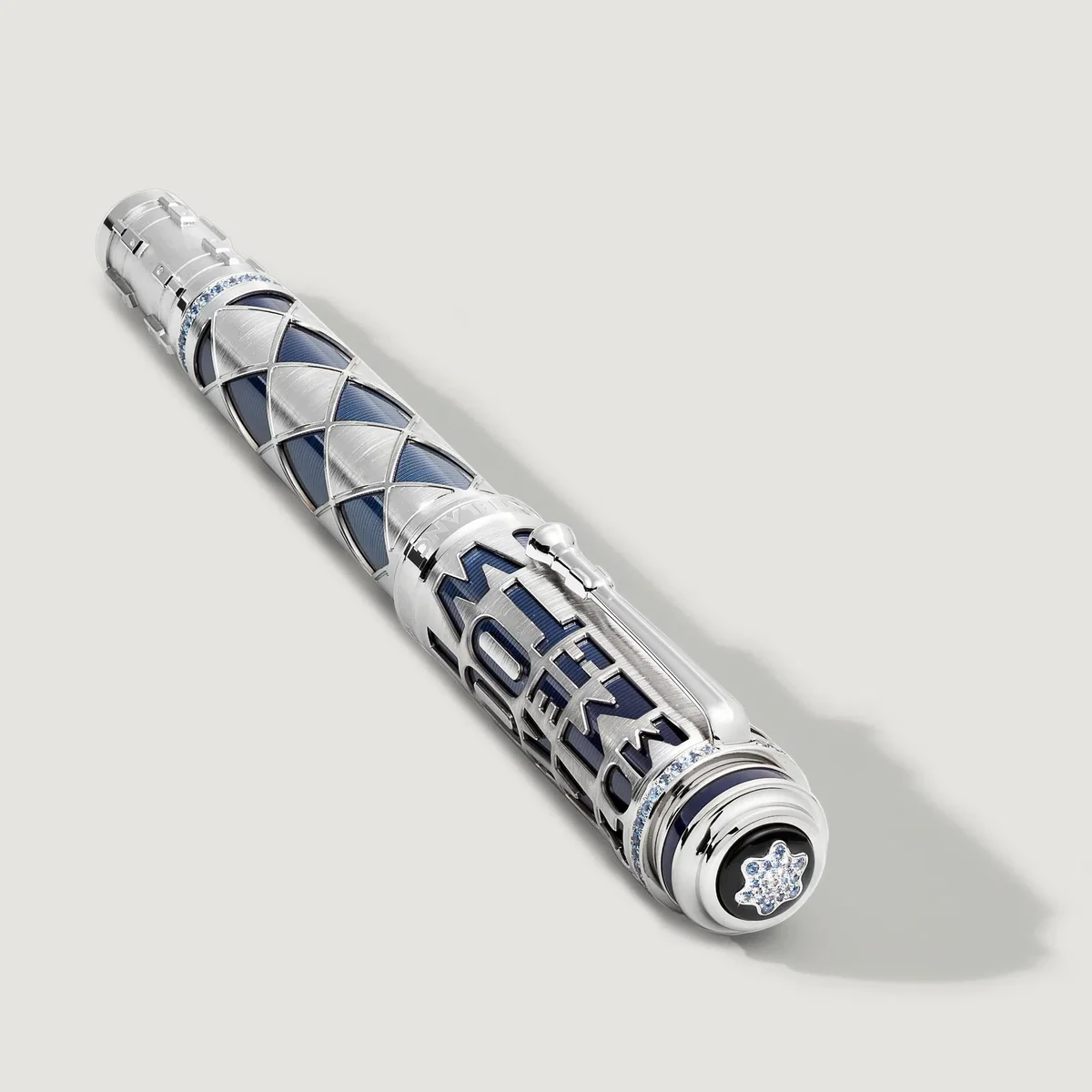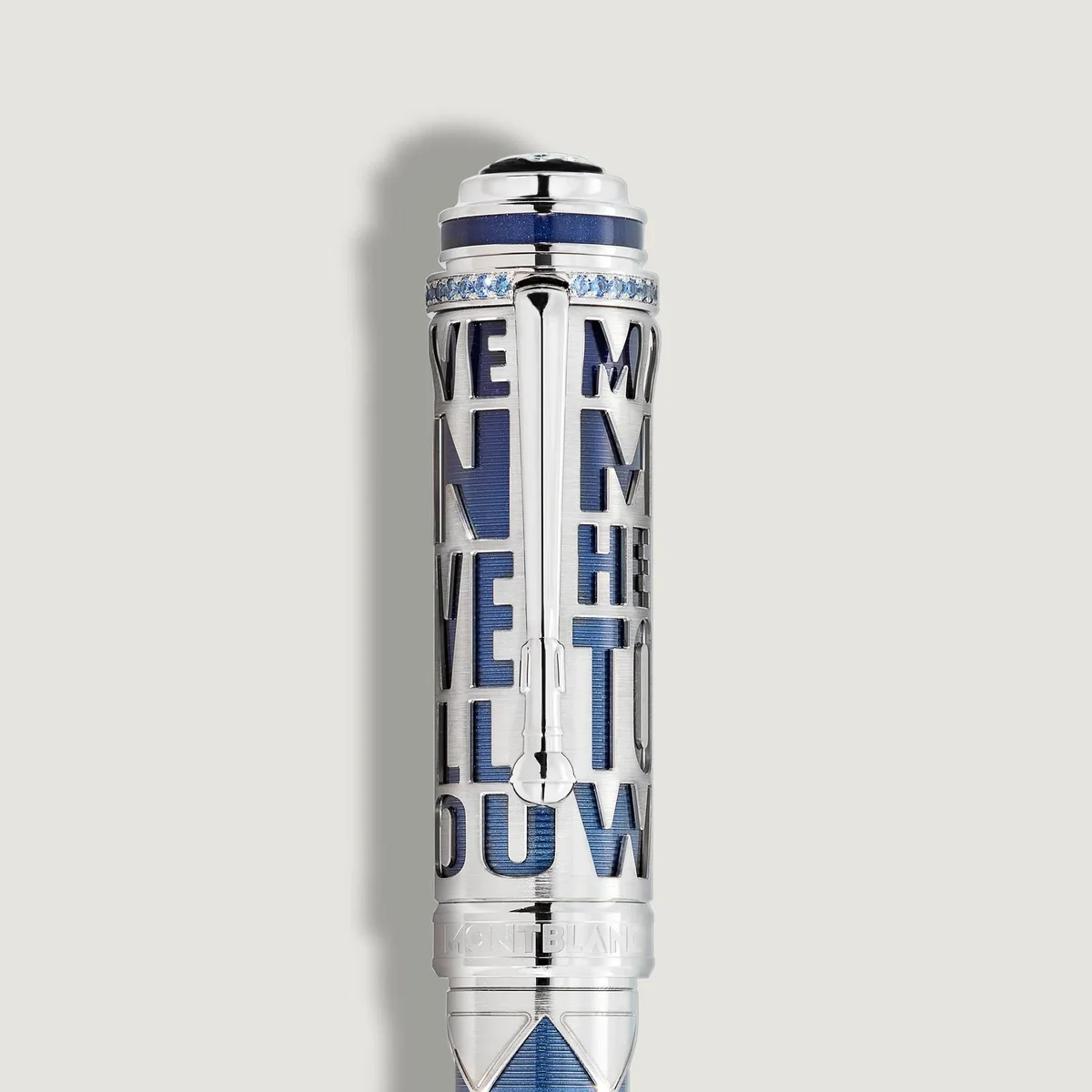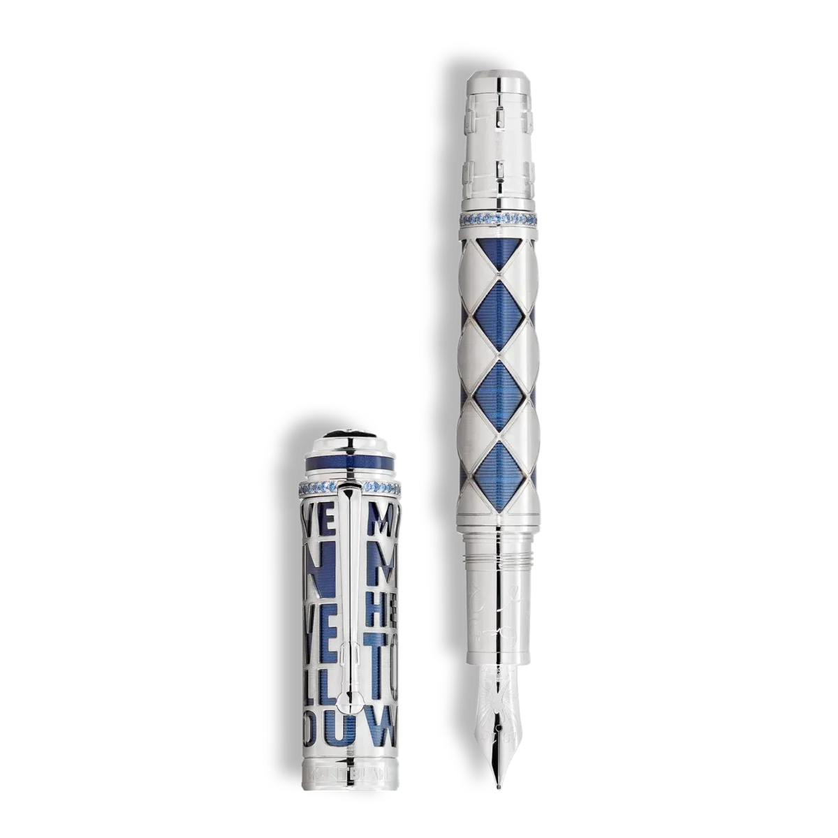 Nella ricca storia della musica rock pochi nomi hanno brillato in modo così costante come quello dei Queen. Con una carriera che abbraccia oltre cinque decenni, la band è una delle più famose di tutti i tempi. Durante questo periodo, i Queen sono diventati l’incarnazione del potere della creatività musicale e la maggior parte delle loro canzoni ha dominato le classifiche per settimane. Hanno creato qualcosa di simile al loro universo musicale, composto da una combinazione di hard rock, glam rock, pop, funk e opera, abbattendo i confini tra i generi. In onore dell’ultimo album dei Queen, i titoli di tre delle sue canzoni decorano la solida sovrapposizione scheletrata in oro bianco Au 750 sul cappuccio: Mother Love, Made In Heaven e Too Much Love Will Kill You. I solchi sulla lacca blu a contrasto sottostante rispecchiano esattamente gli stessi solchi dell’album Made in Heaven. La progressione cromatica dal blu scuro al blu chiaro e poi di nuovo al blu scuro ricorda la combinazione di colori della copertina dell’album. Nel realizzare i loro album, i quattro membri della band hanno spinto al limite assoluto le possibilità artistiche e tecniche dello studio di registrazione. Ma vedere la band dal vivo era tutta un’altra cosa. I loro sensazionali concerti dal vivo – ne hanno tenuti più di 700 dal 1970 al 1986 – erano uno spettacolo a sé stante che ha raggiunto lo status di leggenda. Lo stesso Mercury, noto per i suoi costumi di scena sgargianti, spesso indossava i panni di un personaggio della Commedia dell’Arte, Arlecchino. La sua famosa tuta aderente con motivo a rombi bianchi e neri sottolineava la sua personalità scenica non convenzionale. Il Great Characters Homage to Queen Limited Edition 30 riprende questo motivo romboidale per il fusto, interpretato ad arte sotto forma di rombi in oro bianco massiccio Au 750 su lacca blu. Una fascia di zaffiri blu segna il passaggio dal fusto al cono rivestito in oro bianco, la cui forma ricorda le manopole di controllo del volume e del tono di una chitarra elettrica, lo strumento che è stato un elemento chiave del suono inconfondibile dei Queen. Nella punta del cono è incastonato un intarsio unico realizzato con il legno delle bacchette originali di Roger Taylor, intrecciato con le corde della chitarra che Brian May stesso ha suonato in passato. In omaggio all’album Made In Heaven e per celebrare il trentesimo anniversario della sua uscita, l’edizione è limitata a soli 30 esemplari. Ispirato alla copertina dell’album, il pennino in oro massiccio Au 750 rivestito in rodio e realizzato a mano riproduce la silhouette di Freddie Mercury in una delle sue pose più iconiche e trionfanti sul palco. In riconoscimento del ruolo importante svolto da ciascun membro della band, le loro firme adornano la parte anteriore del gioiello da scrittura. Un anello realizzato con preziosi zaffiri blu avvolge il cappuccio in oro bianco massiccio Au 750, sopra il quale la cupola presenta l’emblema Montblanc composto da zaffiri blu incastonati a pavé. In ricordo dell’elettrizzante presenza scenica della band, la clip è stata progettata per assomigliare a un’asta microfonica, un semplice oggetto di scena utilizzato con effetti spettacolari nelle esibizioni dal vivo.