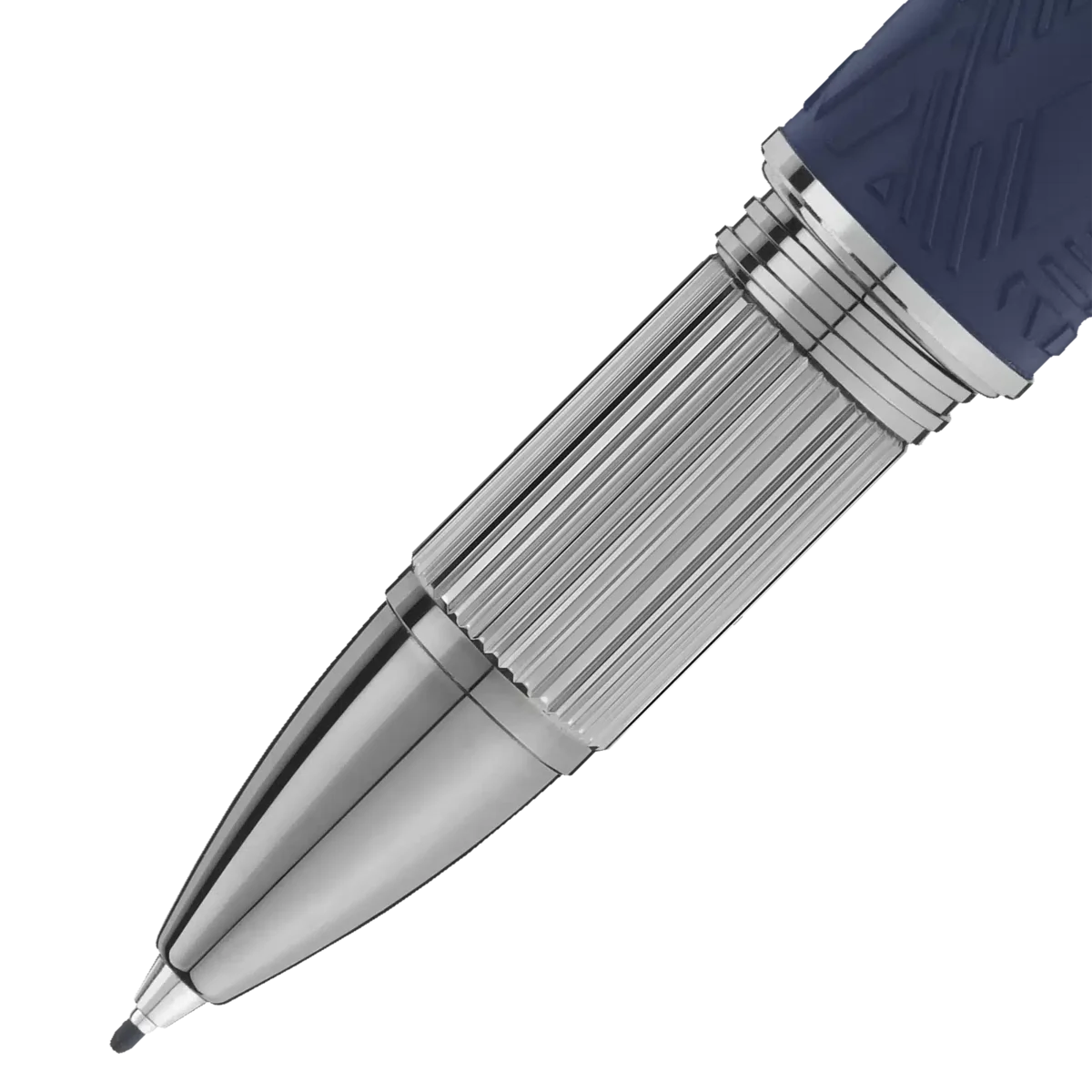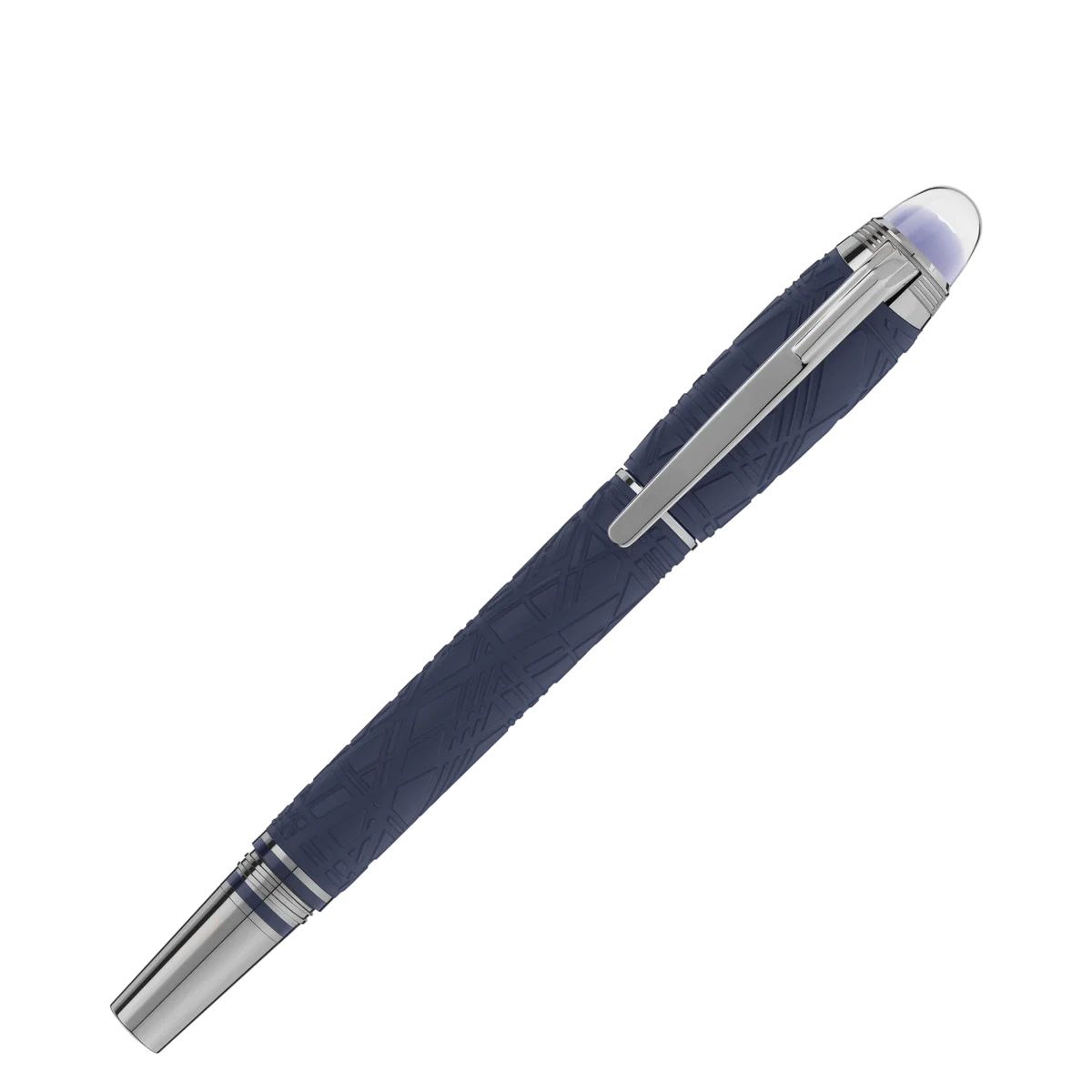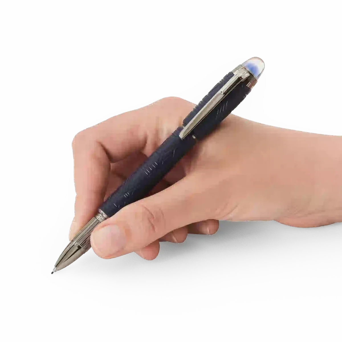 StarWalker SpaceBlue guarda oltre il pianeta Terra e si rivolge alle stelle e alla galassia. Questa nuova collezione StarWalker conferisce un nuovo look al cappuccio e al fusto in resina, con un design che richiama le intricate strutture del motivo Widmanstätten, una delle creazioni più ipnotiche della natura. Tutte le parti metalliche sono rivestite in rutenio scuro, accompagnato da una tonalità blu spazio profondo per la resina preziosa opaca, che ricorda le sfumature di un cielo stellato. Inoltre, il sottodomo sulla parte superiore del cappuccio, su cui galleggia l’emblema Montblanc, è disponibile in un colore blu spazio profondo.