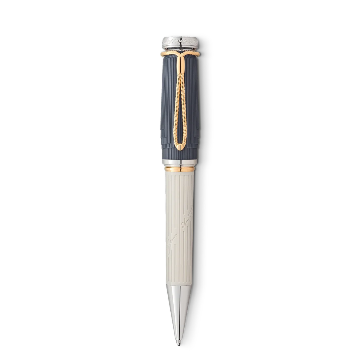 Pochi autori nella storia della letteratura hanno avuto la capacità di creare dialoghi e dare vita ai personaggi in modo così elegante, ironico e astuto come la scrittrice britannica Jane Austen. Montblanc ha creato la Writers Edition Homage to Jane Austen per celebrare una delle autrici più famose della letteratura inglese.Questa edizione riporta in vita l’epoca della Reggenza, quando le nobili tenute di campagna erano teatro di grandi feste organizzate allo scopo di coltivare relazioni sociali e stringere alleanze matrimoniali. Le scanalature di una colonna classica impreziosiscono l’elegante corpo in resina grigio arenaria, insieme alla firma di Jane Austen. Il cappuccio grigio-blu a contrasto richiama il tipo di cappotto a doppio colletto della Reggenza tipicamente indossato da gentiluomini come Mr Darcy in Orgoglio e pregiudizio. Gli anelli placcati in oro sul fusto e le finiture placcate in platino aggiungono il tocco finale al design. L’incisione dei numeri romani XLIII sull’anello del cappuccio è un riferimento al capitolo del romanzo in cui Elizabeth Bennet vede per la prima volta la tenuta di Mr Darcy.Il frontespizio del suo romanzo Ragione e sentimento, pubblicato nel 1811, dichiarava semplicemente che l’opera era stata scritta “Da una signora”. Questa dichiarazione di paternità adorna la parte superiore del cappuccio della Writers Edition Homage to Jane Austen Limited Edition, insieme all’emblema Montblanc. La silhouette dello strumento di scrittura ricorda un sigillo di cera. La clip è insolita quanto il cappuccio. A forma di cordoncino intrecciato con chiusura a coulisse, ricorda quella di una “reticule”, un tipo di borsa utilizzata dalle donne intorno al 1800 per trasportare la cipria, lo specchio e l’indispensabile fazzoletto da taschino.
