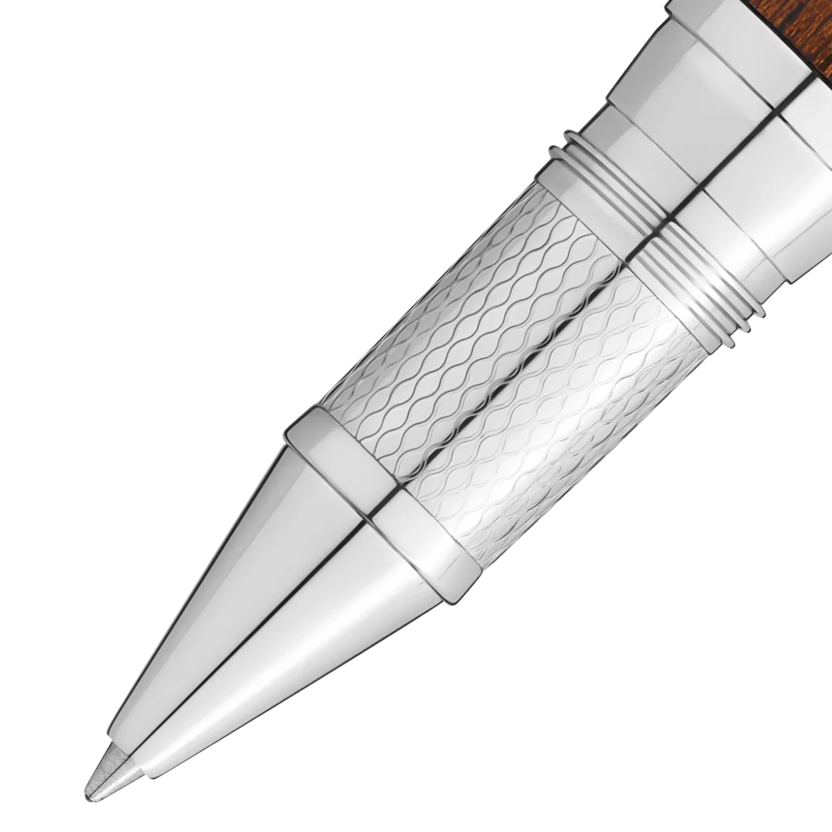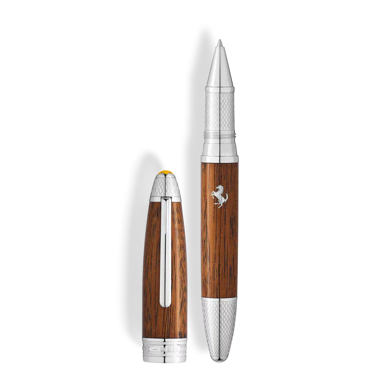 Il programma Tailor Made di Ferrari è strutturato attorno a tre collezioni: Classica, Inedita e Scuderia. I clienti Ferrari possono quindi trarre ispirazione da una o più di queste collezioni, adattando i vari elementi in base ai propri gusti. La Meisterstück Great Masters Ferrari Classica, la prima edizione lanciata nell’ambito di questo programma, si ispira alla collezione Classica, che reinterpreta in chiave moderna gli stilemi e le caratteristiche delle iconiche GT di Maranello. Basato su queste caratteristiche, lo strumento di scrittura rende omaggio al design del volante della 250 GTO, insieme alla sensazione e al sogno di tenerne uno tra le mani. La parte superiore del cappuccio presenta l’emblema Montblanc in resina gialla, un richiamo alla palette di colori Ferrari, mentre la parte superiore del cappuccio rivestita in platino e il cono con incisione ricordano l’impugnatura del volante, un dettaglio che si ritrova anche nella parte anteriore. Il cappuccio e il fusto sono realizzati in legno Sapeli, impreziositi da un elegante inserto in lacca nera e dal cavallino rampante Ferrari.