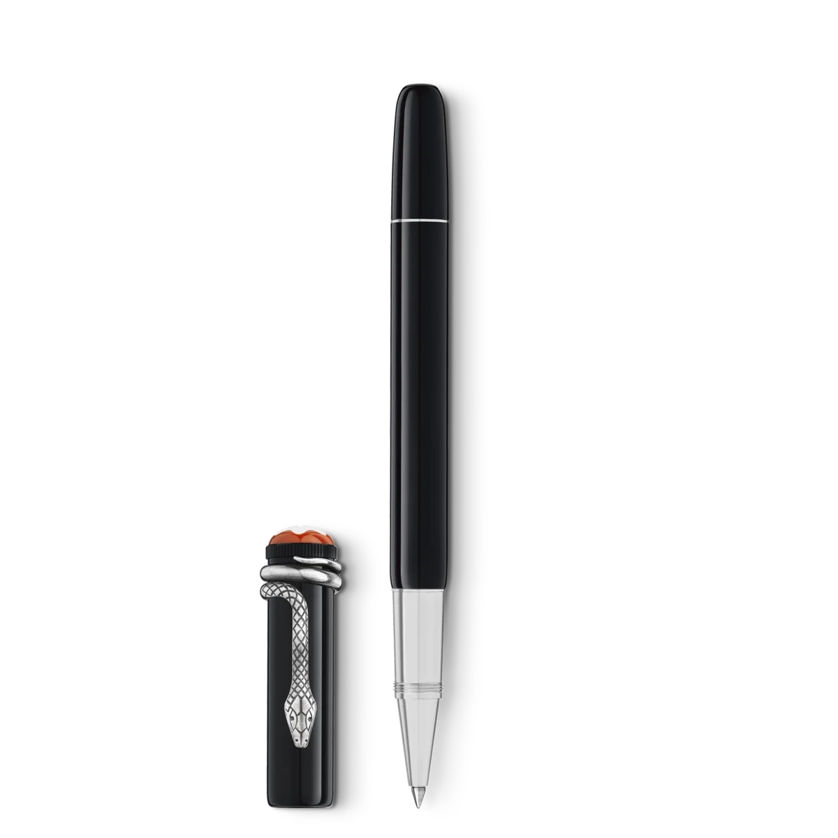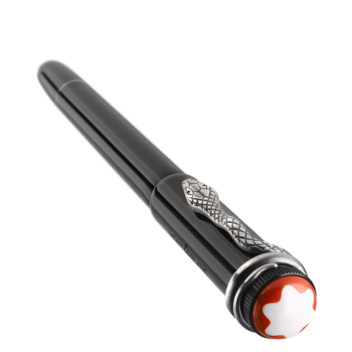 Quando fu sviluppata nel 1906, la penna stilografica “Rouge et Noir” era considerata un risultato tecnico eccezionale, in grado di garantire un funzionamento semplice senza la necessità di intingere il pennino nel calamaio. La Heritage Collection Rouge et Noir celebra lo spirito pionieristico di Montblanc, che dura da 110 anni. Reinterpretando il leggendario strumento di scrittura, presenta una silhouette più lunga e slanciata e una lavorazione artigianale affinata nel corso delle generazioni. Clip a forma di serpente in stile vintage con finiture abbinate. La clip è realizzata con un processo di stampaggio e avvolgimento in una lega metallica speciale ed è invecchiata con un processo galvanico e di stripping unico nel suo genere.