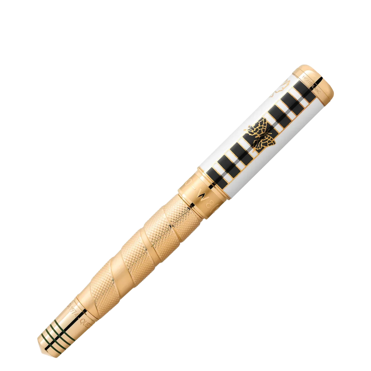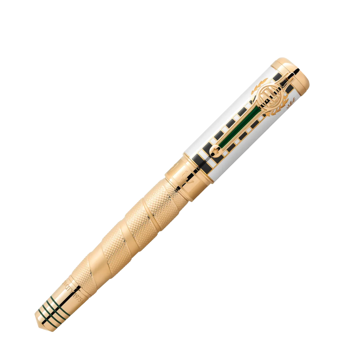 Pochi atleti sono celebrati e onorati come il tre volte campione del mondo dei pesi massimi Muhammad Ali, i cui momenti leggendari nello sport e nell’attivismo per i diritti civili lo hanno reso uno degli atleti e filantropi più influenti del XX secolo. Come atleta, Ali ha sconvolto il mondo con la sua forza, abilità e personalità, diventando campione del mondo dei pesi massimi a soli 22 anni. Il suo più grande trionfo, tuttavia, è stato il risultato dei suoi sforzi umanitari. Ispirata alla vestaglia indossata da Ali quando entrò nel leggendario incontro di Kinshasa, nello Zaire, nel 1974, la preziosa lacca sul cappuccio rappresenta questo motivo distintivo, mentre il motivo sul fusto rivestito in oro ricorda i nastri da boxe che gli atleti usano per avvolgere le mani. La farfalla placcata in oro sul cappuccio si ispira al suo tipico stile di combattimento: “Vola come una farfalla, pungi come un’ape”. Il cono appuntito riprende questa idea e le quattro linee laccate ricordano le corde di un ring di pugilato. Le iscrizioni sul cono si riferiscono alla vittoria di Ali nell’incontro del 1974 soprannominato “Rumble in the Jungle”, quando Ali vinse il suo secondo titolo mondiale dei pesi massimi. I dettagli della sua vittoria, ovvero l’aver vinto all’ottavo round per KO tecnico, sono riportati sull’anello del cappuccio. Il cono fa riferimento anche a un famoso incontro di Ali del 1975, soprannominato “Thrilla in Manila”.Per celebrare il suo secondo titolo, l’emblema Montblanc in resina preziosa bianca è decorato con un “2”. A sottolineare questo successo, la clip ha la forma di una cintura di campione di pugilato e reca il suo nome. Il pennino bicolore in oro massiccio Au 750 lavorato a mano raffigura un guantone da boxe. Identificativo n. MB129336 Peso fisico 95,76 g Dimensioni 147,3 mm * 17,3 mm
