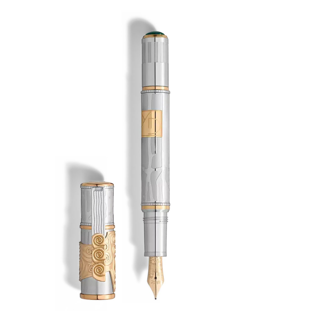 Nel corso della storia, i grandi artisti hanno espresso l’esperienza umana attraverso un linguaggio universale fatto di forme e bellezza. La collezione Montblanc Masters of Art rende omaggio al loro contributo eterno alla ricerca della perfezione nell’arte, una ricerca che Montblanc celebra e alla quale partecipa attivamente. Un artista la cui visione ha contribuito a plasmare l’Art Nouveau viennese e l’età dell’oro è Gustav Klimt. La Montblanc Masters of Art Omaggio a Gustav Klimt Edizione Limitata 888 celebra il suo impegno attivo nella Secessione viennese e presenta elementi di design tratti dal suo Fregio di Beethoven, il capolavoro su larga scala della sua “fase dorata” che ha creato per l’edificio della Secessione. Il rivestimento in oro giallo massiccio Au 750 a rilievo sul cappuccio rivestito in platino, con le sue spirali e linee verticali che simboleggiano le corde di una lira, è un riferimento alle decorazioni dorate del Fregio di Beethoven e alla figura poetica che suona la lira, i cui suoni si dice placino il desiderio di felicità dell’umanità. Linee bidimensionali ispirate ai rilievi della facciata dell’edificio della Secessione risplendono sullo sfondo opaco del cappuccio e del fusto rivestiti in platino. La combinazione di oro giallo massiccio Au 750 ed elementi rivestiti in platino sul cappuccio e sul fusto riecheggia i materiali sperimentali e lussuosi tipici di Gustav Klimt. Il gioco di contrasti è arricchito da un cabochon di malachite nel cono. Il colore verde della malachite evoca la primavera, la stagione dei nuovi inizi. In riconoscimento dei meriti di Klimt per la Secessione viennese, l’intarsio in oro massiccio Au 750 sul fusto reca il suo monogramma della Secessione con le iniziali GK. La clip dell’Homage to Gustav Klimt Limited Edition 888 è stata appositamente progettata con riferimento alla Pallas Athene di Gustav Klimt. Poiché Atena è la dea sia della guerra che delle arti, è raffigurata mentre dà inizio alla lotta per la libertà artistica. Le linee leggermente curve che terminano in tre spirali sulla clip della Limited Edition 888, rivestita in parte di platino e in parte di oro giallo, corrispondono alla decorazione sulla montatura in metallo forgiato. Il pennino in oro giallo massiccio Au 750 realizzato a mano della Homage to Gustav Klimt Limited Edition 888 è decorato con elementi grafici finemente incisi che formano i tipici motivi geometrici presenti in molte opere di Gustav Klimt.