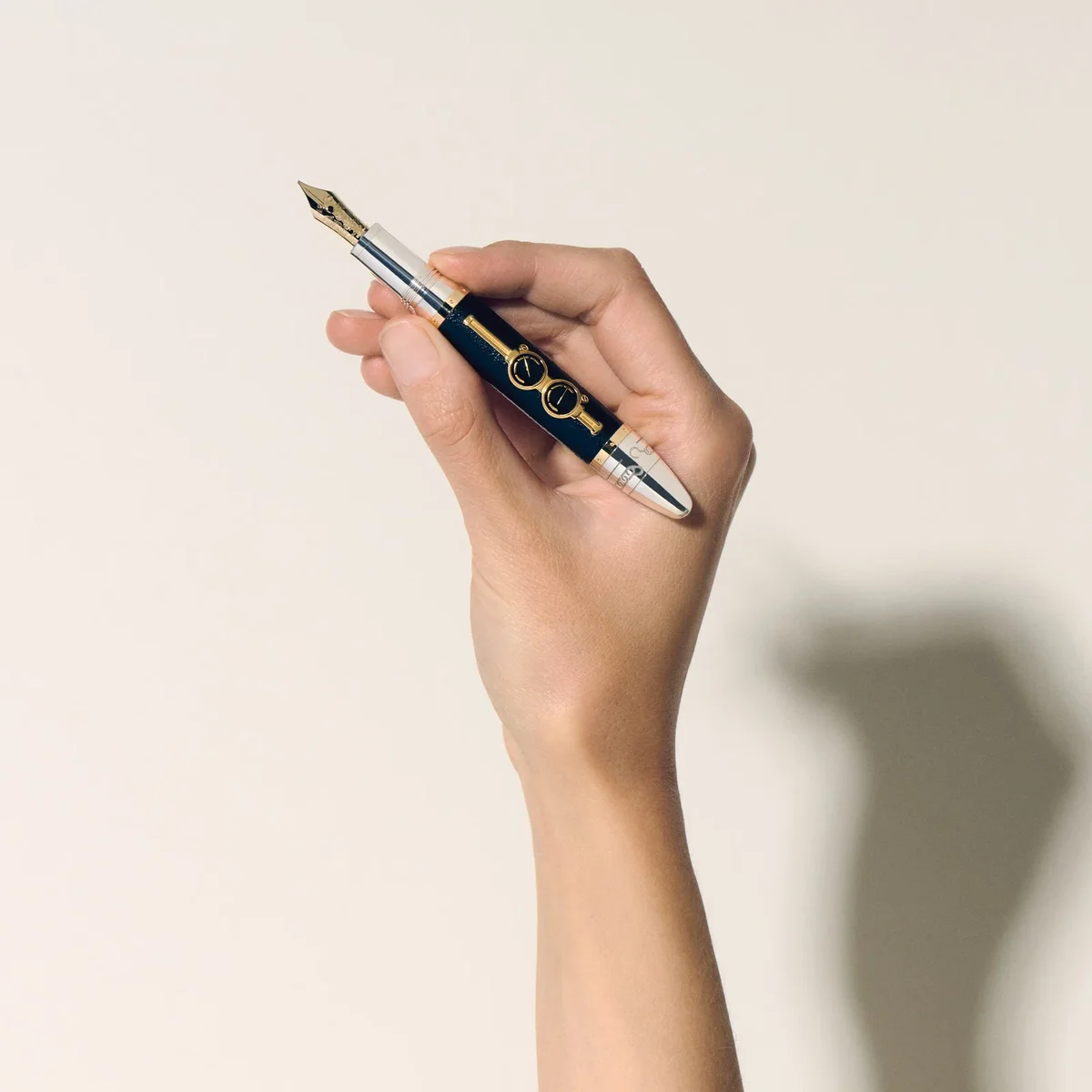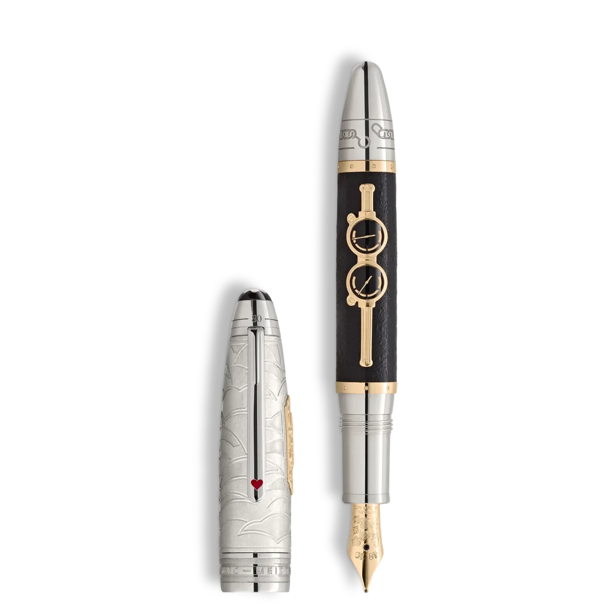 La collezione Meisterstück Around the World in 80 Days trae ispirazione dal famoso romanzo d’avventura di Jules Verne. La penna stilografica Limited Edition 811 in argento sterling Ag 925 e lacca strutturata racconta l’epico viaggio di Mr. Fogg e Passepartout. Imbarcandosi nell’ultima tappa da Yokohama a Londra passando per gli Stati Uniti, i due attraversano il vasto continente americano in treno, raffigurato sul cartiglio in oro massiccio Au750 / 18k intarsiato sul cappuccio in argento sterling Ag925. Il design del cappuccio cattura il fumo che si alza dalla locomotiva, mentre un intarsio 3D che rappresenta le valvole di pressione adorna il fusto testurizzato. La clip sfoggia un seme di cuori laccato di rosso, che simboleggia l’unione tra Phileas Fogg e la principessa Aouda. Inoltre, i semi delle carte rappresentano l’audace scommessa di Fogg di completare il viaggio in soli 80 giorni. La parte superiore del cappuccio reca incisa la cronologia del viaggio: 36 giorni da Yokohama a Londra, per un totale di 80 giorni intorno al mondo. Sul cono è raffigurato un motivo a catena di sicurezza, che rispecchia il momento cruciale in cui Passepartout stacca il treno dalla locomotiva per salvare l’equipaggio attaccato dai Sioux. Lo strumento di scrittura è rifinito con un pennino in oro 18 carati lavorato a mano, impreziosito da uno spinello nero da 1,5 mm e dal motivo dei semi delle carte da gioco.