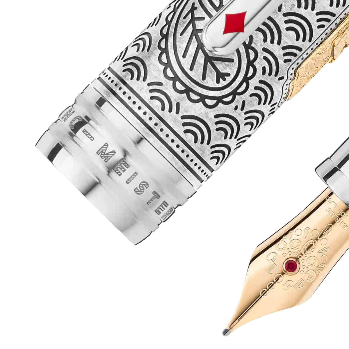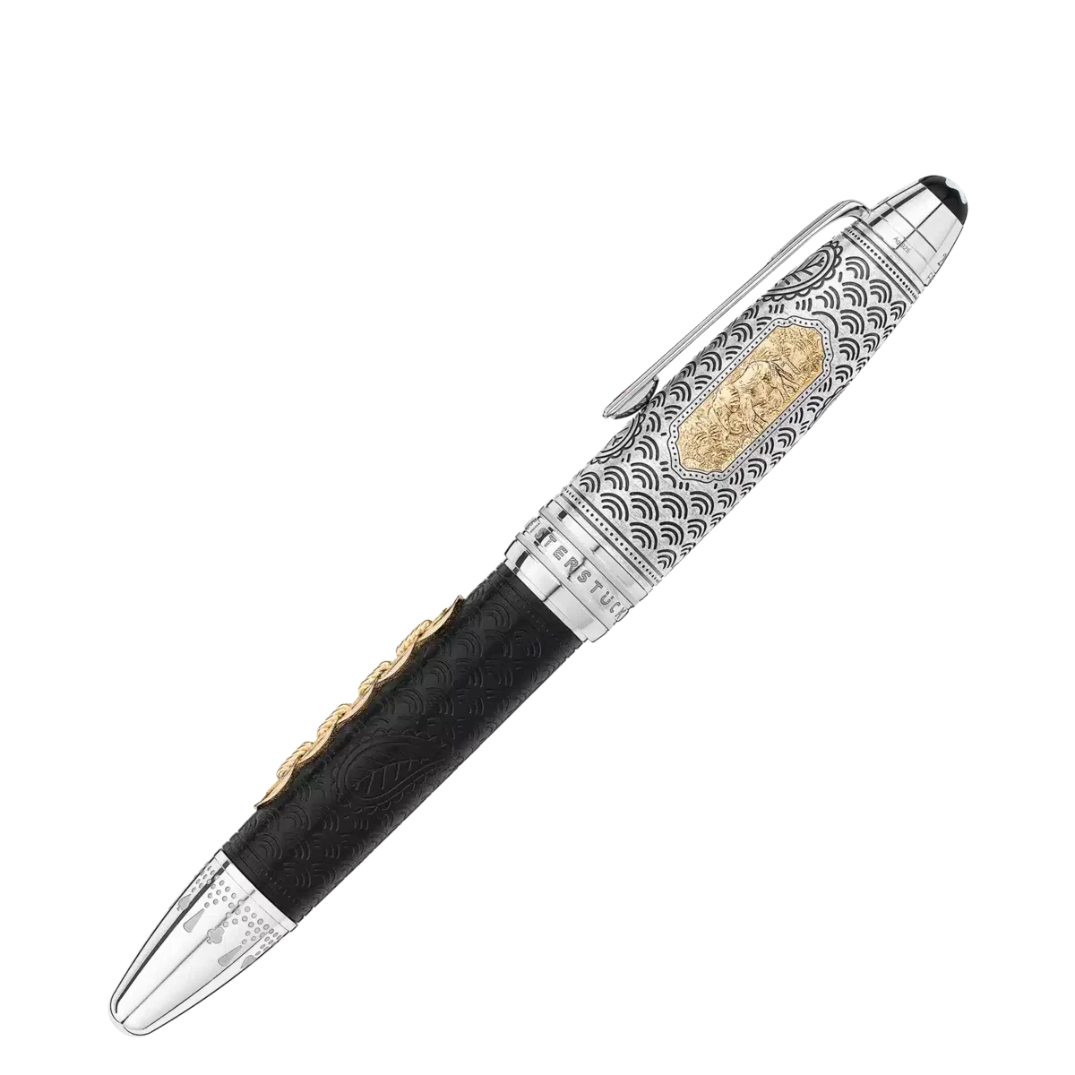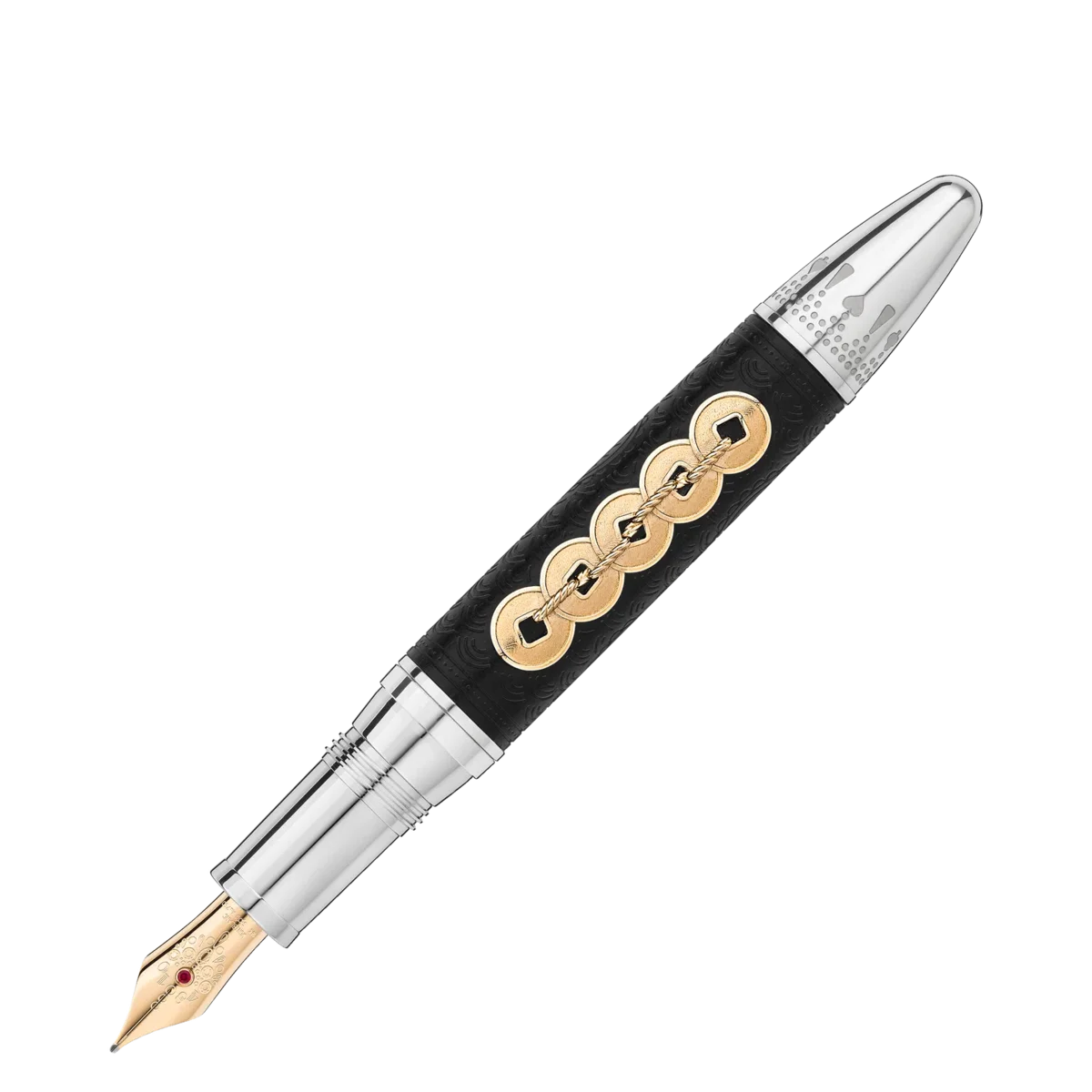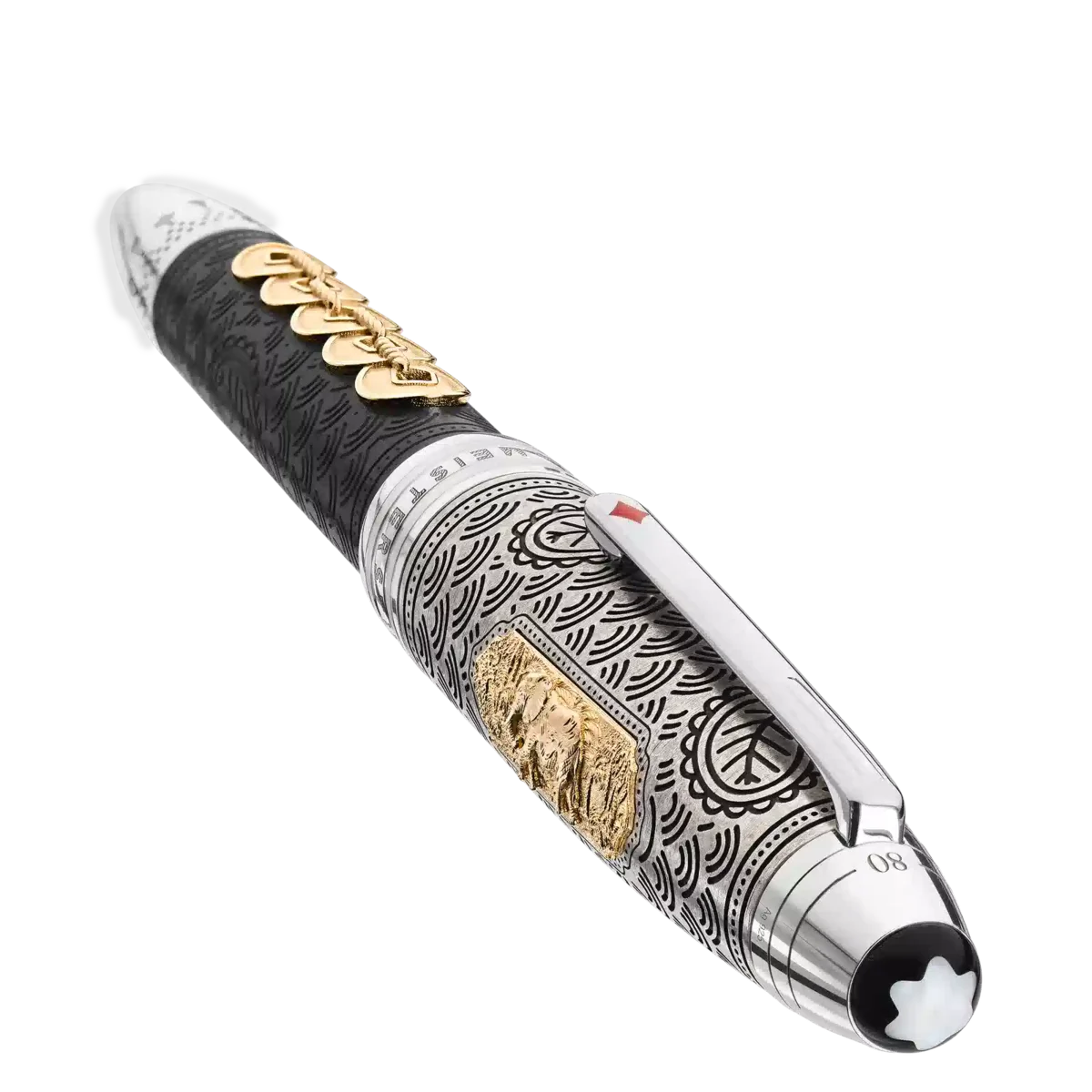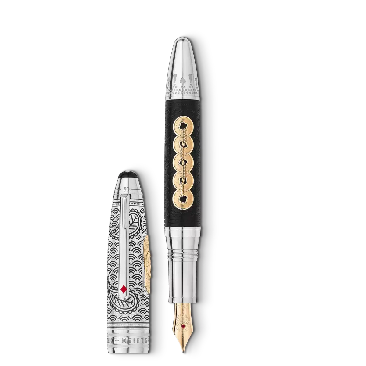 La collezione Meisterstück Around the World in 80 Days si ispira al famoso romanzo d’avventura di Jules Verne. La penna stilografica Limited Edition 811 in legno di ebano tinto nero si ispira alla seconda tappa del viaggio da Bombay a Yokohama. Il legno è stato scelto per rendere omaggio al momento in cui Mr. Fogg salva la principessa Aouda dal suttee. Il fusto in legno è intarsiato con un inserto in oro massiccio Au750 / 18k che rappresenta le 5 monete della dinastia Qing. In questa parte dell’avventura, i protagonisti viaggiano su un maestoso elefante attraverso le giungle dell’India, raffigurate sul cartiglio in oro massiccio AU750 / 18k intarsiato sul cappuccio in argento sterling Ag 925. Il cappuccio e il fusto presentano un motivo inciso con simboli di buona fortuna. La clip presenta un seme di diamanti laccato rosso e il cono è inciso con un motivo e semi di carte, che rappresentano la scommessa del signor Fogg di compiere il viaggio in 80 giorni. La parte superiore del cappuccio è impressa con la durata del viaggio, 25 giorni da Bombay a Yokohama e 80 giorni in totale. Lo strumento di scrittura è rifinito con un pennino in oro 18 carati lavorato a mano, impreziosito da un rubino e dal motivo gioiello della principessa Aouda.