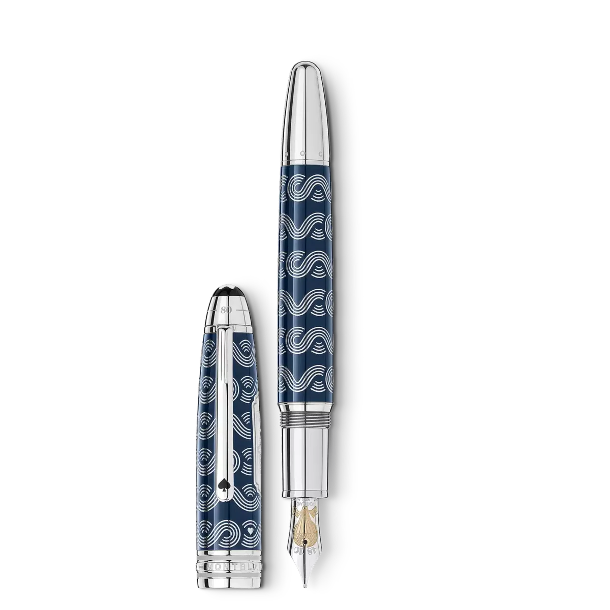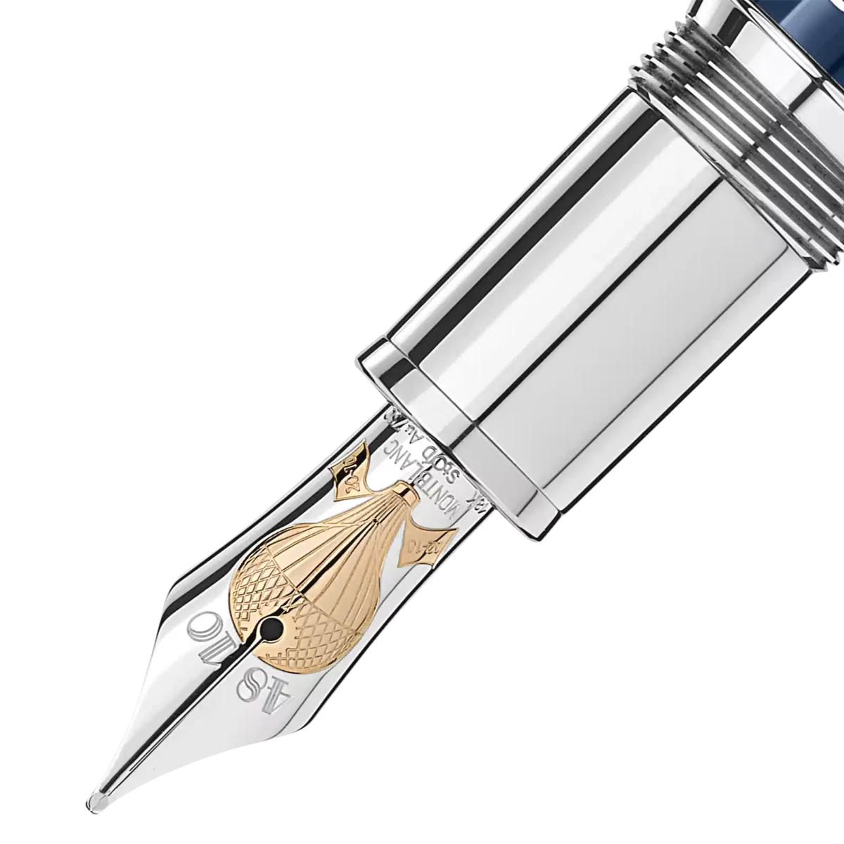 La collezione Meisterstück Around the World in 80 Days si ispira al famoso romanzo d’avventura di Jules Verne. La penna stilografica Solitaire Le Grand in lacca blu traslucida con finitura sfumata si ispira alla prima parte del viaggio. Il protagonista viaggia, principalmente in battello a vapore, da Londra a Bombay, attraversando il Mar Mediterraneo e il Canale di Suez. Il cappuccio e il fusto presentano un motivo fresato che riprende gli elementi chiave del romanzo: onde oceaniche, semi delle carte da gioco e un cartiglio con un battello a vapore inciso al laser. La parte superiore del cappuccio è impressa con la durata del viaggio, 18 giorni da Londra a Bombay e 80 giorni in totale. Lo strumento di scrittura è rifinito con un pennino bicolore Au750 placcato in oro e rodio color champagne, impreziosito da una mongolfiera e dalle date di inizio e fine dell’avventuroso viaggio.