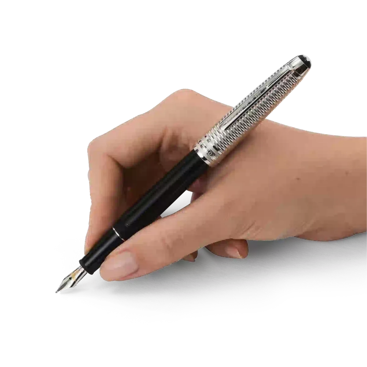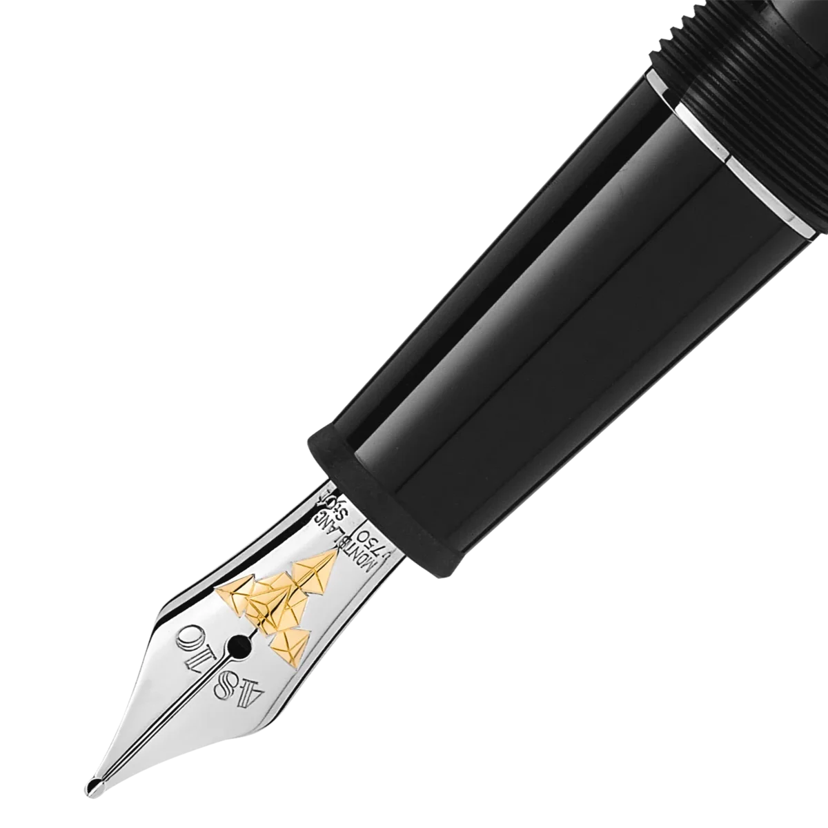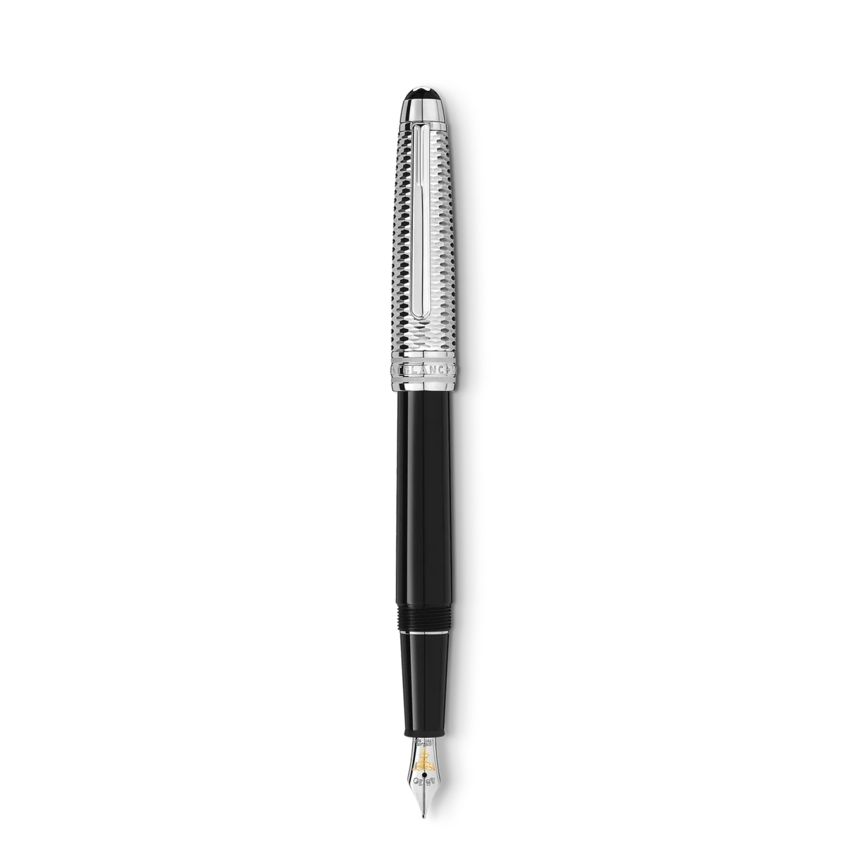 La Meisterstück Solitaire Geometric Dimension nasce dal desiderio di unire il design classico di Montblanc a materiali unici. Questo strumento da scrittura in resina nera pregiata, con cappuccio inciso con un motivo geometrico tridimensionale dall’effetto ottico in una sofisticata tonalità platino, presenta un pennino bicolore Au750 con rivestimento speciale, una clip rivestita in platino e tre anelli rivestiti in platino con il marchio Montblanc in rilievo. Rifinito con l’emblema Montblanc, esalta l’individualità di chi lo indossa.