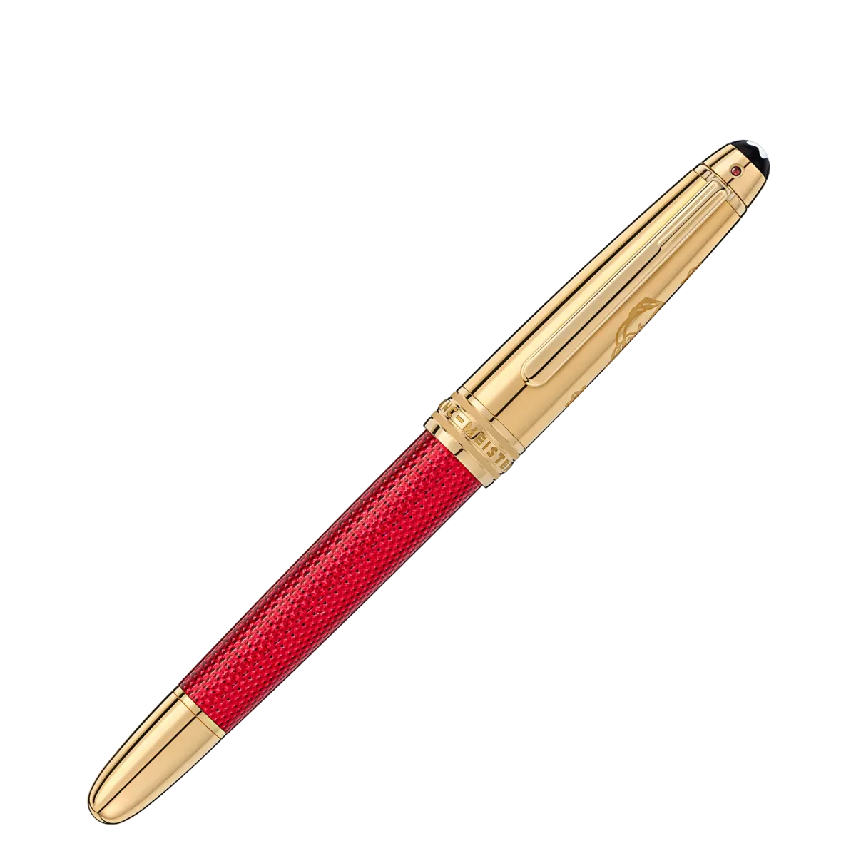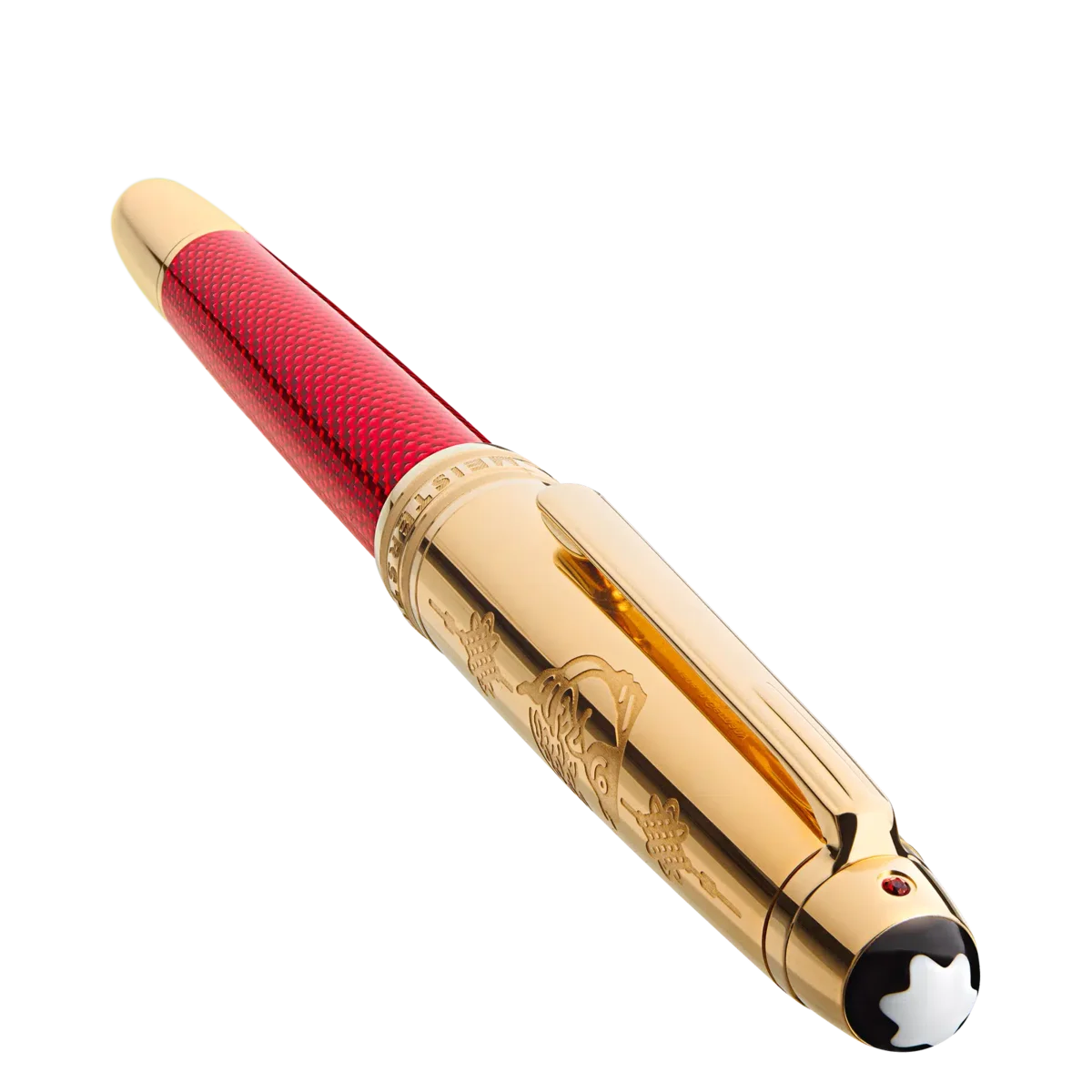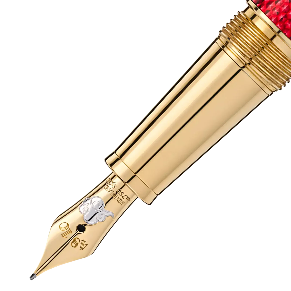La Meisterstück Solitaire Doué Red Hour è un’edizione speciale che rende omaggio ad alcuni dei più antichi simboli cinesi. Si presenta come una preziosa penna stilografica laccata di rosso con finiture placcate in oro. Il colore rosso del fusto simboleggia la fortuna e la felicità nella cultura tradizionale cinese. Il cappuccio è decorato con un motivo che combina i nodi cinesi e le carpe koi, anch’essi simboli di fortuna. La parte superiore del cappuccio è impreziosita da un rubino da 1,5 mm e il pennino in oro è decorato con “nuvole di buon auspicio” rivestite in rodio, un segno che porta fortuna, gioia e felicità.