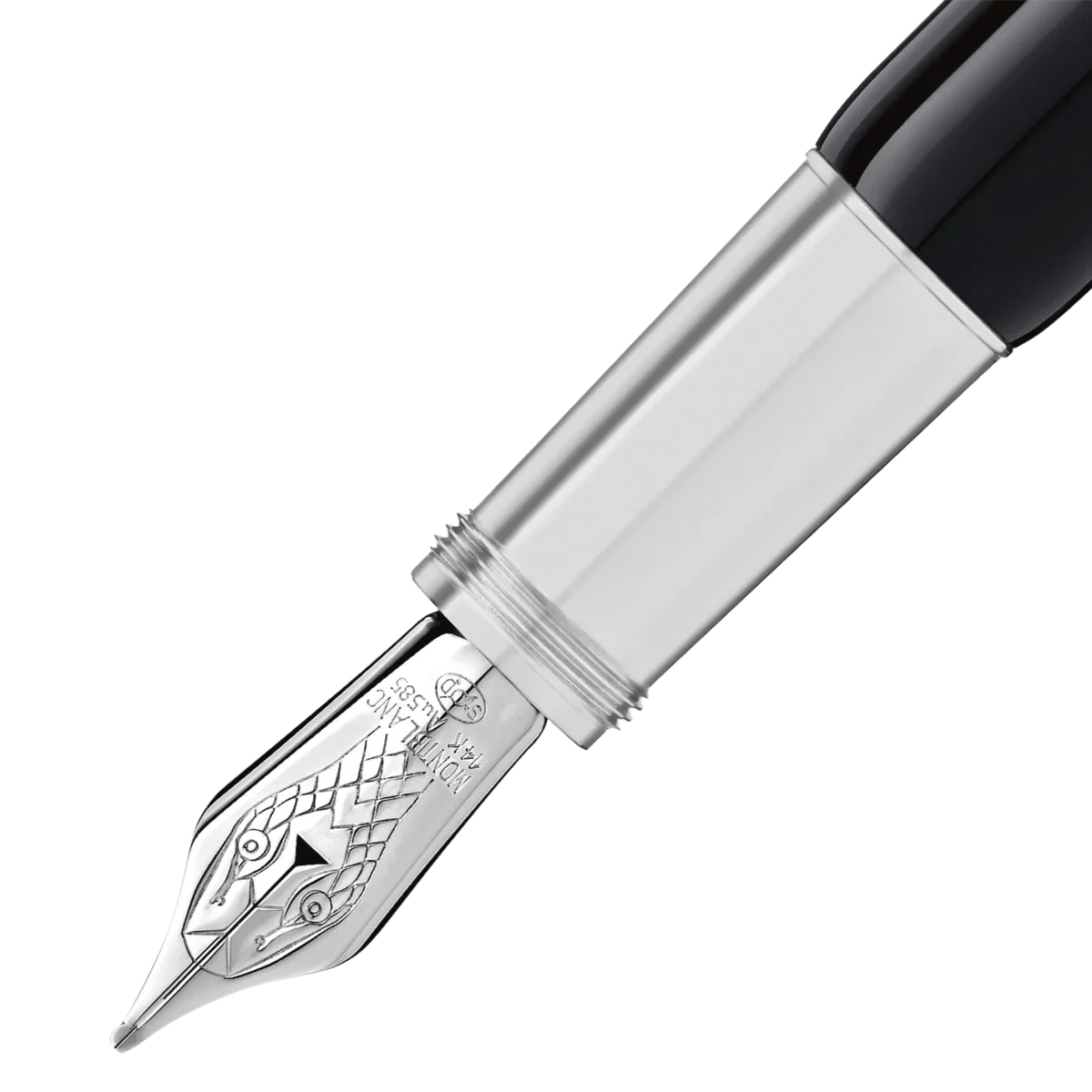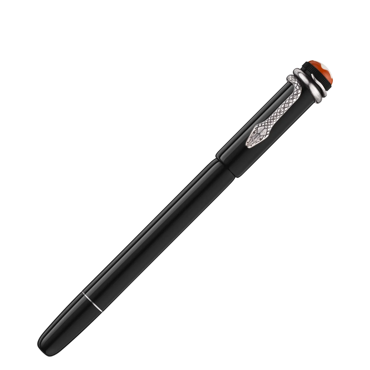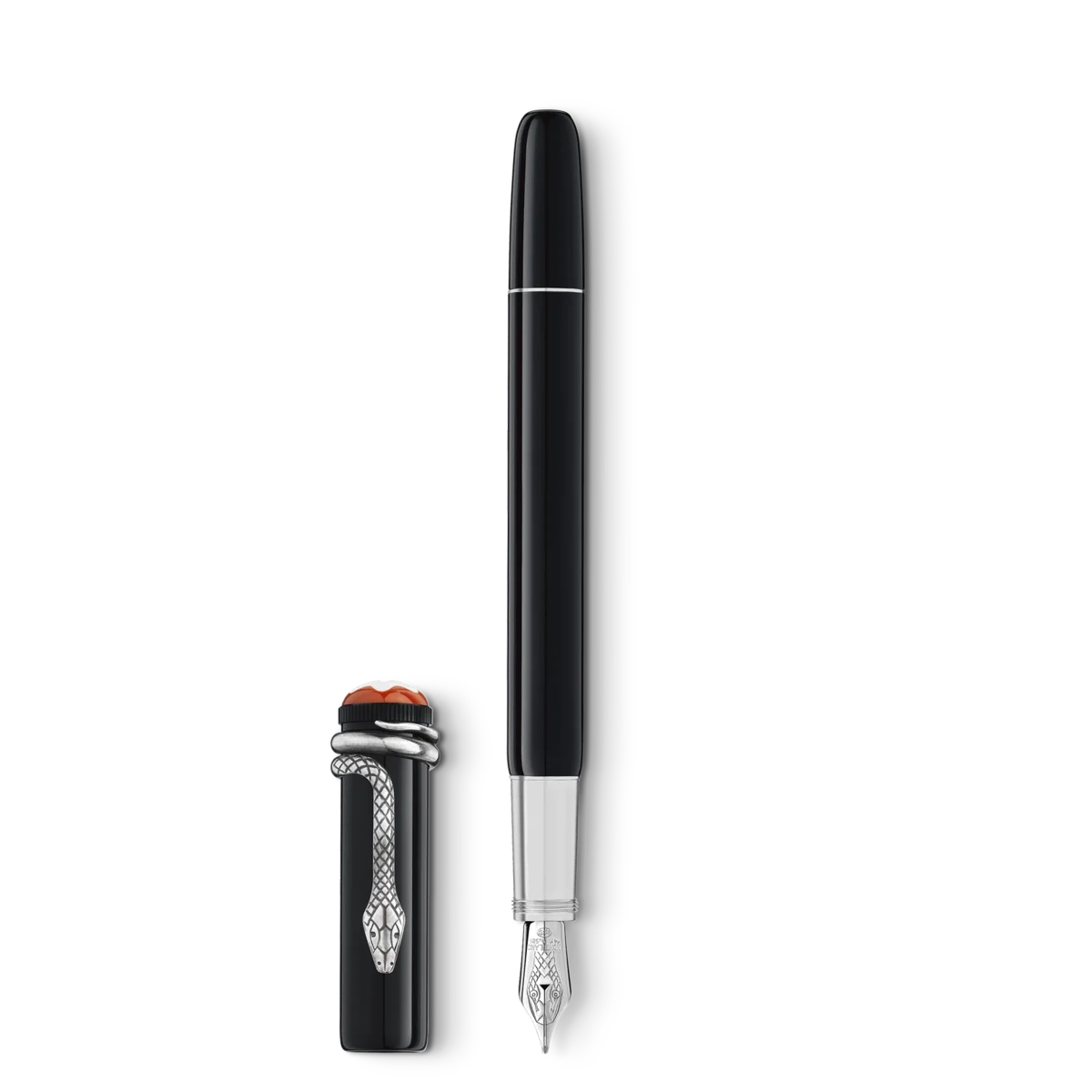 Quando fu sviluppata nel 1906, l’esclusiva penna stilografica “Rouge et Noir” era considerata un risultato tecnico eccezionale, in grado di garantire un funzionamento semplice senza la necessità di intingere il pennino nel calamaio. La Heritage Collection Rouge et Noir celebra lo spirito pionieristico di Montblanc, che dura da 110 anni. Reinterpretando il leggendario strumento di scrittura, presenta una silhouette più lunga e sottile, una moderna tecnologia di riempimento a stantuffo e una maestria artigianale affinata nel corso delle generazioni. Il fusto dell’esclusiva penna stilografica è realizzato in preziosa lacca nera abbinata a un cappuccio in preziosa resina nera. Clip Snake in look vintage con finiture abbinate. La clip è realizzata con un processo di stampaggio e avvolgimento in una lega metallica speciale ed è invecchiata con un processo galvanico e di stripping unico nel suo genere.