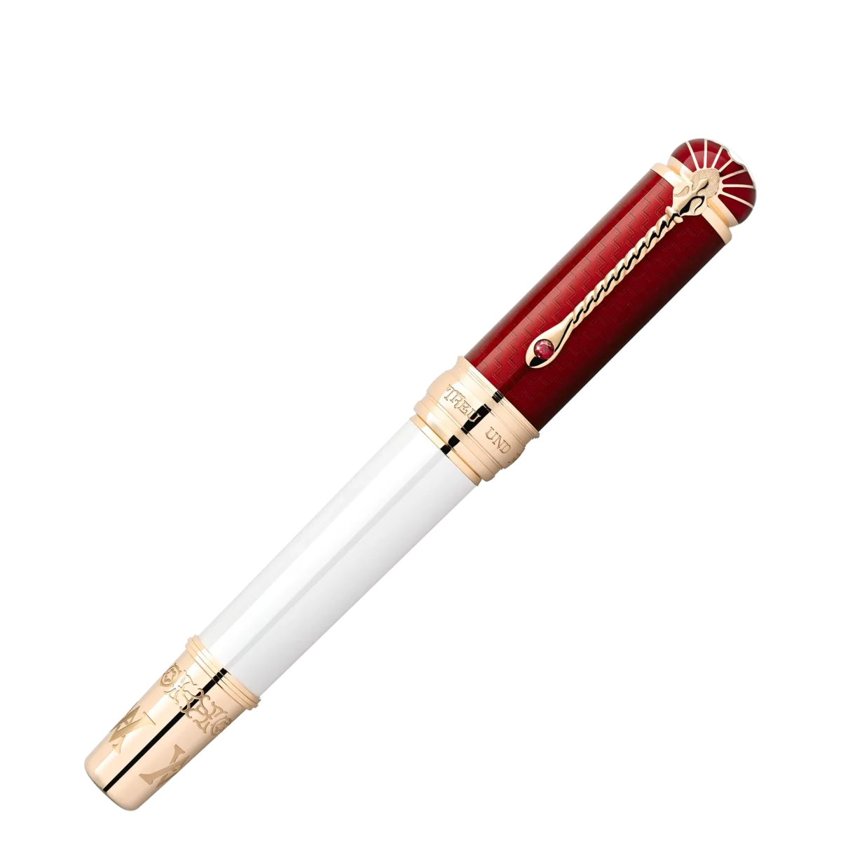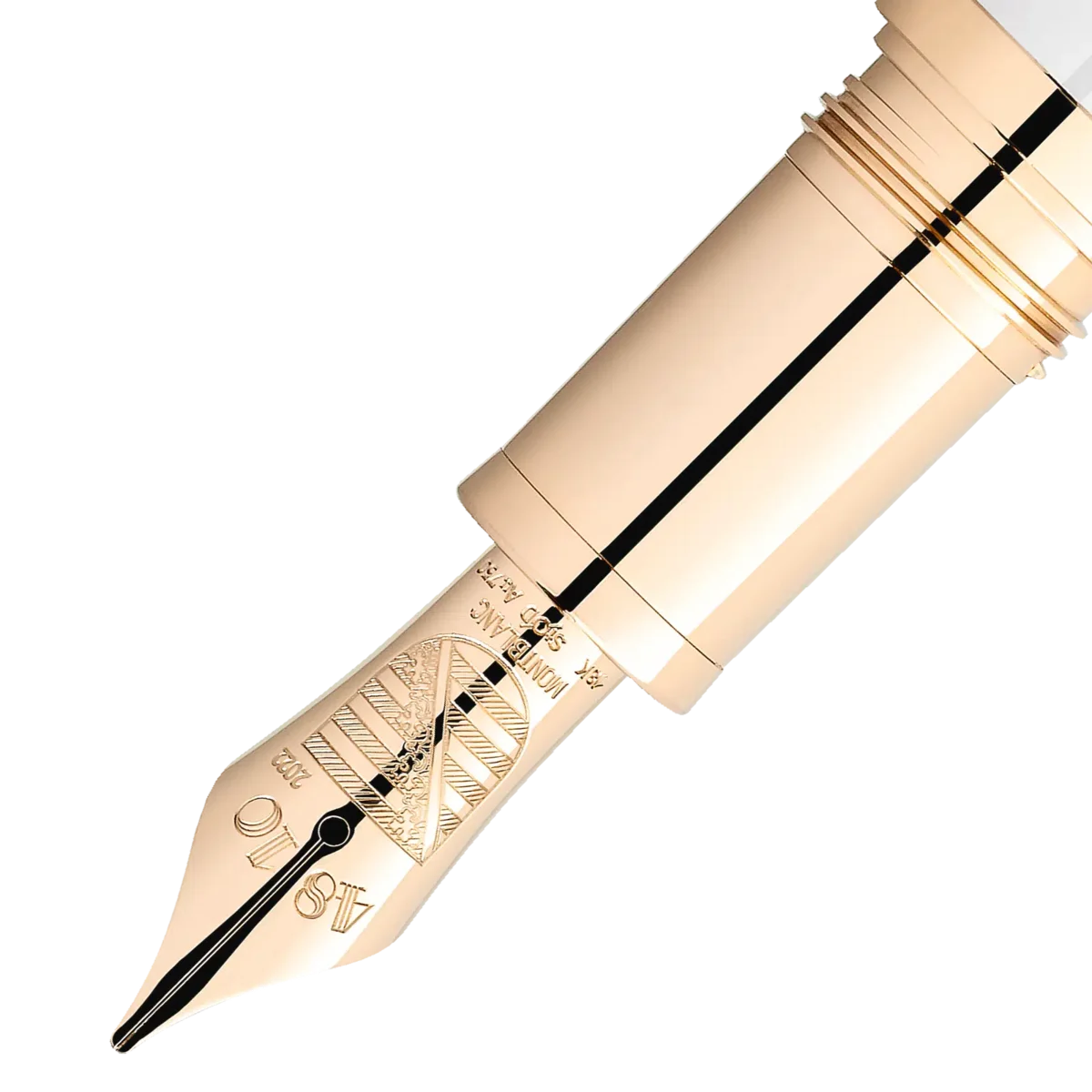 L’edizione Montblanc Patron of Art del 2022 è dedicata alla regina Vittoria e al principe Alberto. La Limited Edition 4810 è una straordinaria edizione dedicata a una coppia: una versione rende omaggio alla regina Vittoria e l’altra al suo consorte, il principe Alberto. La Montblanc Patron of Art Omaggio ad Alberto Limited Edition 4810 celebra il giovane Alberto ed è caratterizzata da un fusto laccato bianco perla e da un cappuccio in lacca traslucida color bordeaux con uno speciale motivo sul lato inferiore. Le finiture sono rivestite in oro. La forma della clip è un omaggio allo scettro della moglie ed è impreziosita da una pietra sintetica rossa. La parte superiore del cappuccio si ispira alla cupola del palazzo di cristallo ed è decorata con l’emblema Montblanc realizzato in resina preziosa bianca. Mentre l’anello del cappuccio presenta la citazione incisa “treu und fest”, una speciale incisione decora il cono. In omaggio al suo stemma personale, il pennino in oro massiccio 750 lavorato a mano reca un’incisione ispirata allo stemma della Sassonia. Con la firma in oro e/o il rivestimento in oro, Montblanc descrive la tonalità luminosa dell’oro giallo che è diventata un tono apprezzato per gli strumenti da scrittura della Maison.