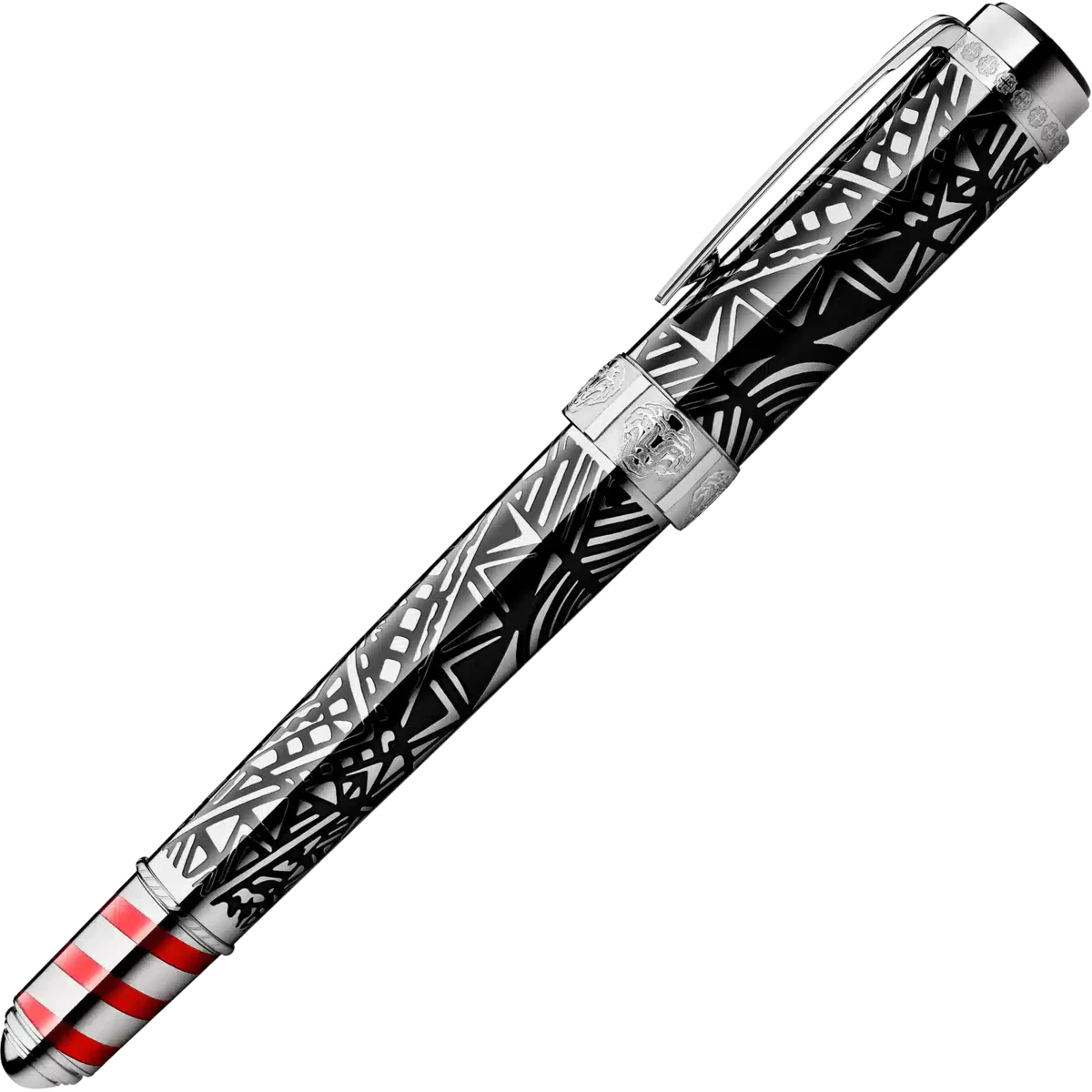 Peggy Guggenheim è stata una delle collezioniste e galleriste americane più influenti nel campo dell’arte contemporanea. Numerosi giovani artisti come Salvador Dalí, Pablo Picasso e Jackson Pollock, le cui opere Peggy Guggenheim ha esposto in Europa e in America, devono a lei i loro primi successi. Il design lineare della clip e del cappuccio, così come le linee e le forme degli intarsi in lacca nera nel cappuccio e nel fusto rivestiti in platino, si ispirano alle opere Art Déco della sua collezione. La spirale in lacca rossa sul cono rappresenta i pali di ormeggio a strisce che costeggiano i canali veneziani. Le teste di leone in rilievo sull’anello del cappuccio fanno riferimento al palazzo veneziano di Peggy Guggenheim, il Palazzo Venier dei Leoni, nonché al leone di San Marco, simbolo di Venezia.