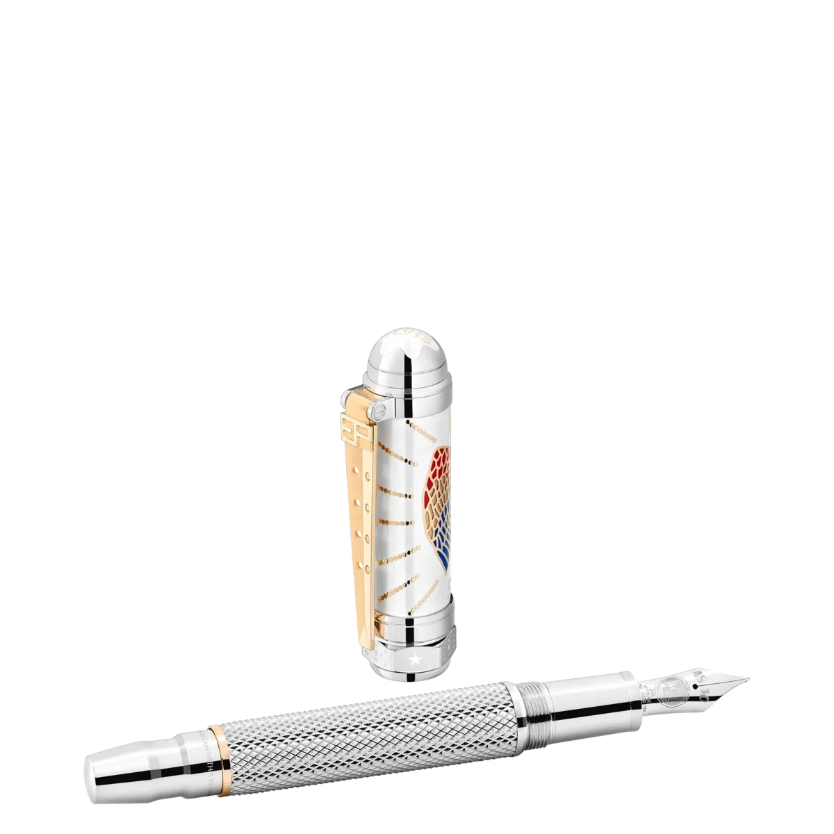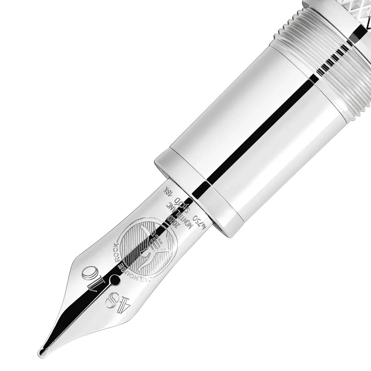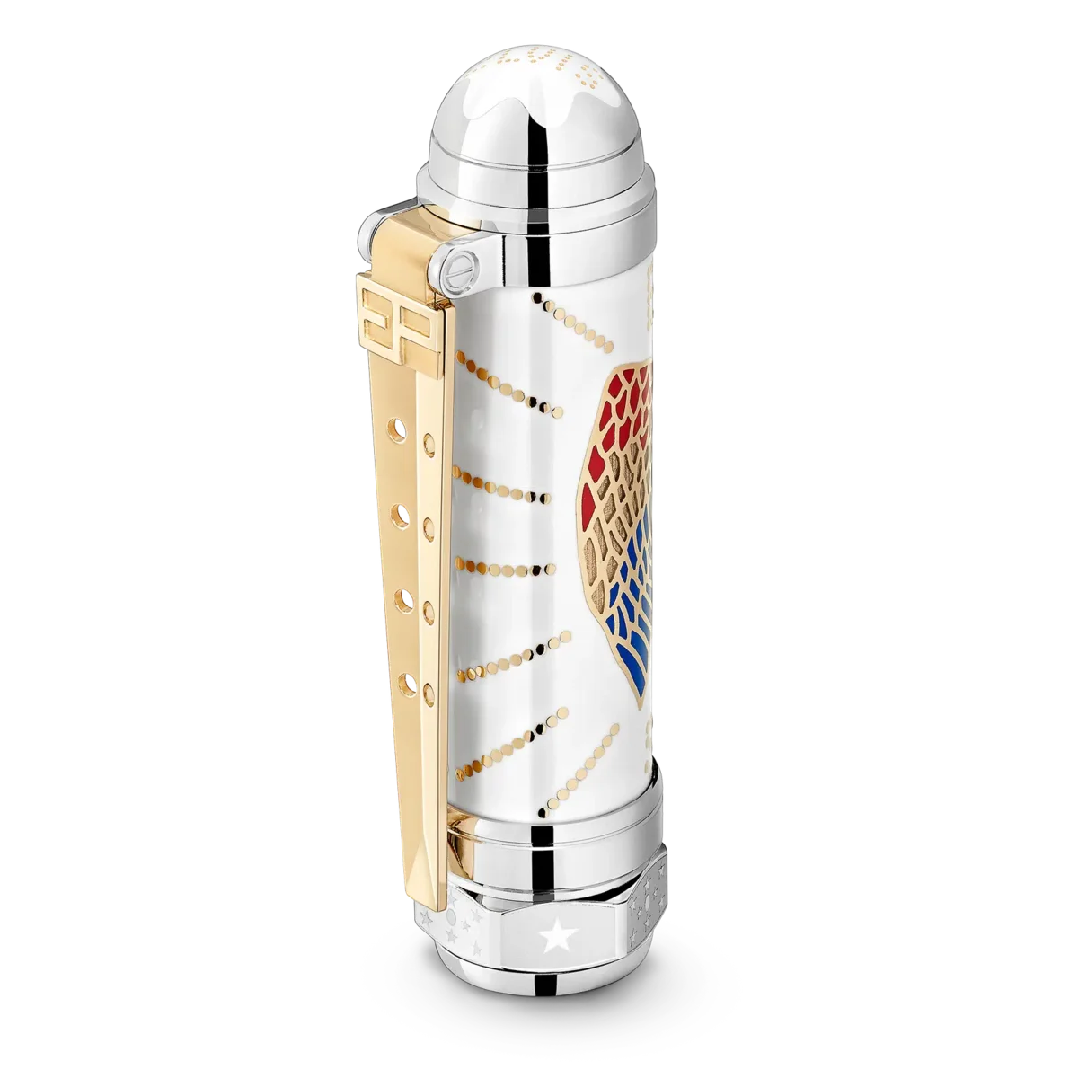 Elvis Presley è ancora considerato una delle icone culturali più significative del XX secolo, il “Re del Rock’n Roll” che ha plasmato una generazione. Nato nel 1935 a Tupelo, nel Mississippi, e trasferitosi a Memphis, nel Tennessee, Elvis Presley è diventato uno dei musicisti e attori più famosi. La forma complessiva dello strumento di scrittura ricorda quella di una candela di accensione di un motore automobilistico, ispirata all’amore di Elvis per i motori V8, così come la forma della clip rivestita in oro. Il logo “EP” deriva dai suoi caratteristici occhiali da sole. Il cappuccio presenta il logo “ELVIS” all’interno dell’emblema Montblanc laccato bianco, mentre il motivo sul cappuccio e sul fusto rivestiti in platino deriva da uno dei suoi anelli d’oro. Il suo famoso cappello di “Aloha Hawaii” è stato preso come base per la decorazione dell’aquila laccata sul cappuccio, mentre sul cono è incisa una citazione di Elvis: “L’ambizione è un sogno con un motore V8”.