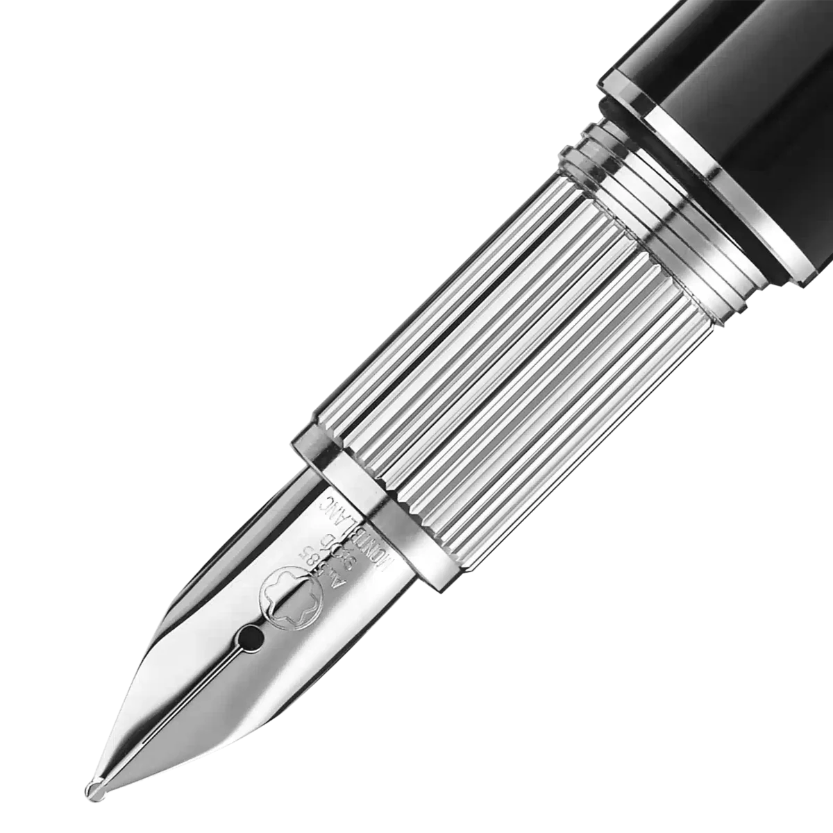 La nuova StarWalker è dedicata al viaggio tra le stelle. È dedicata all’esplorazione del cosmo e delle galassie lontane. È dedicata a una delle avventure più misteriose e affascinanti dell’umanità: l’esplorazione spaziale. Il nuovo design della collezione celebra l’immensa emozione, descritta da tutti i viaggiatori spaziali, di vedere il nostro pianeta blu fluttuare nella vastità dello spazio. La tecnologia dell’emblema StarWalker presenta una cupola blu traslucida sotto l’emblema Montblanc, che ricorda la Terra che emerge sopra l’orizzonte lunare. La StarWalker Doué è dotata di cappuccio e finiture rivestiti in platino e corpo in resina nera pregiata. La penna stilografica è realizzata a mano con pennino in oro Au585 /14 K rivestito in rodio.