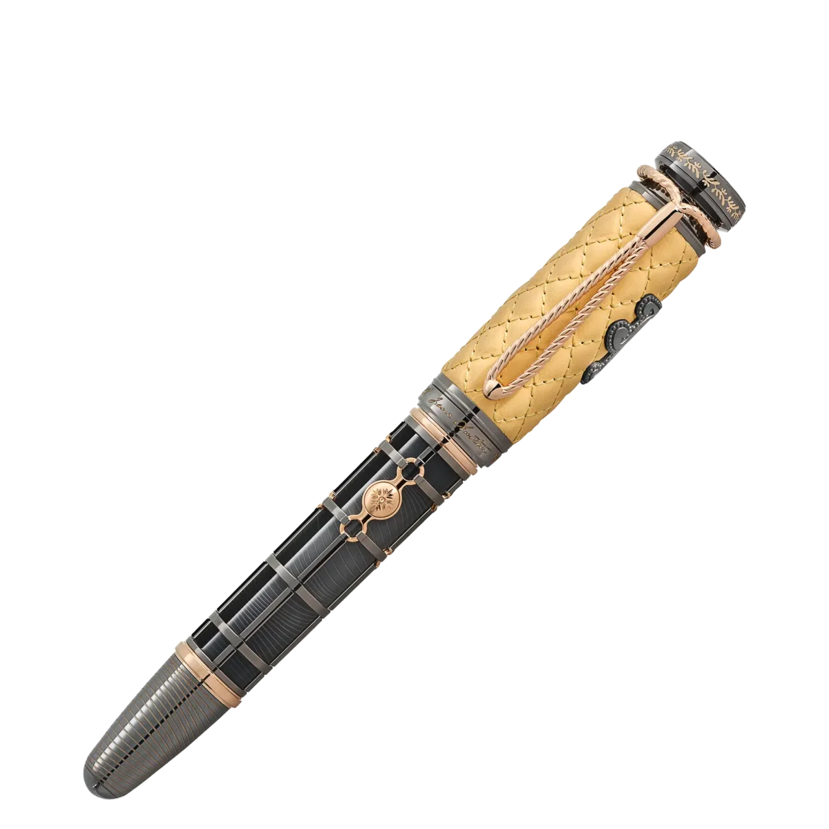 Pochi autori nella storia della letteratura hanno avuto la capacità di creare dialoghi e dare vita ai personaggi in modo così elegante, ironico e astuto come la scrittrice britannica Jane Austen. Montblanc ha creato la Writers Edition Homage to Jane Austen per celebrare una delle autrici più famose della letteratura inglese. Un elemento chiave nell’opera di Jane Austen è l’esperienza del viaggio, poiché i viaggi e le escursioni spesso fungono nelle sue narrazioni da catalizzatori sia per incontri romantici che per turbamenti interiori. Ispirandosi alle carrozze trainate da cavalli dell’epoca, il rivestimento scheletrato in oro massiccio Au 750 rivestito in rutenio del fusto ricorda una bardatura, mentre il motivo ondulato della lacca degradé sottostante suggerisce la criniera fluttuante di un cavallo. A completamento del barilotto, il cappuccio è realizzato in pelle di vacchetta inglese gialla goffrata, ispirata agli interni delle eleganti carrozze da viaggio. È impreziosito da un intarsio in oro massiccio Au 750 rivestito in rutenio con le iniziali di Jane Austen, come quelle incise sul portalettere intagliato per lei dal fratello. In onore del romanzo Orgoglio e pregiudizio, l’anello del cappuccio in oro massiccio Au 750 rivestito in rutenio reca incisi i numeri romani LVI. Questo numero indica il capitolo 56 di Orgoglio e pregiudizio, in cui Lady Catherine de Bourgh si affretta in carrozza a far visita alla signorina Bennet per “chiarire le cose” e soffocare ogni speranza di matrimonio.Il suo stile di scrittura si rivelò popolare e le prime edizioni delle sue opere andarono rapidamente esaurite, ma nessuno al di fuori della sua famiglia sapeva che fosse lei l’autrice.Il frontespizio del suo romanzo Ragione e sentimento, pubblicato nel 1811, dichiarava semplicemente che l’opera era stata scritta “Da una signora”. Questa dichiarazione di paternità dell’opera adorna la parte superiore del cappuccio della Writers Edition Homage to Jane Austen Limited Edition 97, insieme al solido emblema Montblanc in oro Au 750. La silhouette dello strumento di scrittura ricorda un sigillo di cera, simile a quello che avrebbe usato Jane Austen. La clip placcata in oro della Writers Edition Homage to Jane Austen Limited Edition 97 è insolita quanto il suo cappuccio. A forma di cordoncino intrecciato con chiusura a coulisse, ricorda una borsetta (reticule) usata per trasportare cipria, uno specchio e l’indispensabile fazzoletto da taschino. L’unica silhouette conosciuta di Jane Austen, che ne mostra i lineamenti delicati, è immortalata come incisione artistica sul pennino bicolore in oro massiccio Au 750 realizzato a mano. La parte anteriore in oro massiccio Au 750 e le finiture aggiungono il tocco finale al design. Limitato a soli 97 esemplari, in omaggio all’anno di pubblicazione originale di Orgoglio e pregiudizio, il 1797.