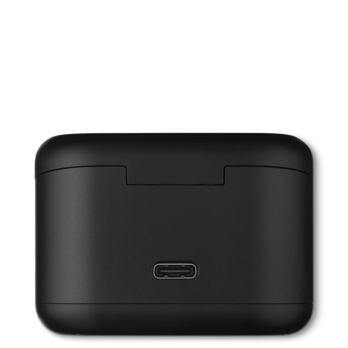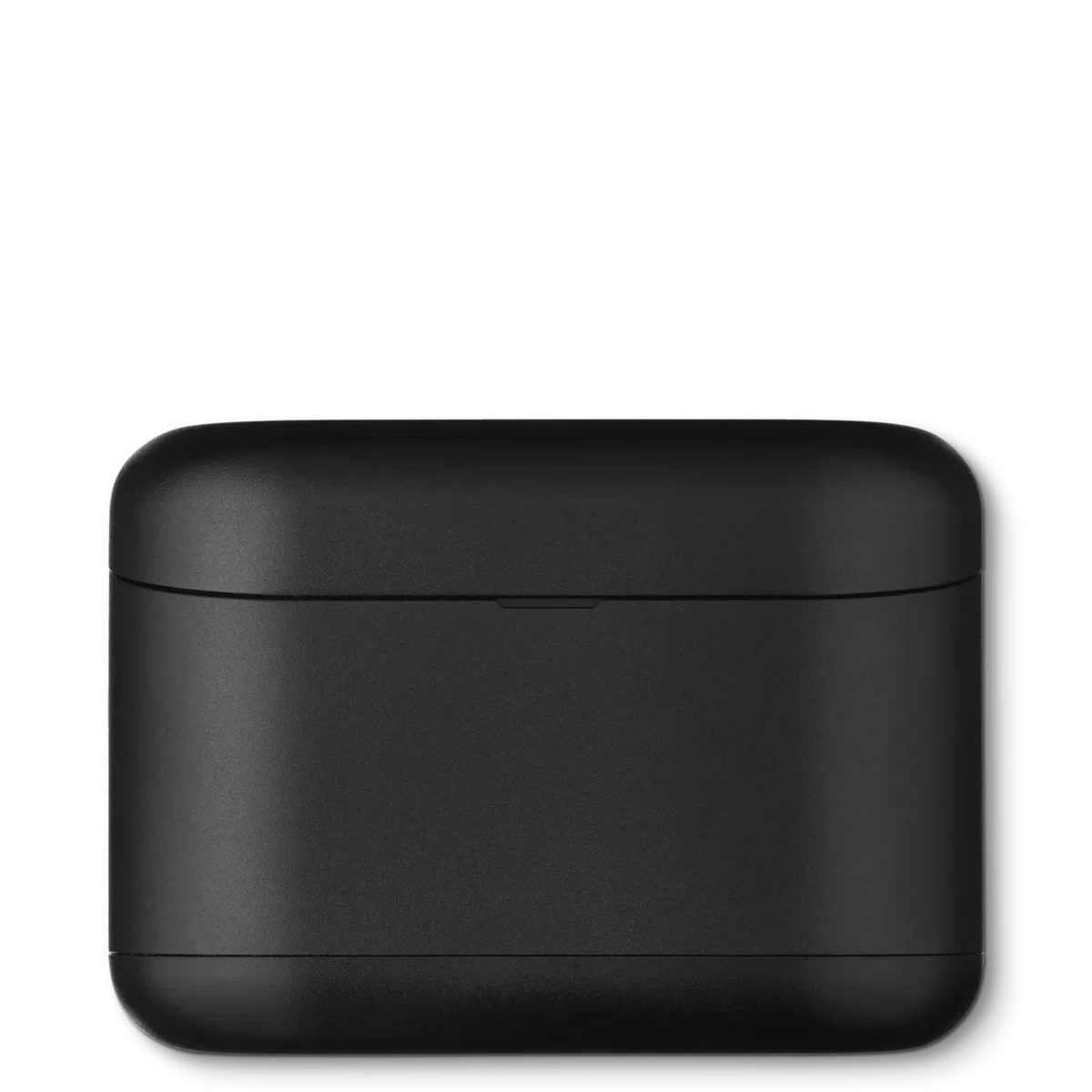 Custodia di ricarica nera per cuffie intrauricolari Montblanc MTB 03. La custodia è compatibile con la ricarica wireless.