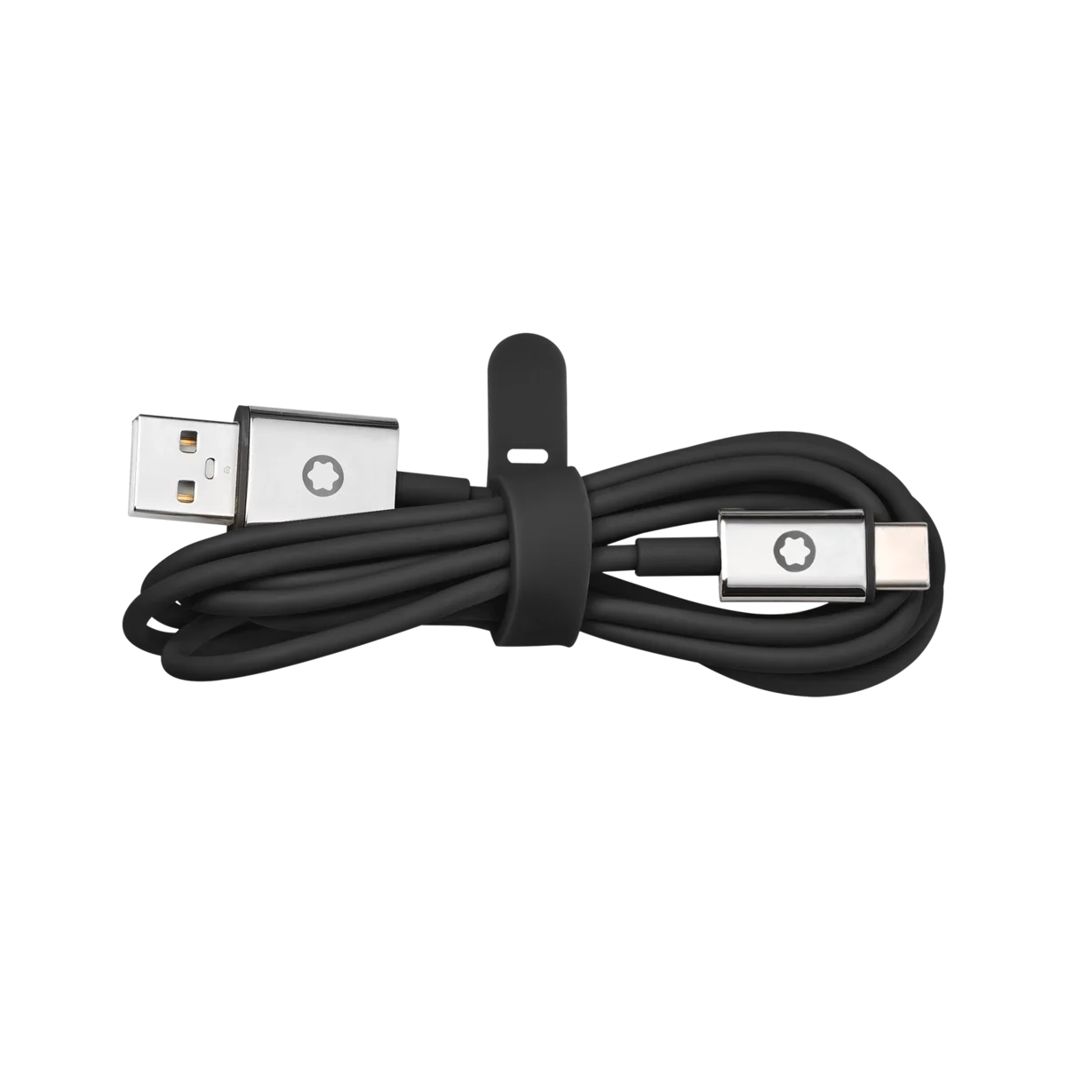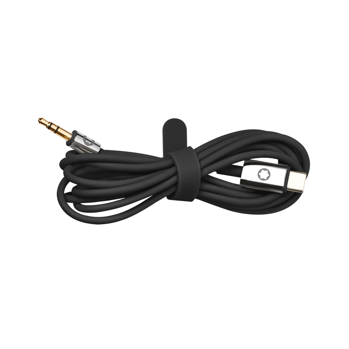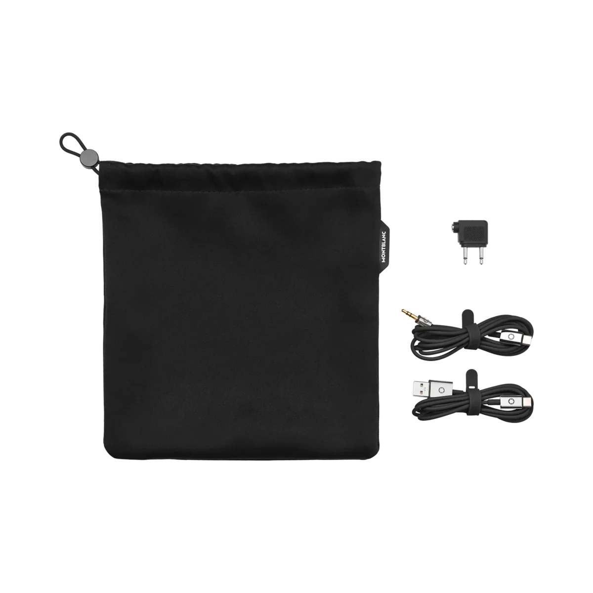 Set da viaggio aggiuntivo per le cuffie Montblanc MB 01 contenente una custodia nera, un cavo di ricarica USB-C nero, un cavo audio nero e un adattatore da viaggio nero.