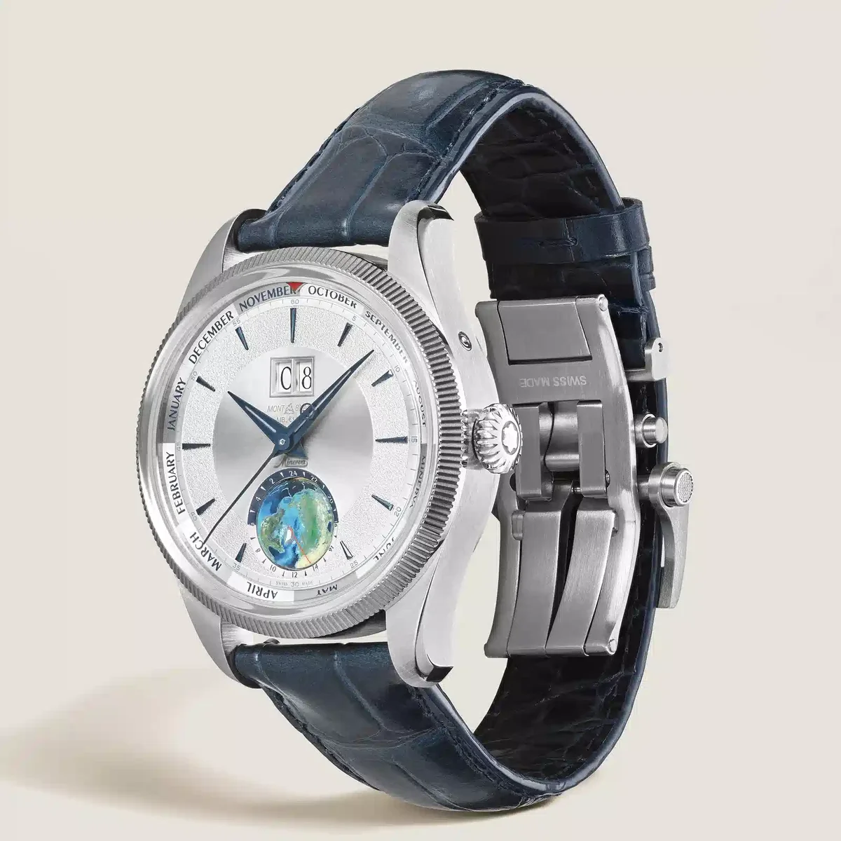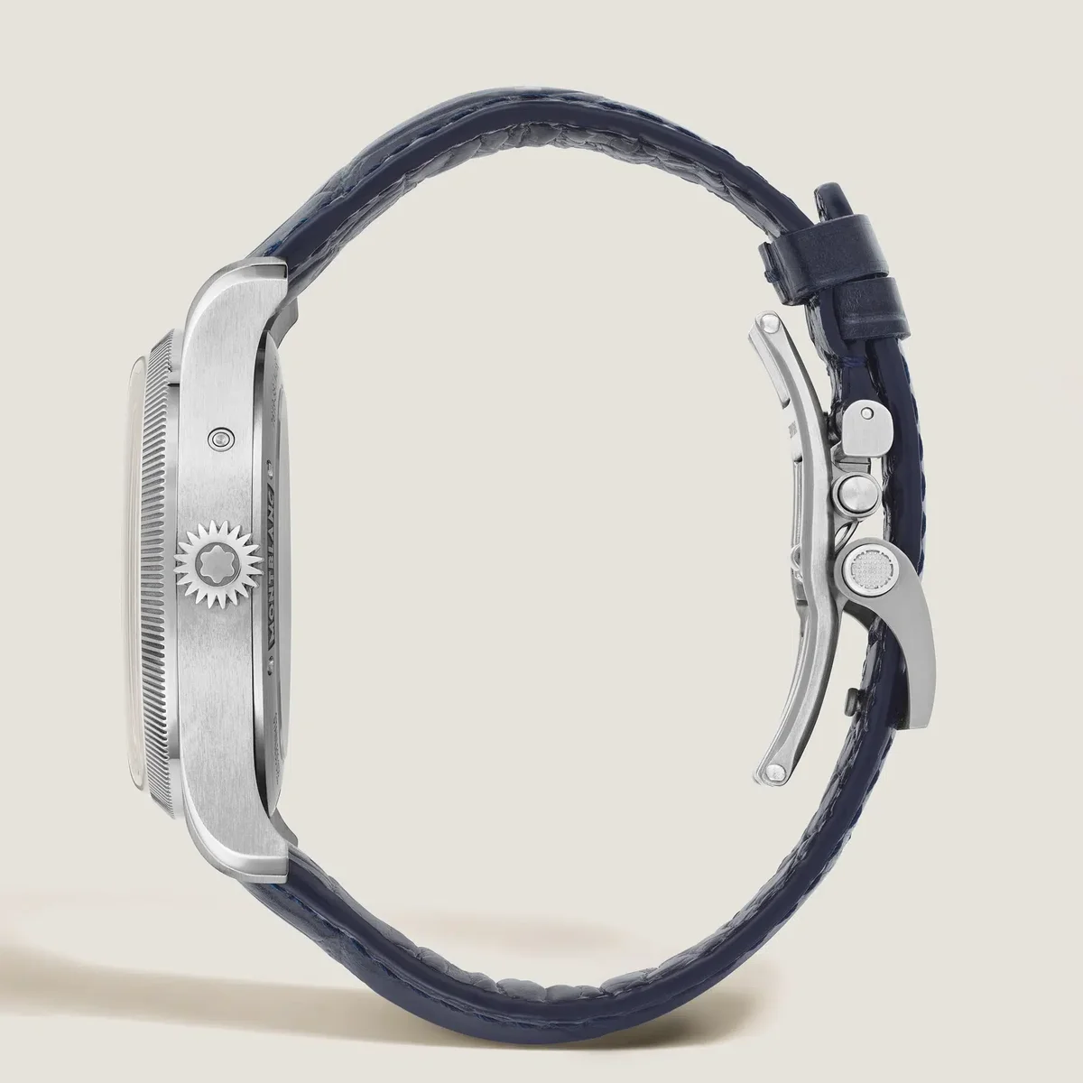 Il Montblanc 1858 Annual Calendar Geosphere Limited Edition si ispira ai codici estetici del patrimonio Minerva degli anni ’50 con il suo quadrante color argento-bianco con raggi di sole e grana, con lancette e indici rivestiti di blu. La cassa in acciaio inossidabile da 42 mm è dotata di una lunetta fissa scanalata in oro bianco 750/1000 (18 carati) ispirata agli storici orologi Minerva. L’orologio è animato dal calibro MB M14.58 di manifattura, rifinito a mano e a carica manuale, dotato di calendario annuale, datario grande e funzione worldtimer. Per le funzioni del calendario annuale, il datario grande è posizionato a ore 12 e presenta due grandi finestre affiancate, mentre i mesi sono visualizzati lungo la periferia del quadrante. Il punto focale visivo di questo orologio è senza dubbio il globo rotante tridimensionale dipinto a mano che raffigura l’emisfero settentrionale con indicazione del giorno e della notte e scala delle 24 ore. L’orologio è completato da un cinturino intercambiabile in pelle di vitello blu con stampa alligatore e una fibbia tripla pieghevole in acciaio inossidabile con sistema di regolazione fine.