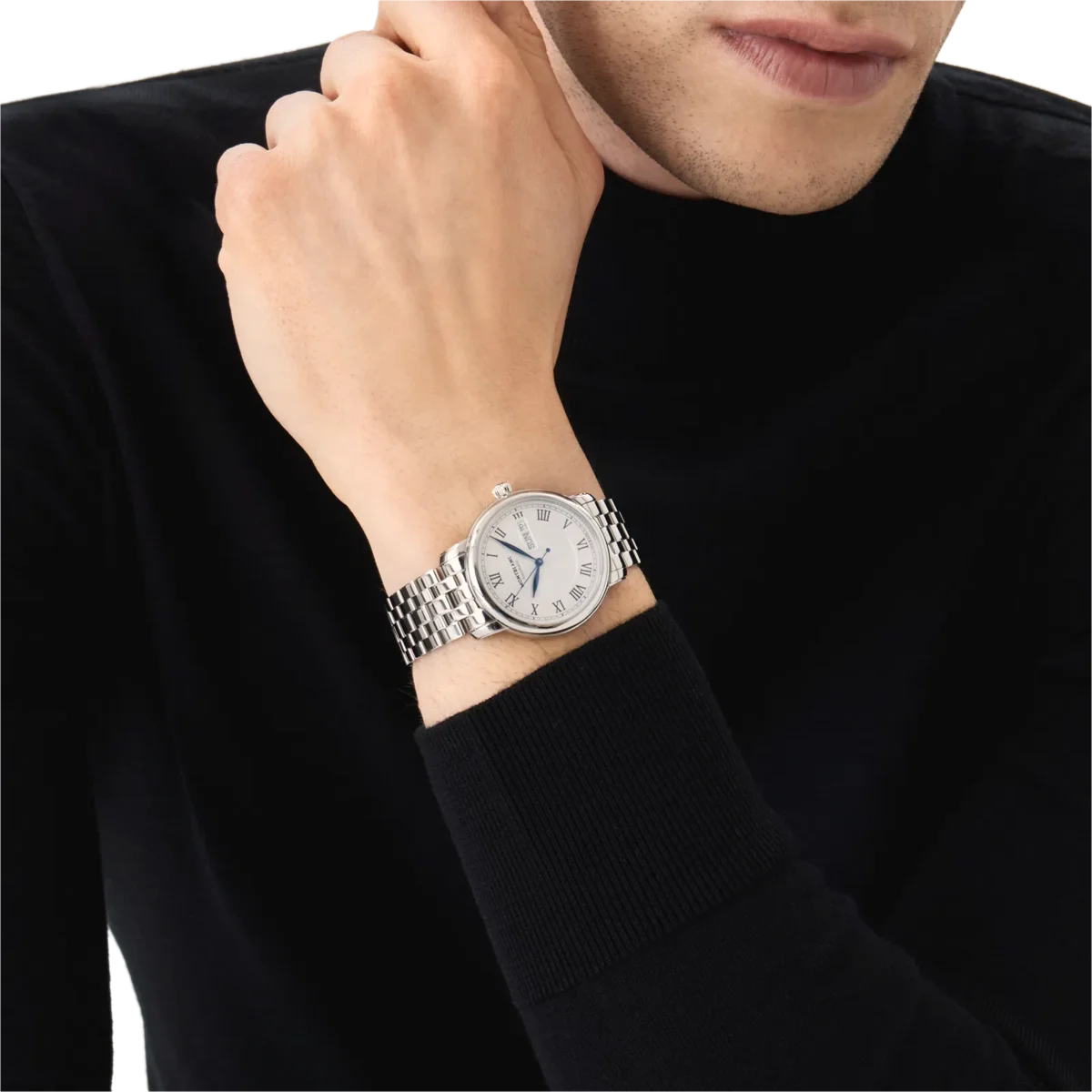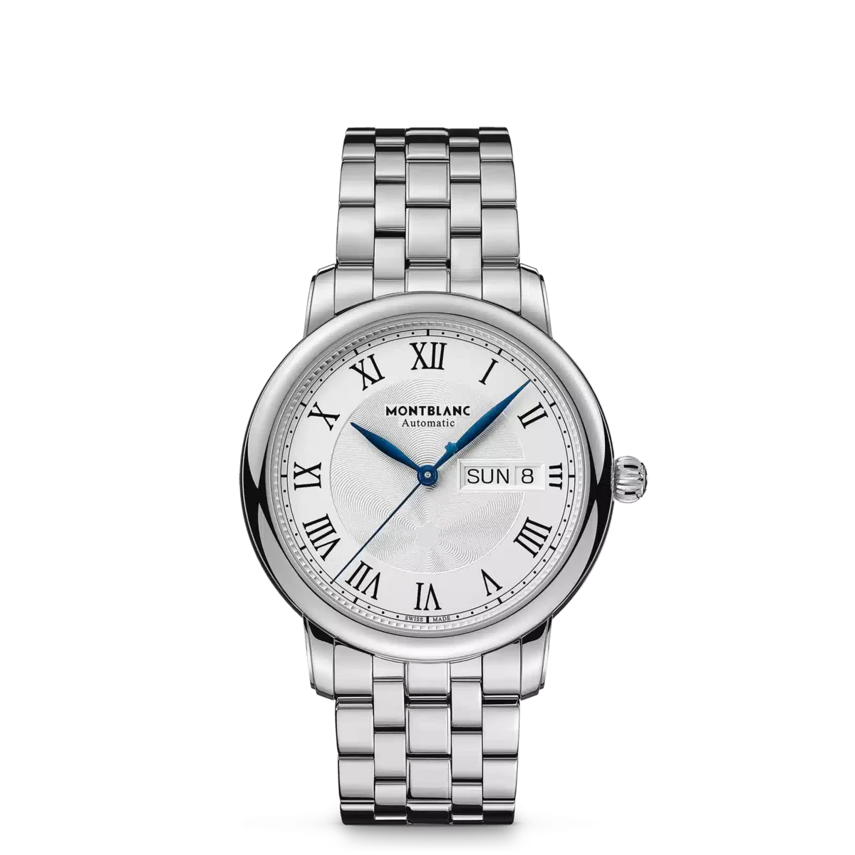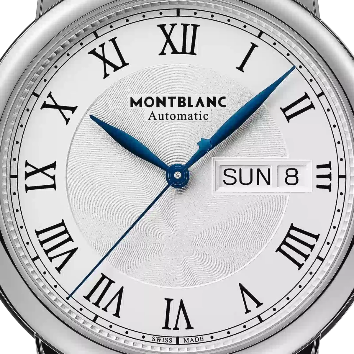 La collezione Montblanc Star Legacy trae ispirazione dal patrimonio di Minerva e dagli orologi da tasca realizzati dall’azienda tra la fine del XIX e l’inizio del XX secolo.In linea con i codici di design della linea di prodotti, il Montblanc Star Legacy Automatic Day & Date presenta un raffinato quadrante bianco-argento con motivo guilloché a stella esplosiva Montblanc, numeri arabi, lancette a forma di foglia, motivo guilloché “filet sauté” e scala ferroviaria. L’orologio è dotato del calibro automatico MB 24.28 e presenta le ore, i minuti e i secondi al centro e il giorno e la data in un’apertura a ore tre. È disponibile con cassa in acciaio inossidabile da 39 mm e bracciale in acciaio inossidabile.